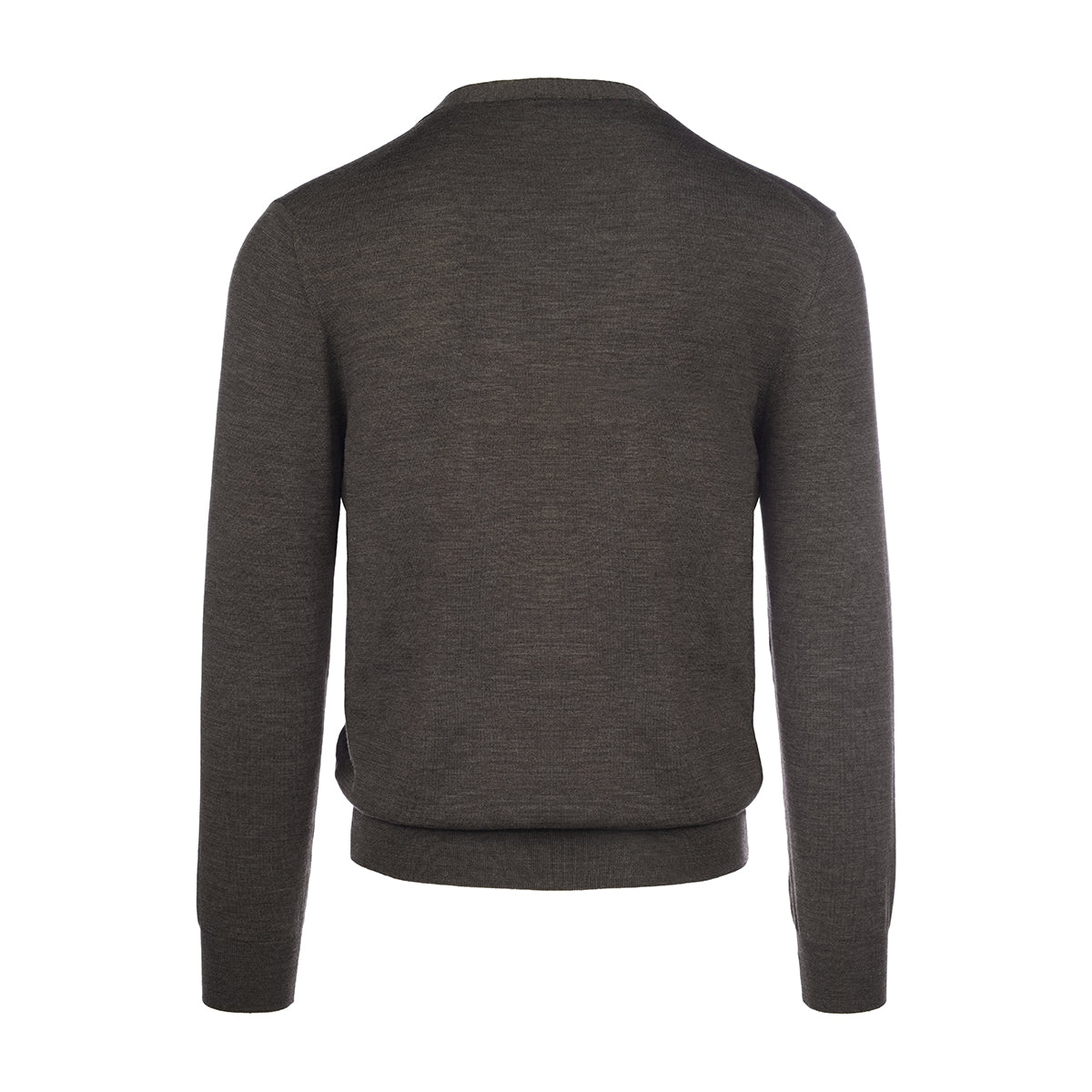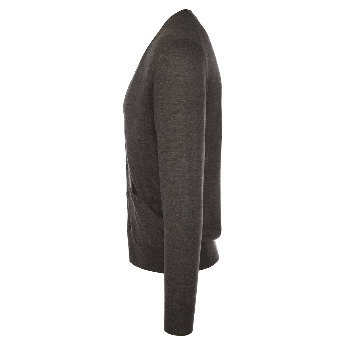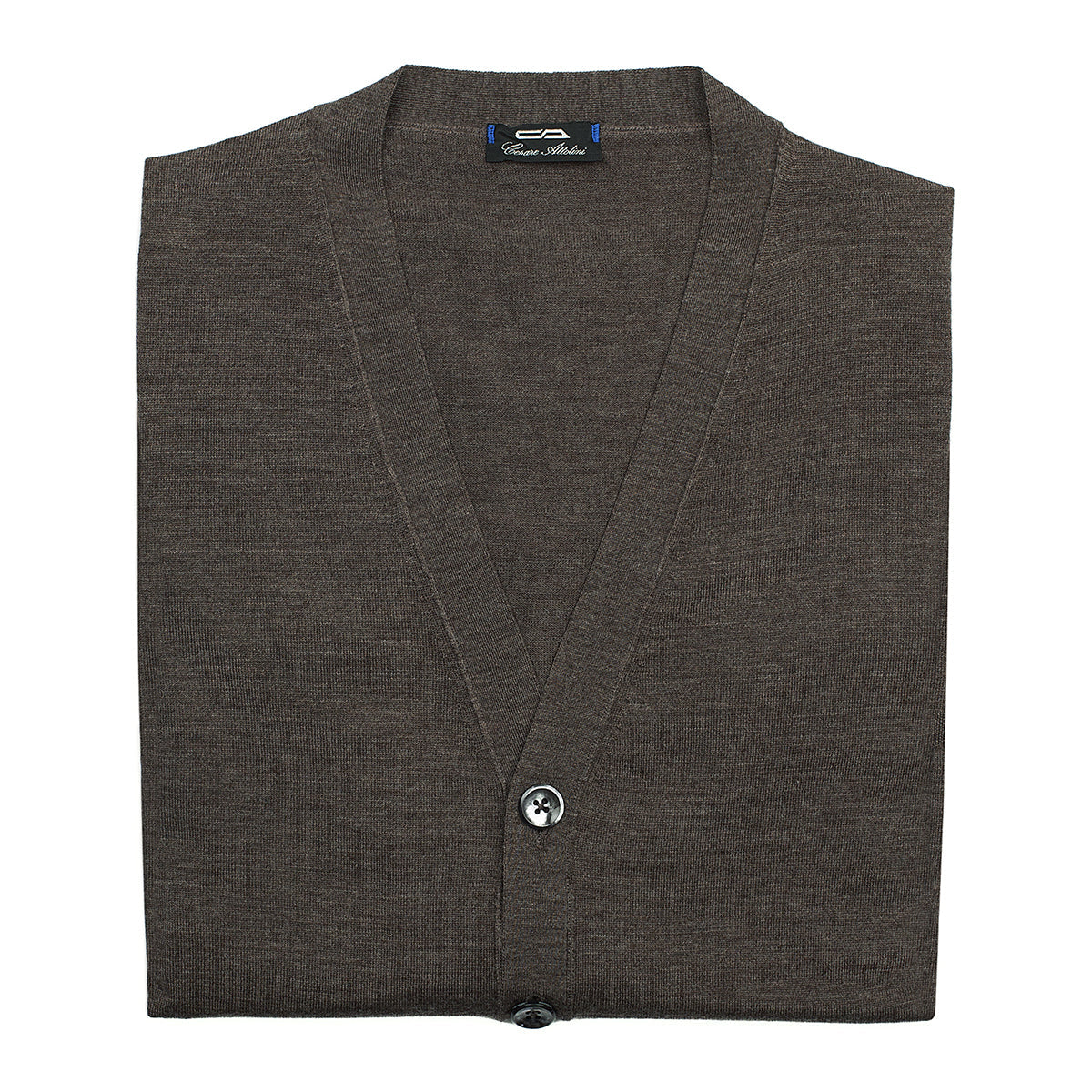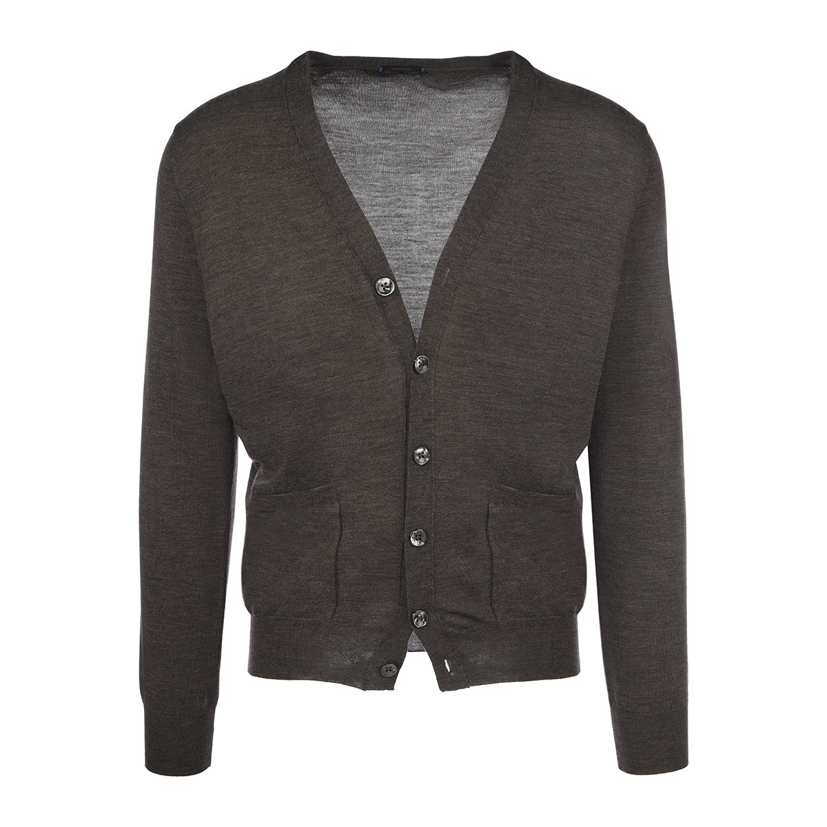 Gianduia 140'S wool buttoned cardigan with two pockets. Made in our artisan workshop on the shores of Lake Trasimeno. It is ideal for creating a leisure look while ensuring comfort.