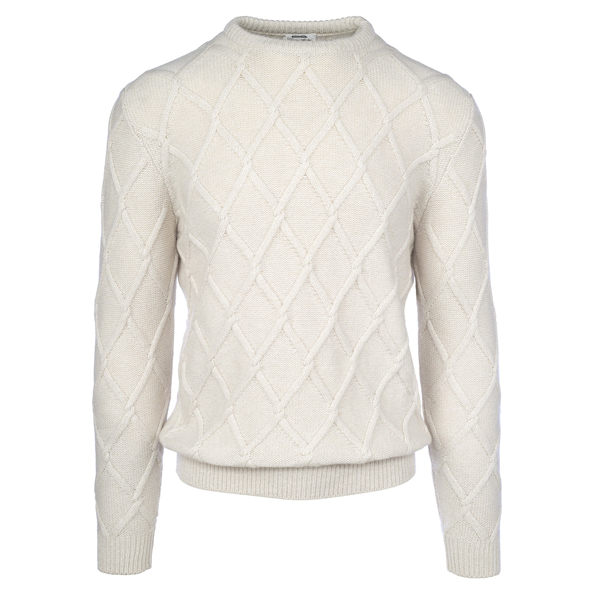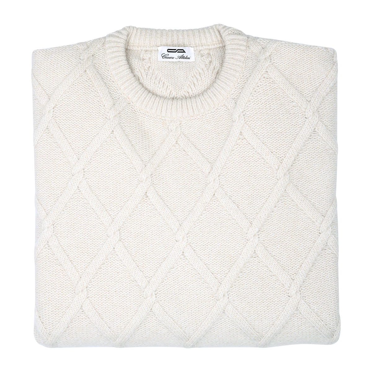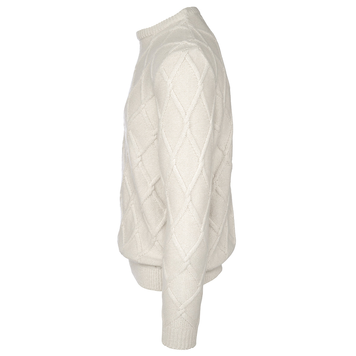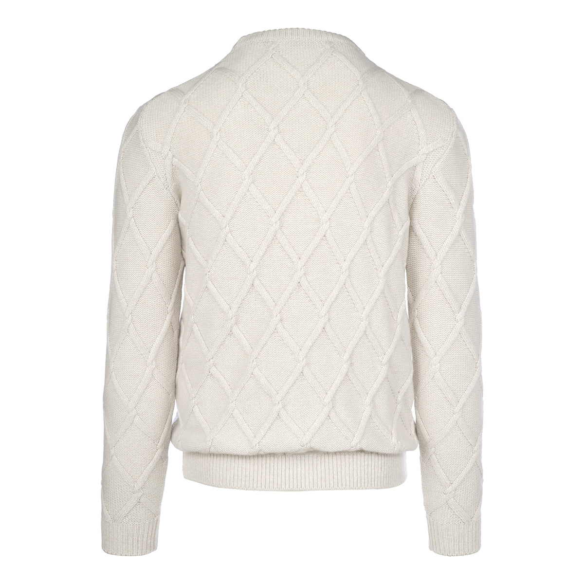 White cross-stitch cashmere crewneck with ribbed collar, cuffs and flounce. Made in our artisan workshop on the shores of Lake Trasimeno. The precious pure cashmere yarn and the exclusive processing make it unique.