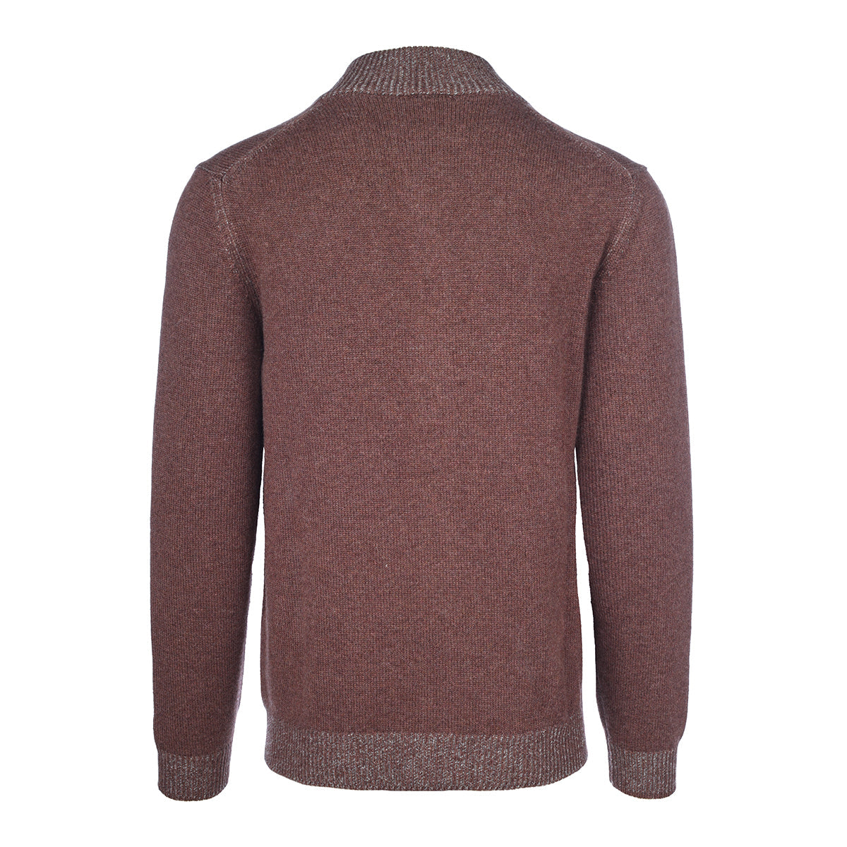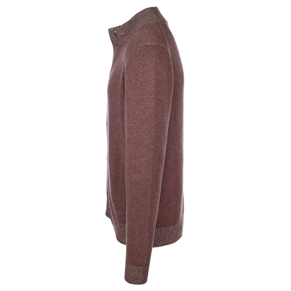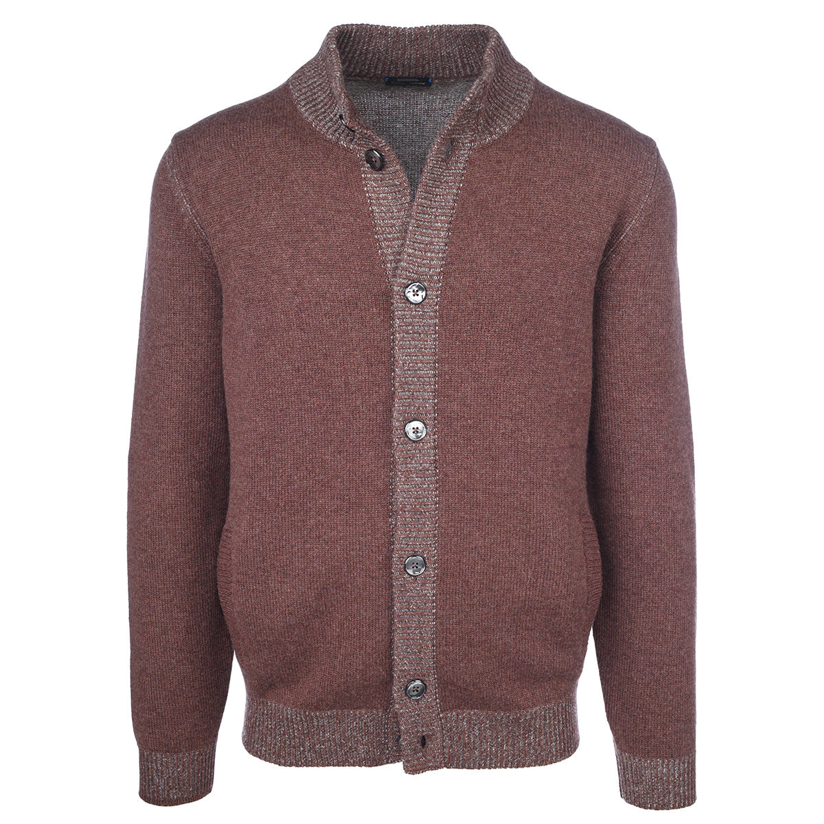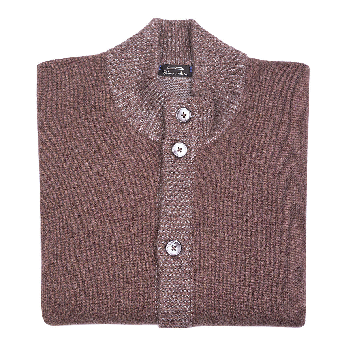 Light brown cardigan with buttons in cashmere and two pockets. Ribs at the neck, cuffs and flounce. Made in our artisan workshop on the shores of Lake Trasimeno. The precious pure cashmere yarn makes it soft and comfortable.