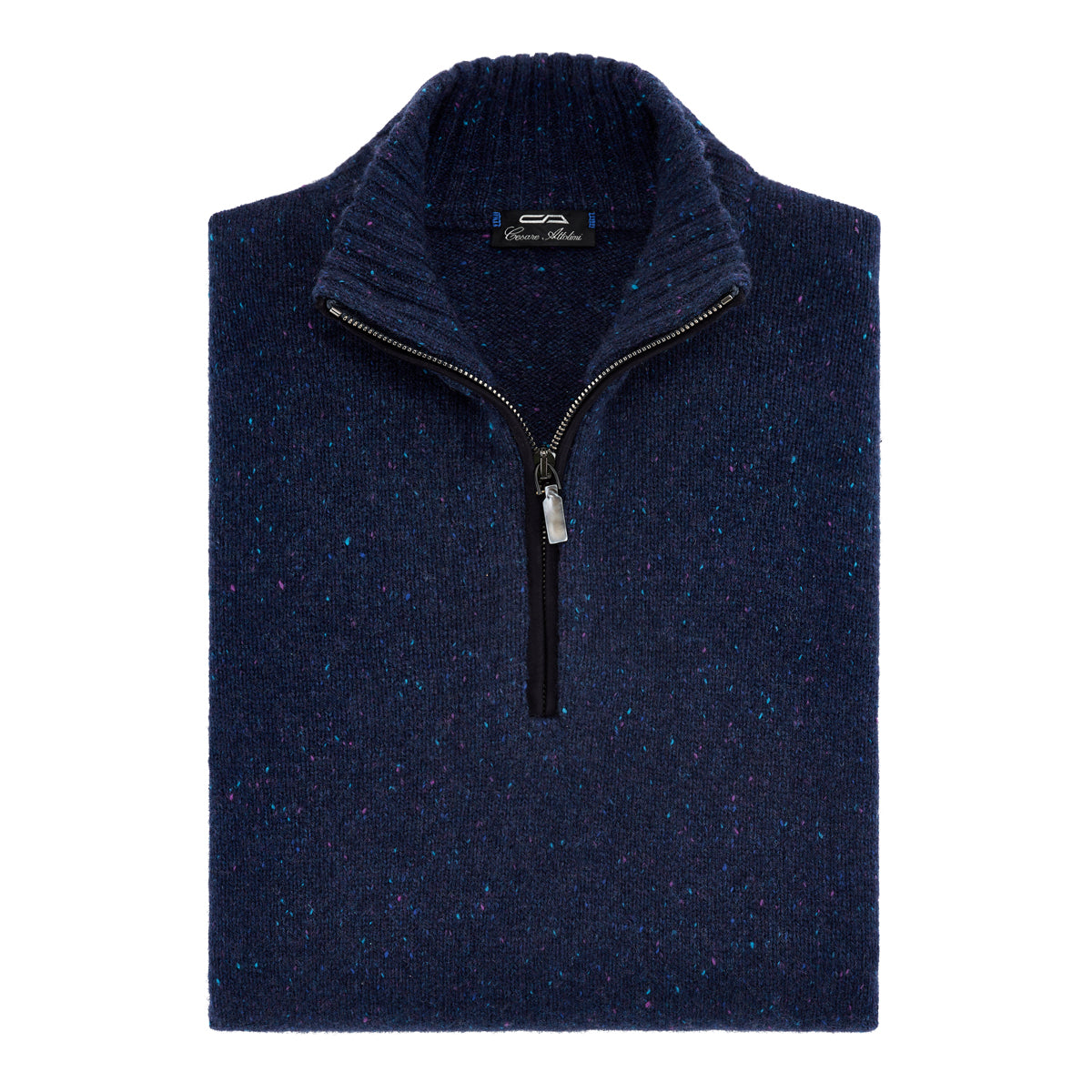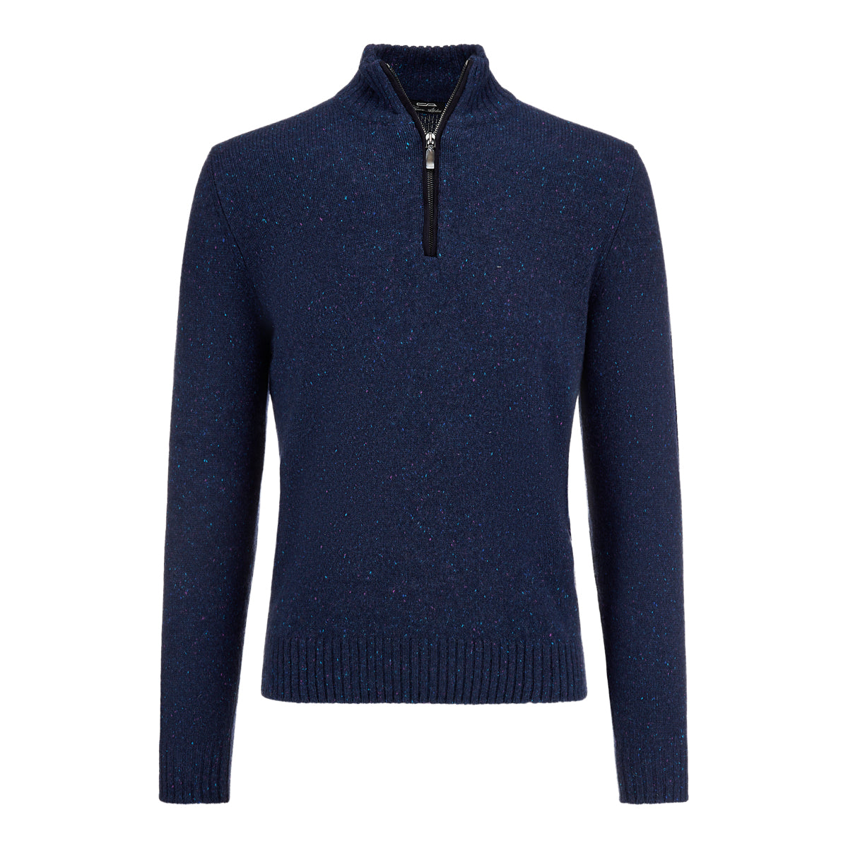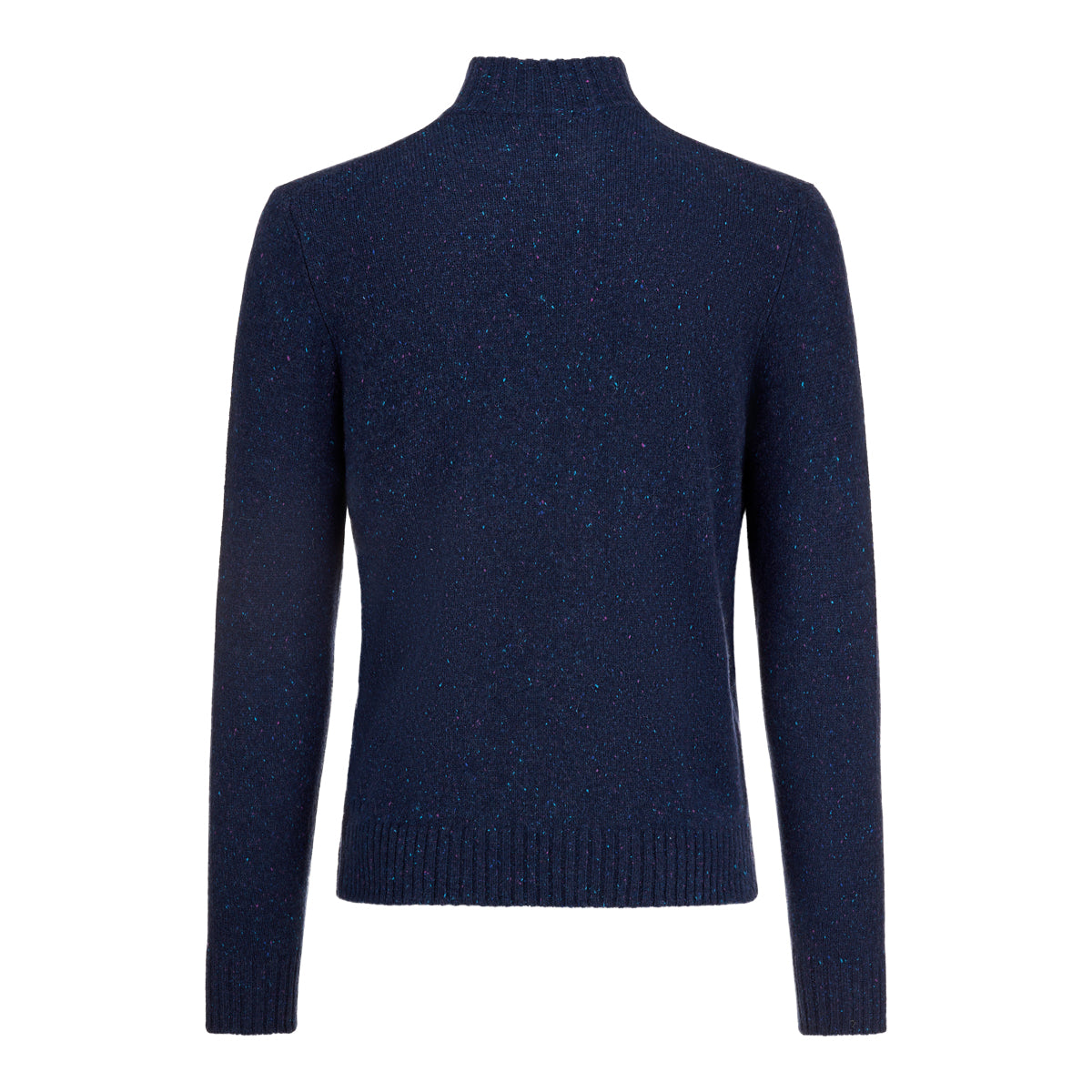 Blue Donegal print half zip sweater in navy/turquoise/pink accents color. Grey mother of pearl pulls tab and suede trim detail on zipper. Ribbed neckline and cuffs.