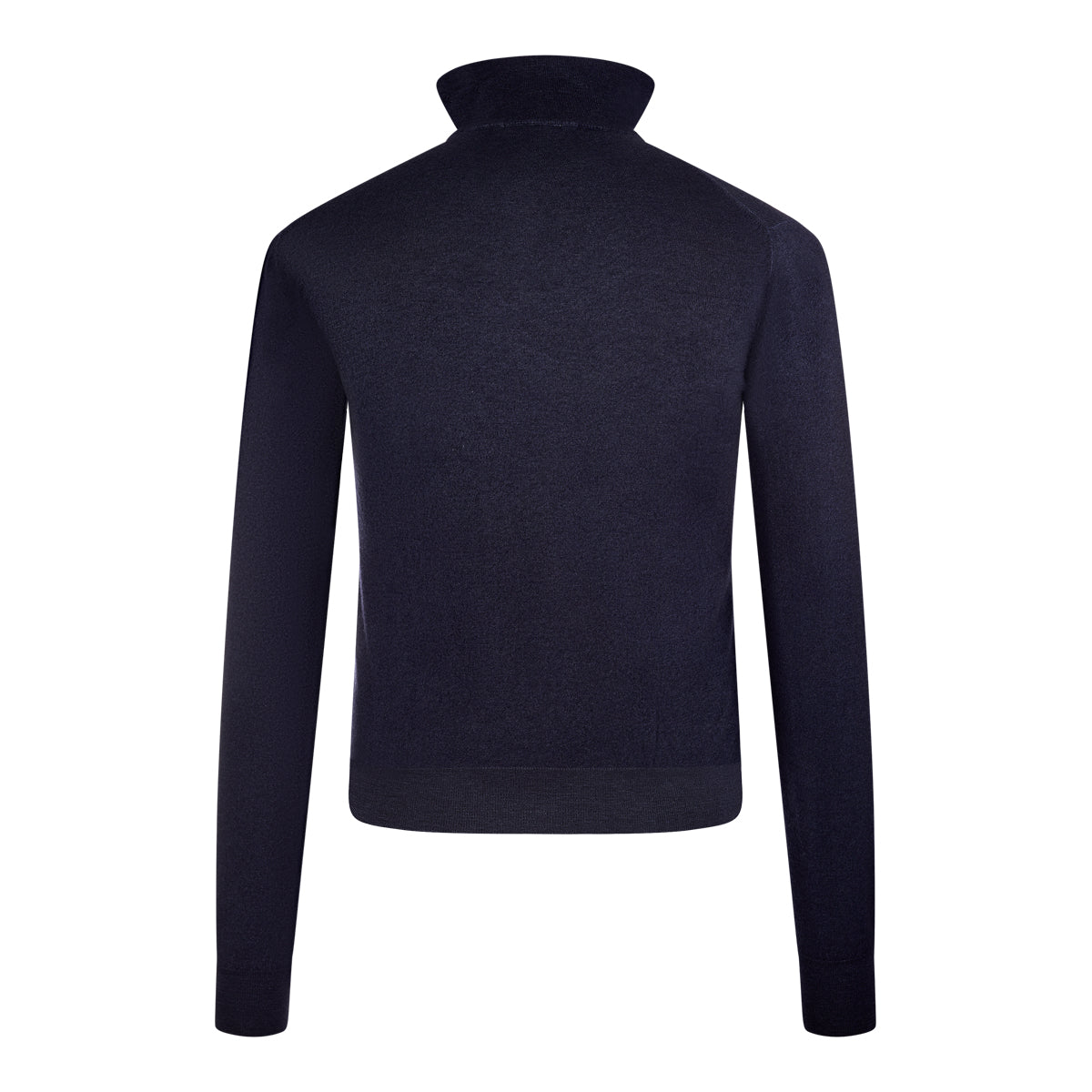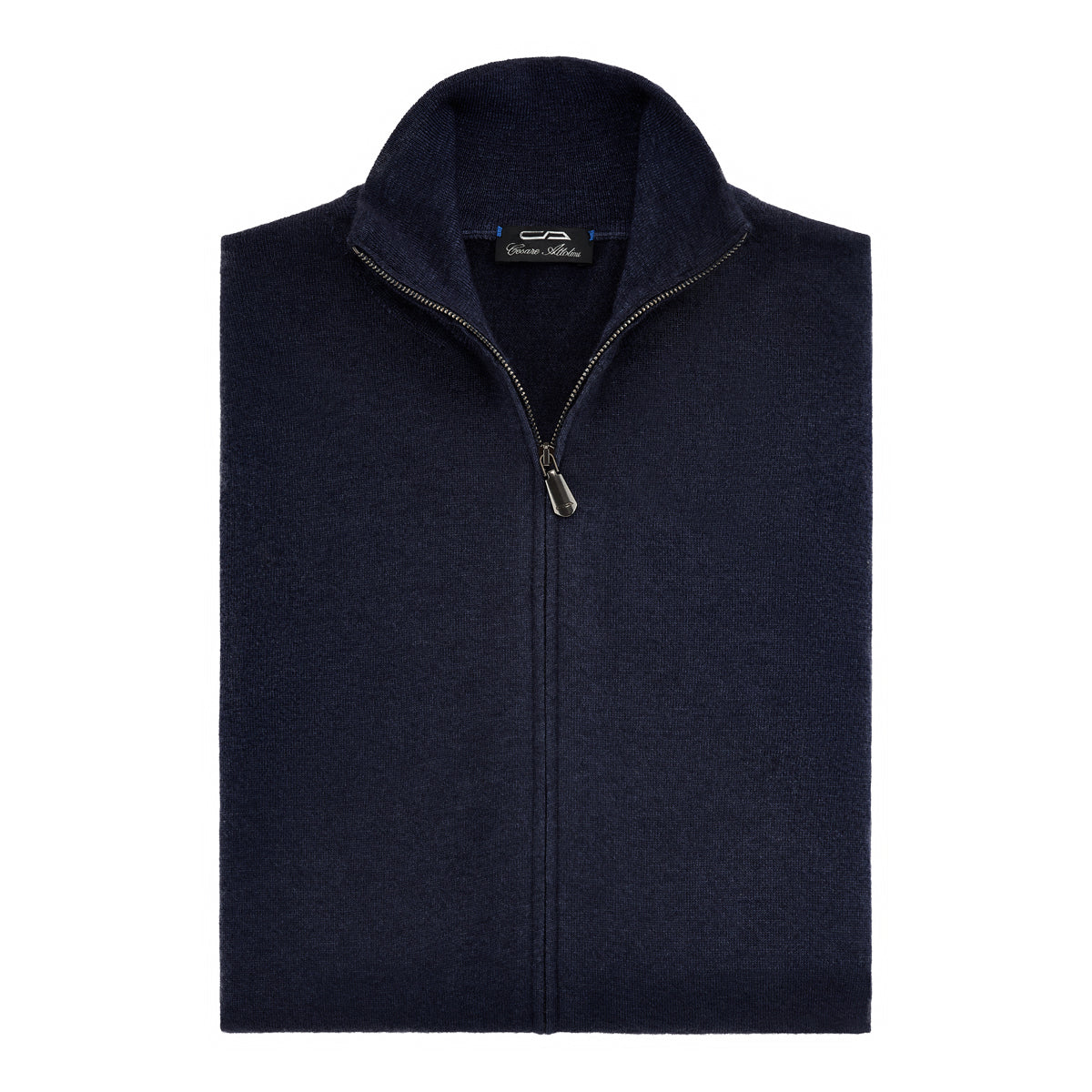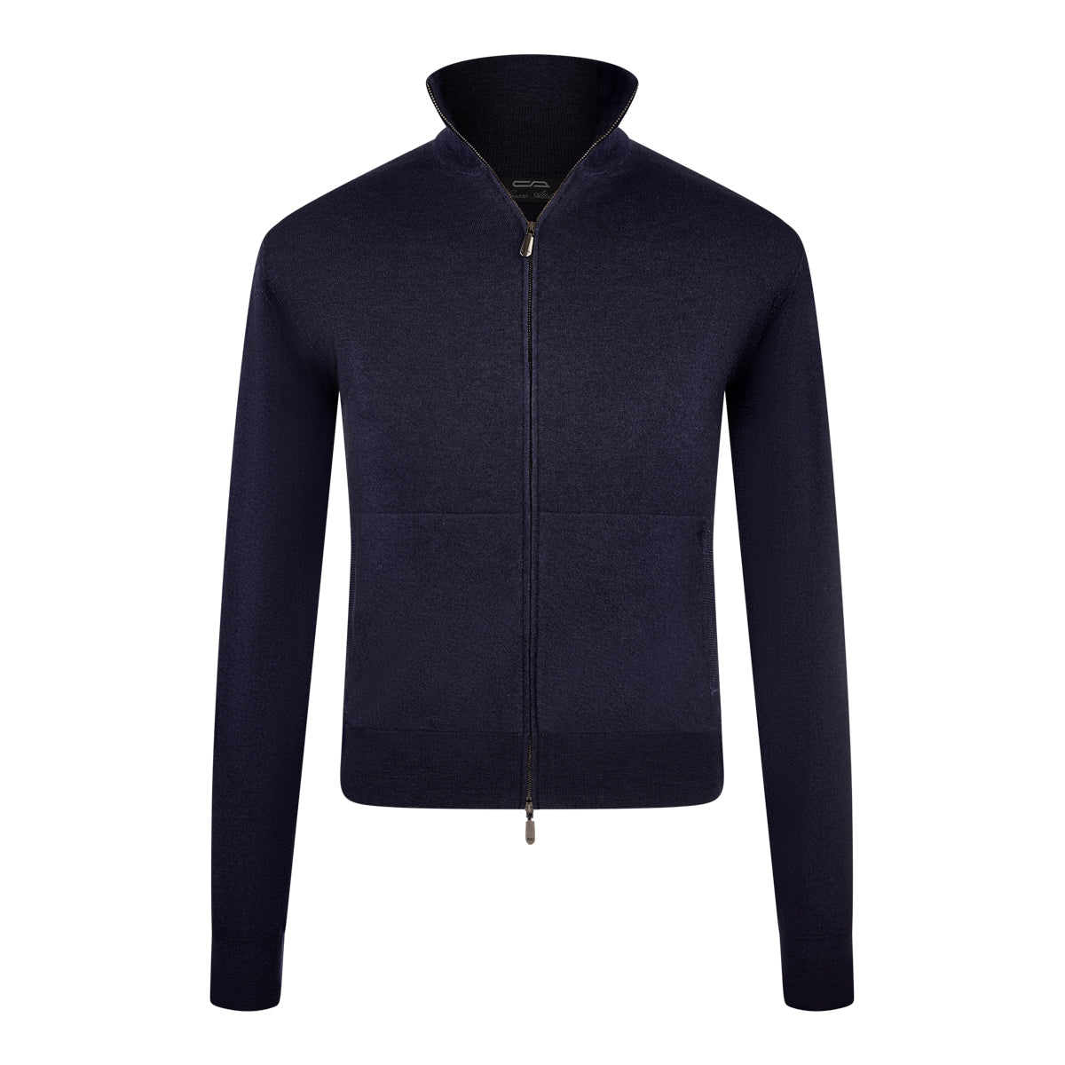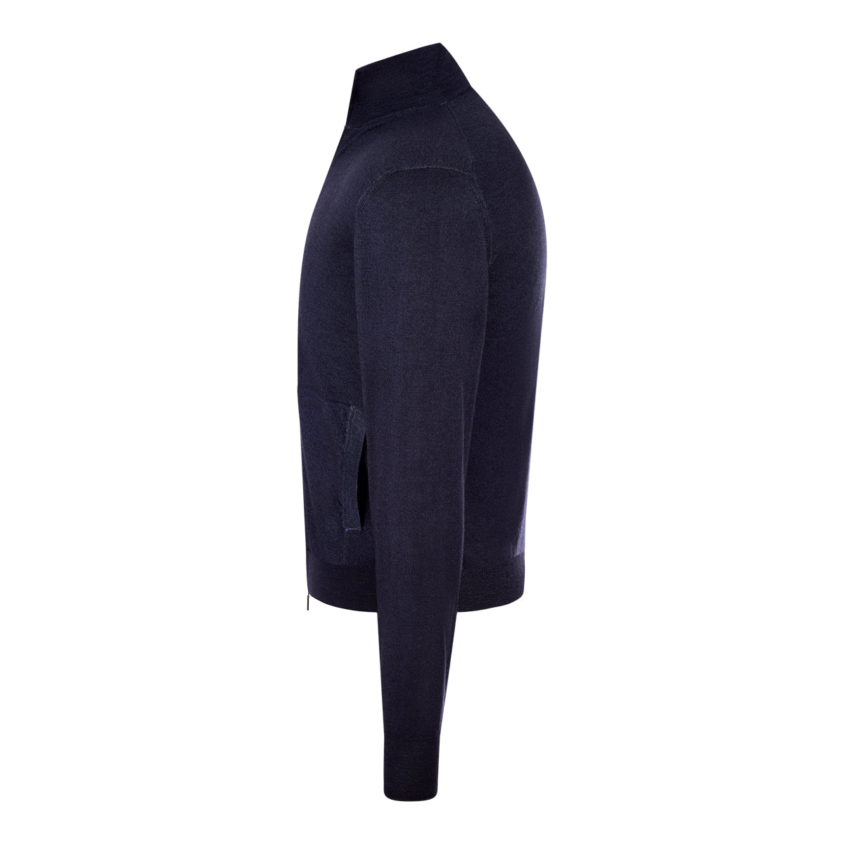 Navy cashmere full zip bomber with two side pockets. Ribbed neckline, cuffs and hemline.