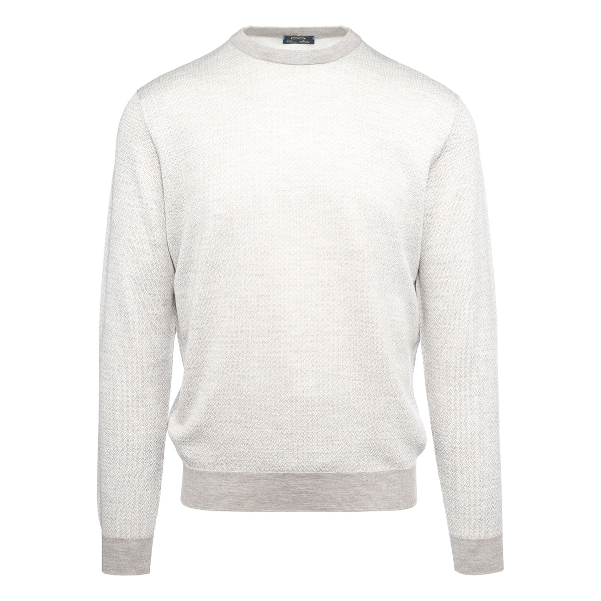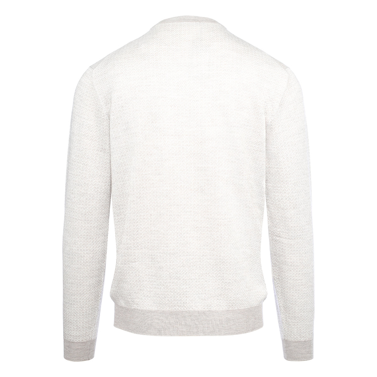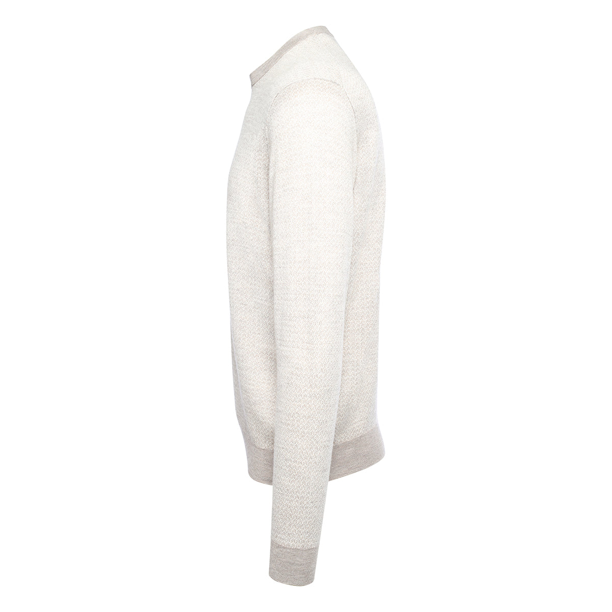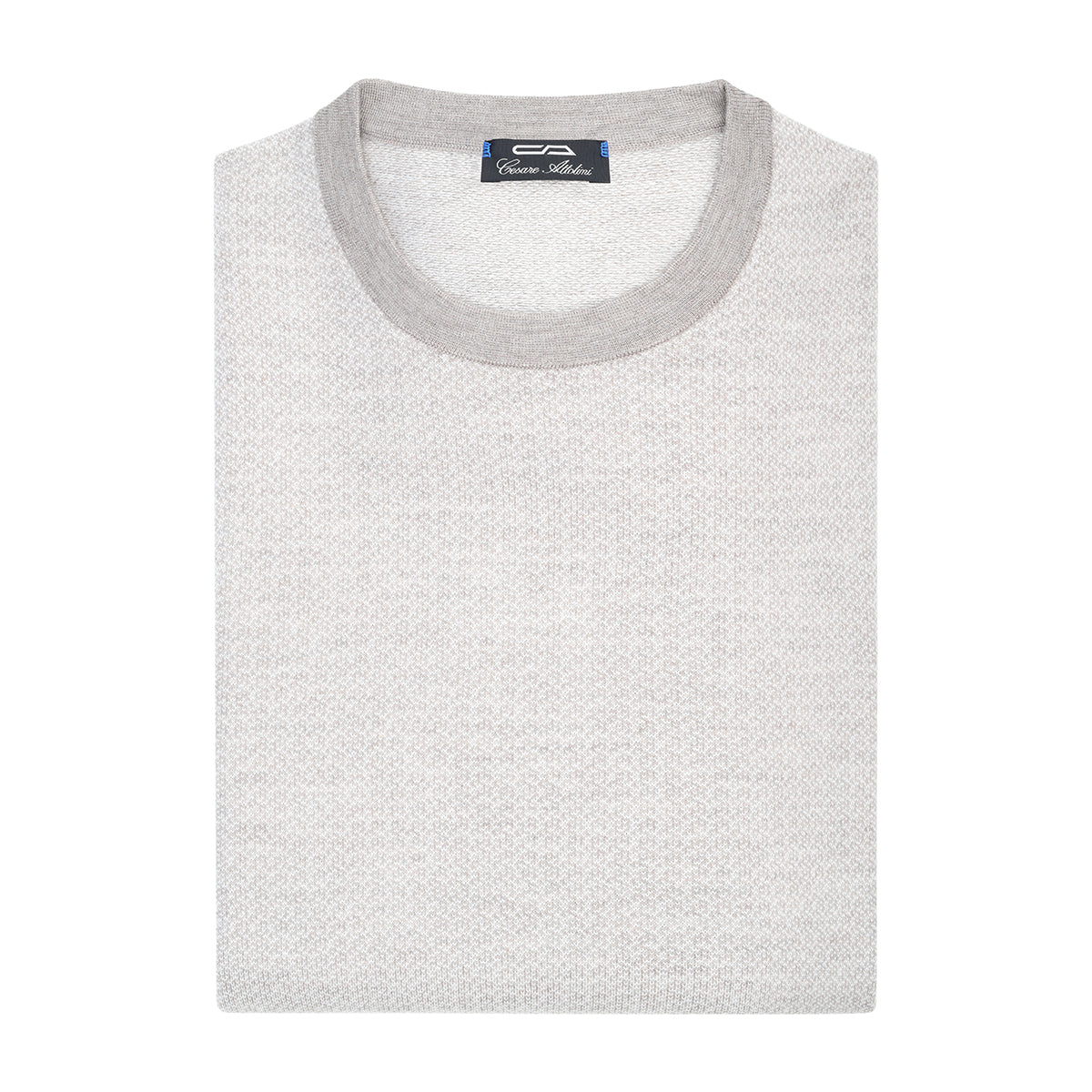 Two-tone crew-neck with beige background in cashmere and silk, collar, cuffs and bottom with flounces. This garment is made in our artisan workshop on the shores of Lake Trasimeno. The precious yarn makes our garment unique, soft and comfortable. It is ideal for a leisure look ensuring comfort and practicality.