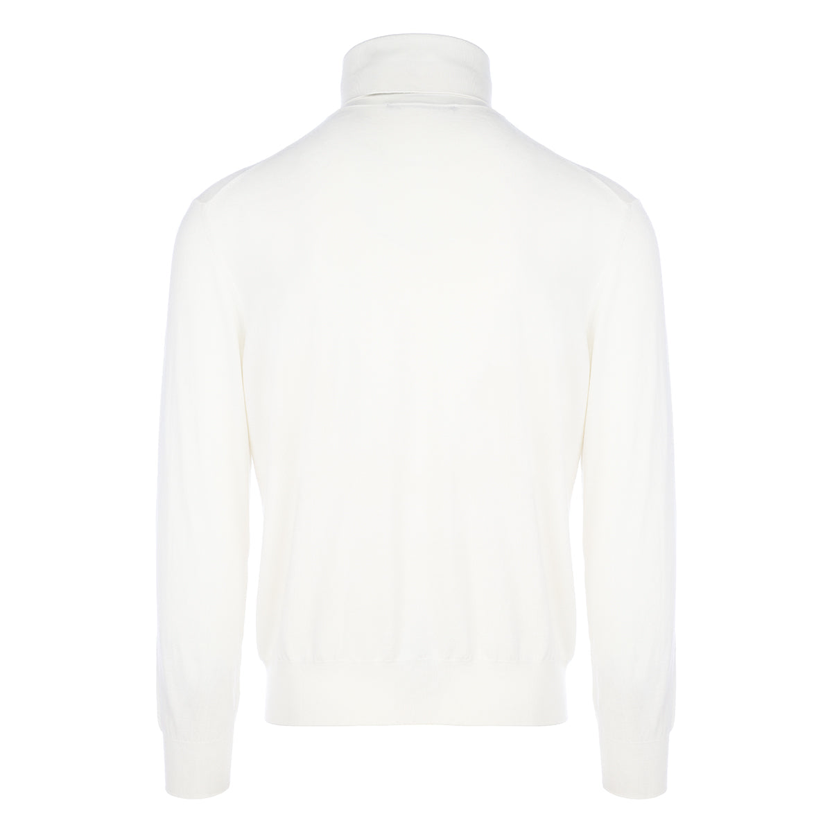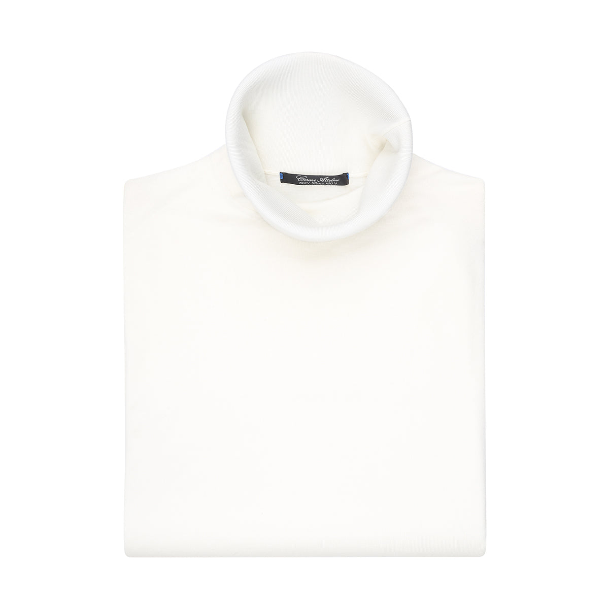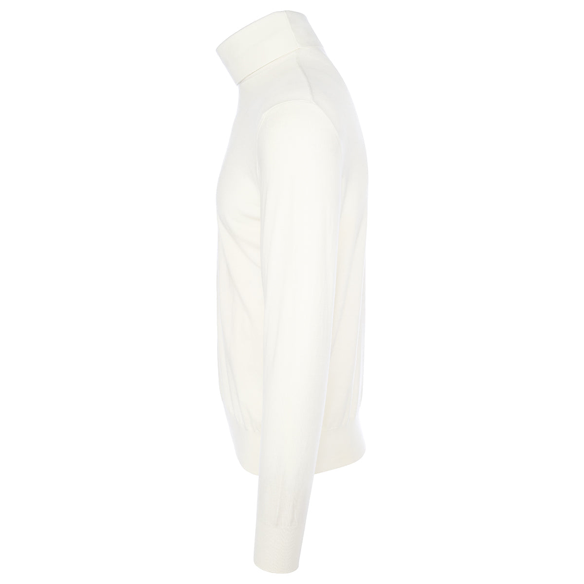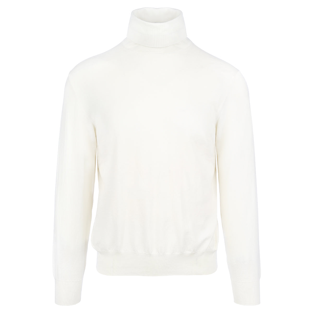White wool high collar. Ribbed flounce and cuffs. Made in our artisan workshop on the shores of Lake Trasimeno. The precious wool yarn makes it soft and comfortable.