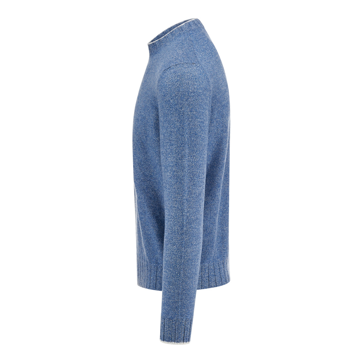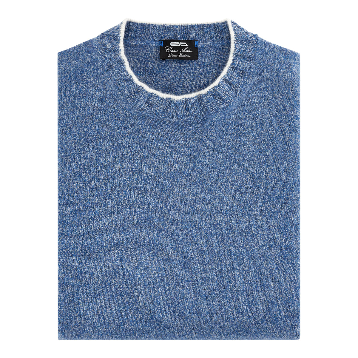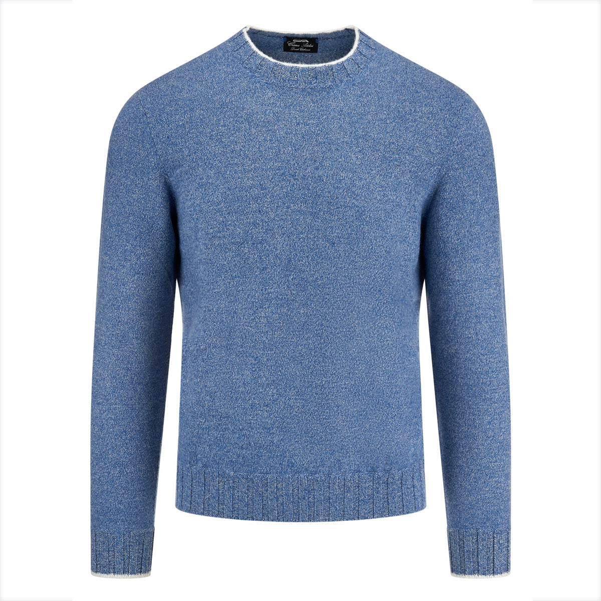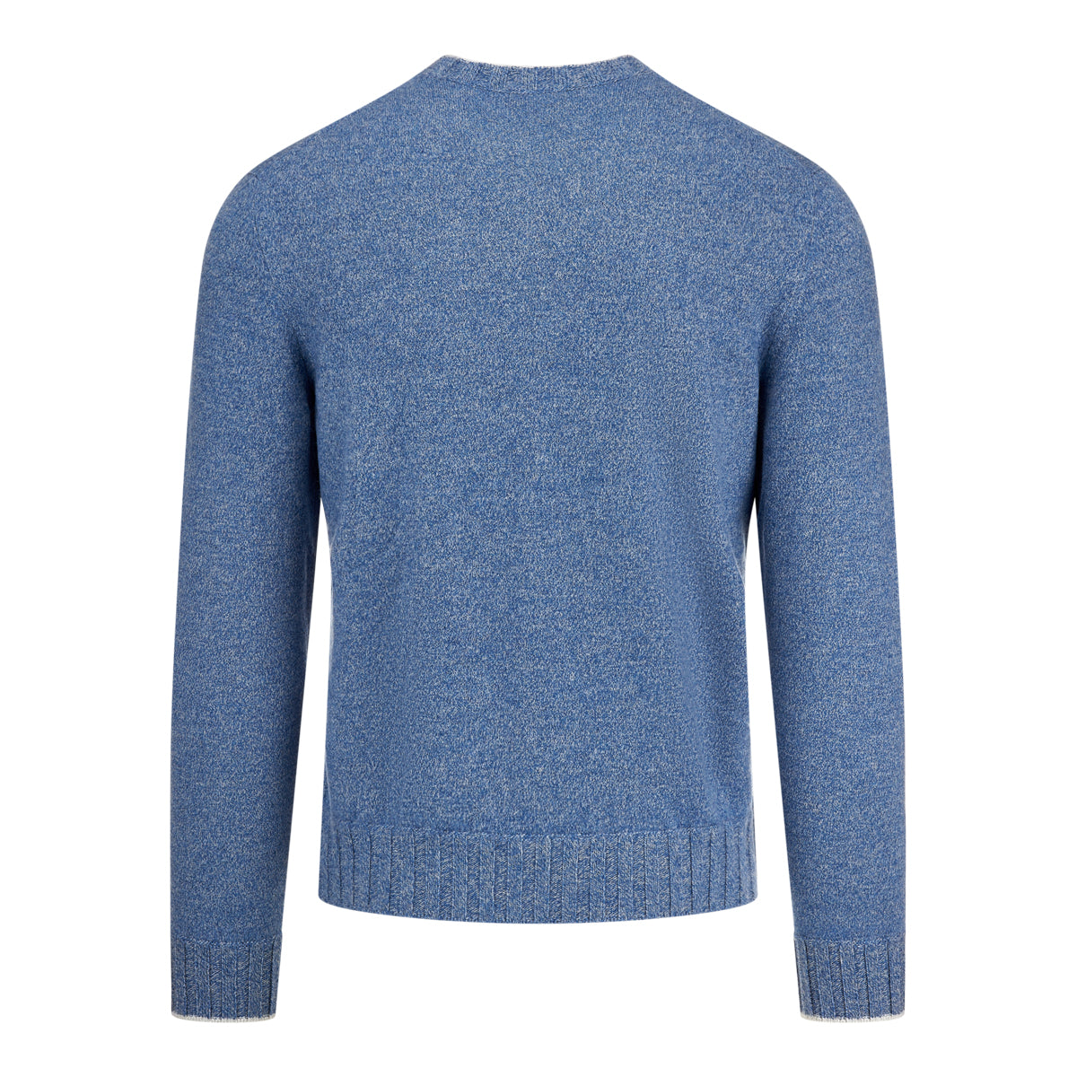 Denim blue mélange crew neck cashmere sweater with ribbed neckline, cuffs and hemline. White contrast color on neck and cuffs.