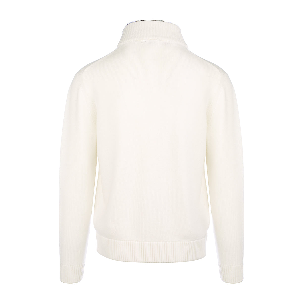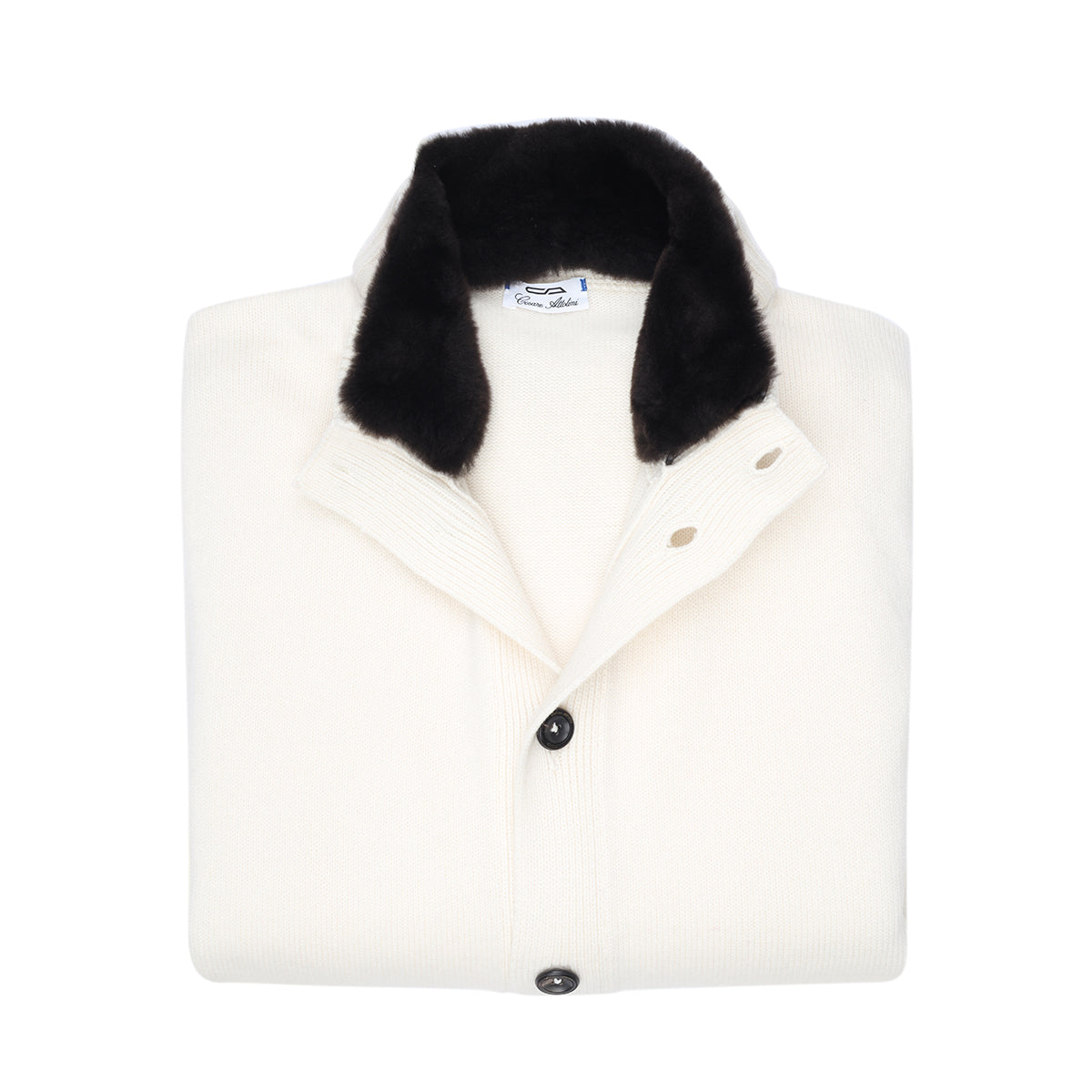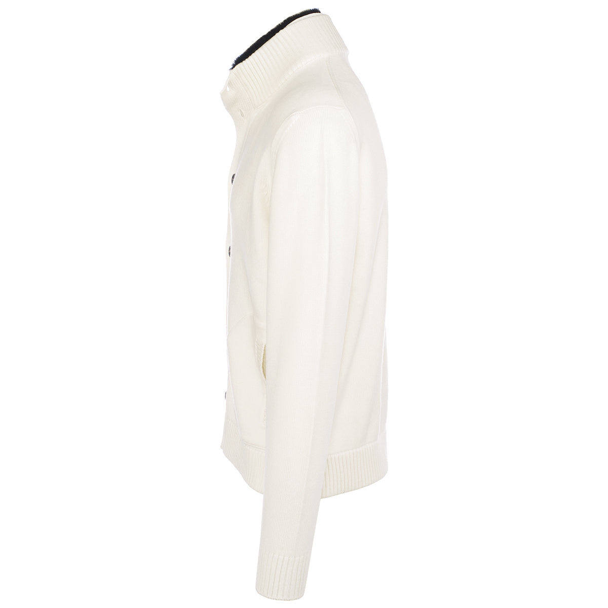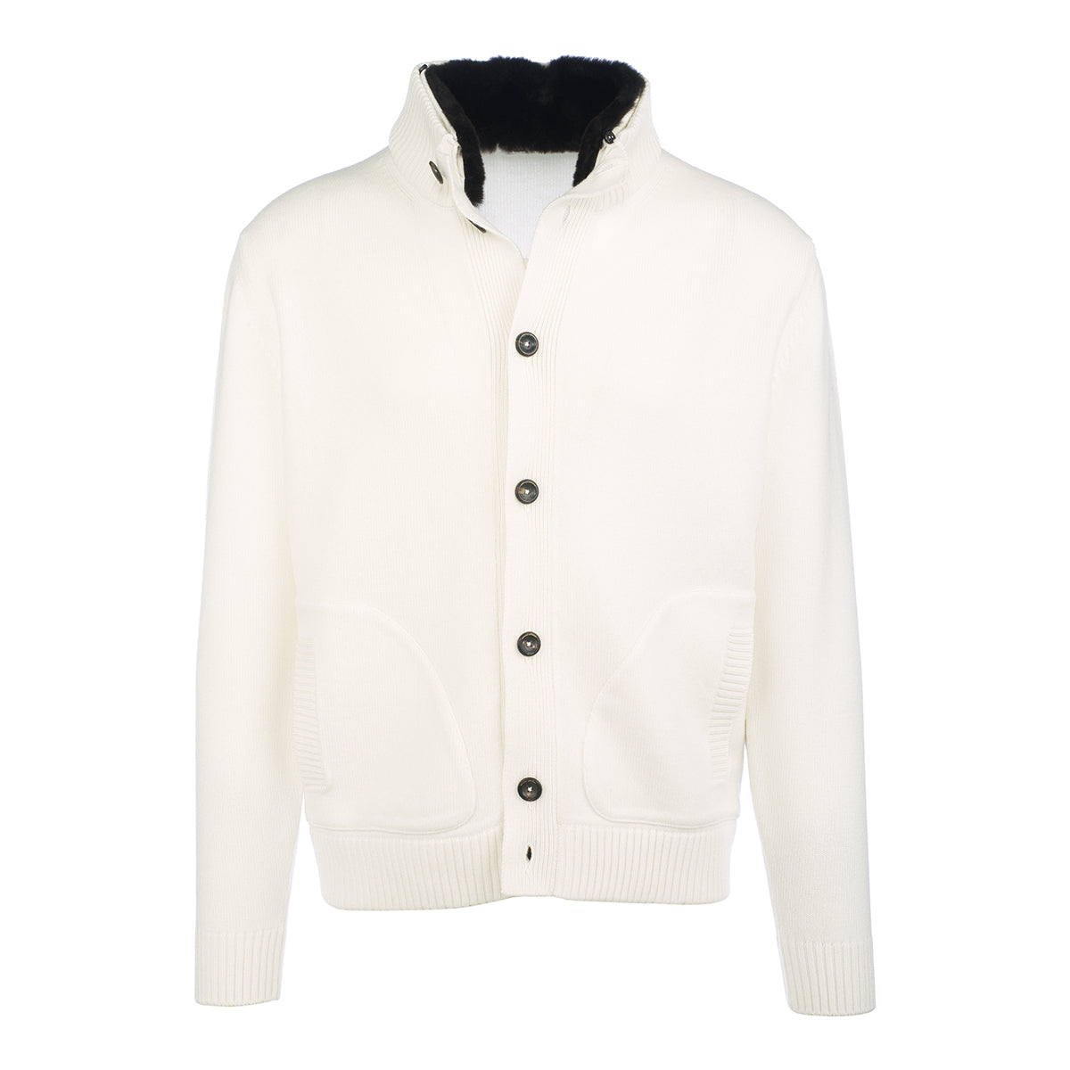 Bomber cardigan with buttons with detachable collar in beaver in two-ply white cashmere with two welt pockets. Ribbed cuffs, neck and flounce. Made in our artisan workshop on the shores of Lake Trasimeno. The precious pure cashmere yarn, makes it soft and comfortable.
