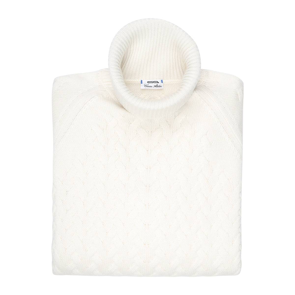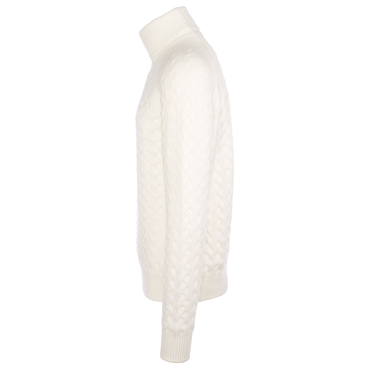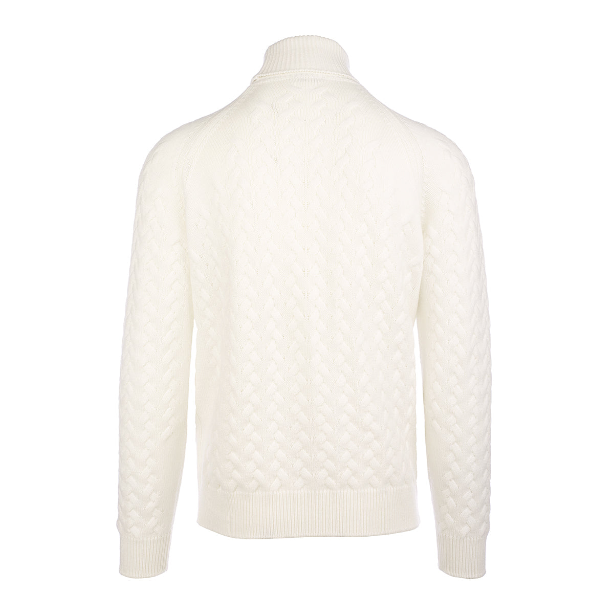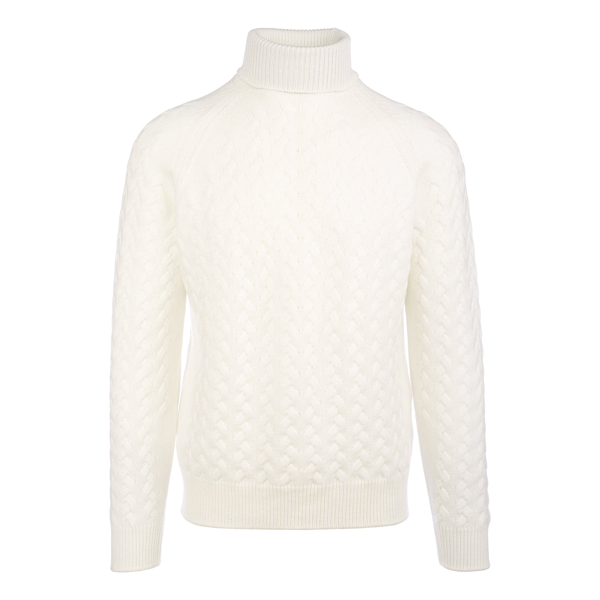 White cashmere high neck with reglan sleeves, double braid with ribs at the neck, at the flounce and at the cuffs. Made in our artisan workshop on the shores of Lake Trasimeno. The precious cashmere yarn makes it soft and comfortable.