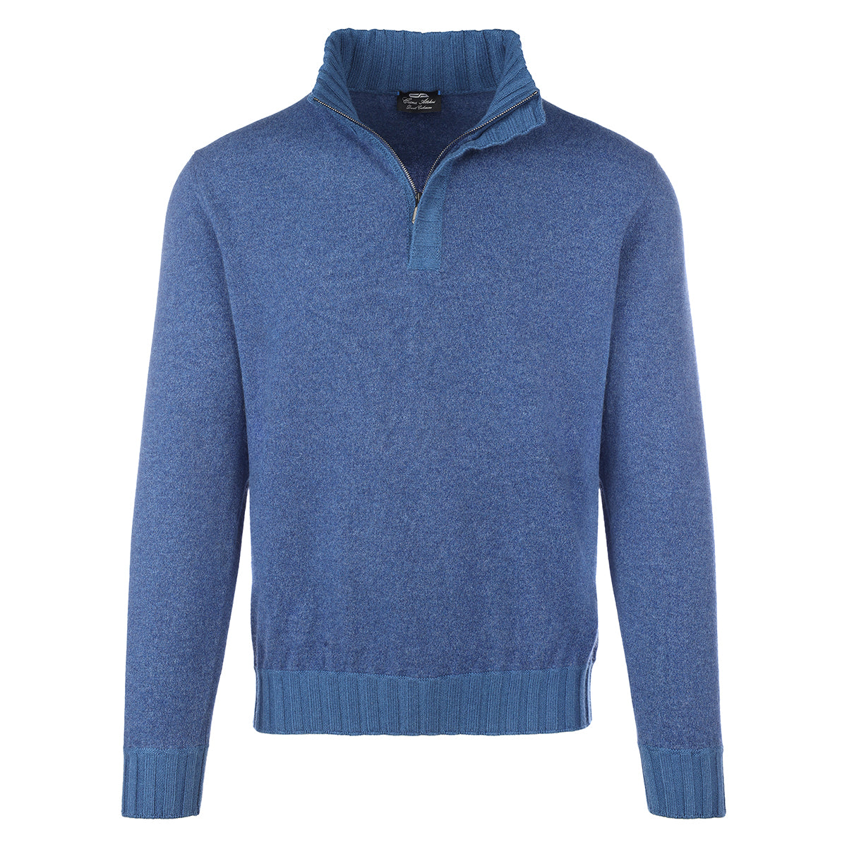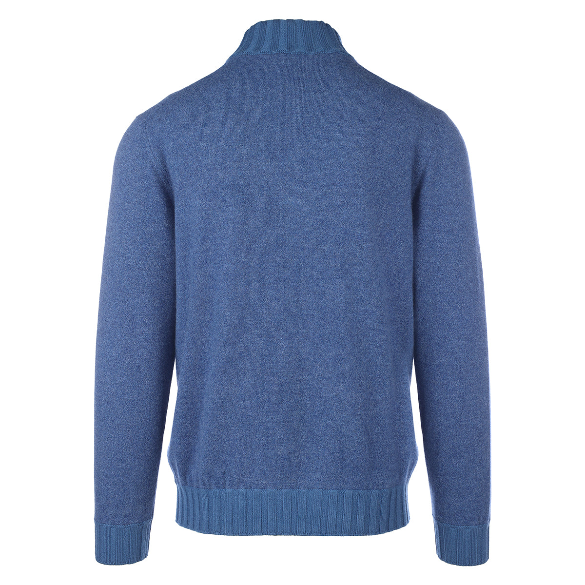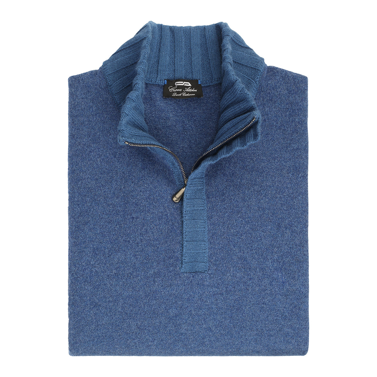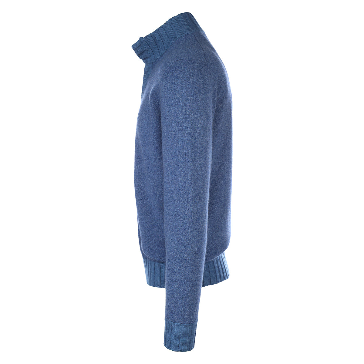 Serafina with long sleeve zip in blue. Ribbed collar, cuffs and hem. This garment is made in our artisan workshop on the shores of Lake Trasimeno. The precious pure combed cashmere yarn and the exclusive Duvet manufacturing make our garment unique, soft and comfortable. It is ideal for a leisure look, guaranteeing comfort and practicality.
