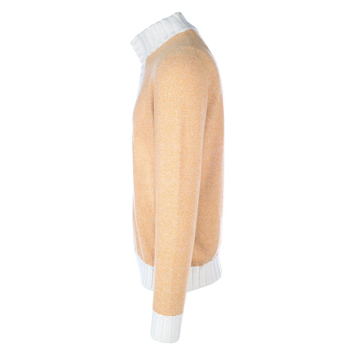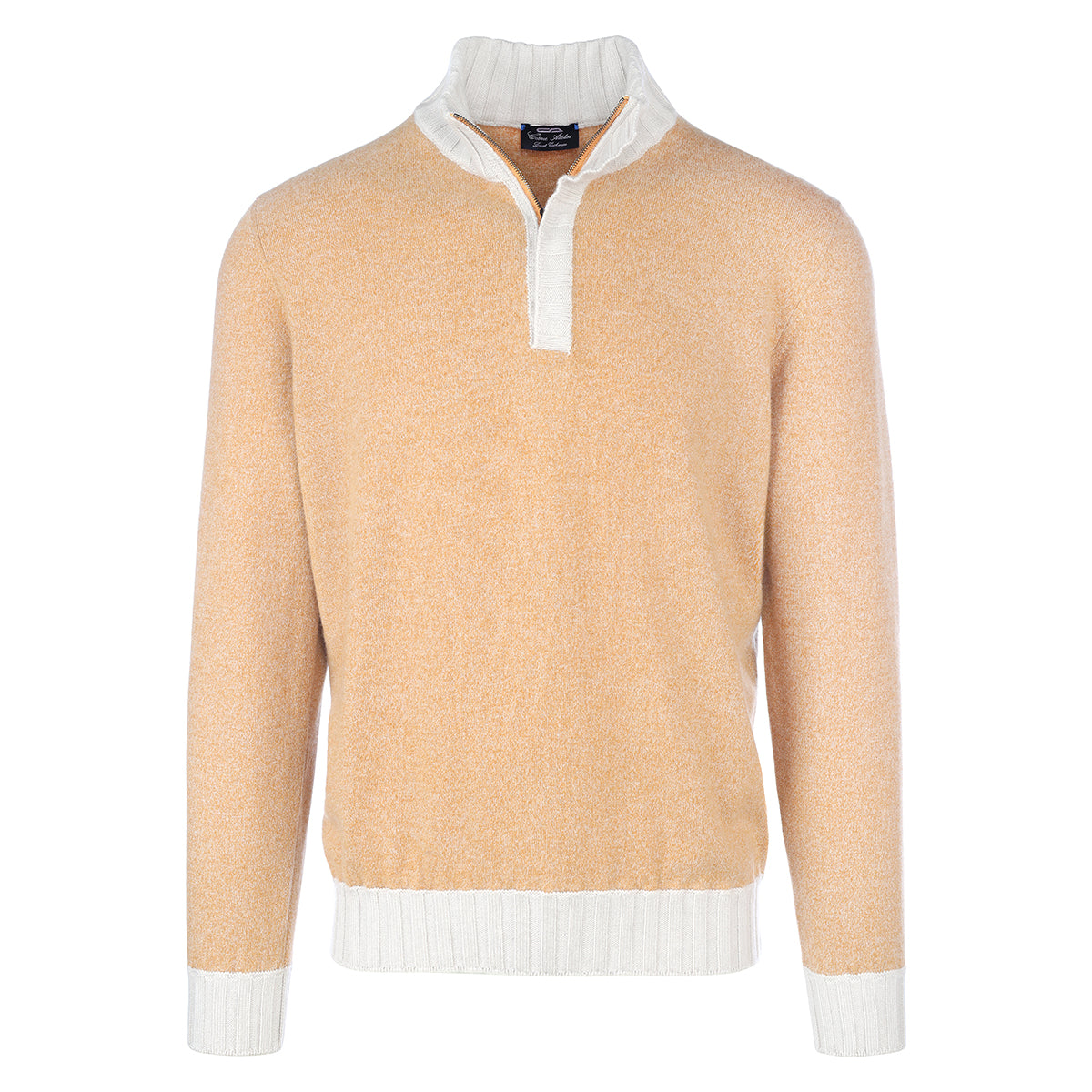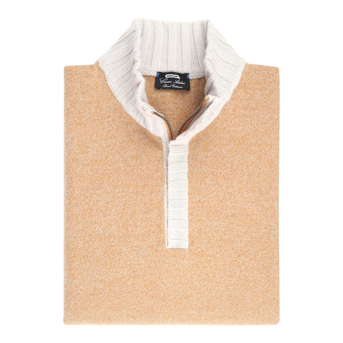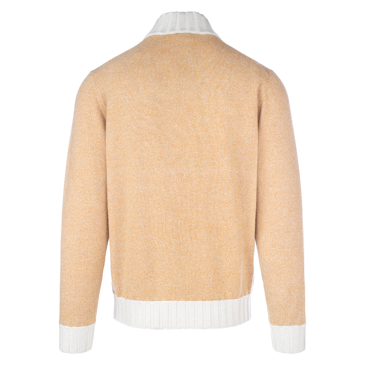 Imperial yellow long-sleeved zip-up Serafina. Ribbed collar, cuffs and bottom in contrasting beige. This garment is made in our artisan workshop on the shores of Lake Trasimeno. The precious pure combed cashmere yarn and the exclusive Duvet manufacturing make our garment unique, soft and comfortable. It is ideal for a leisure look, guaranteeing comfort and practicality.