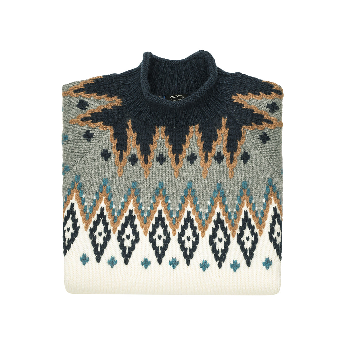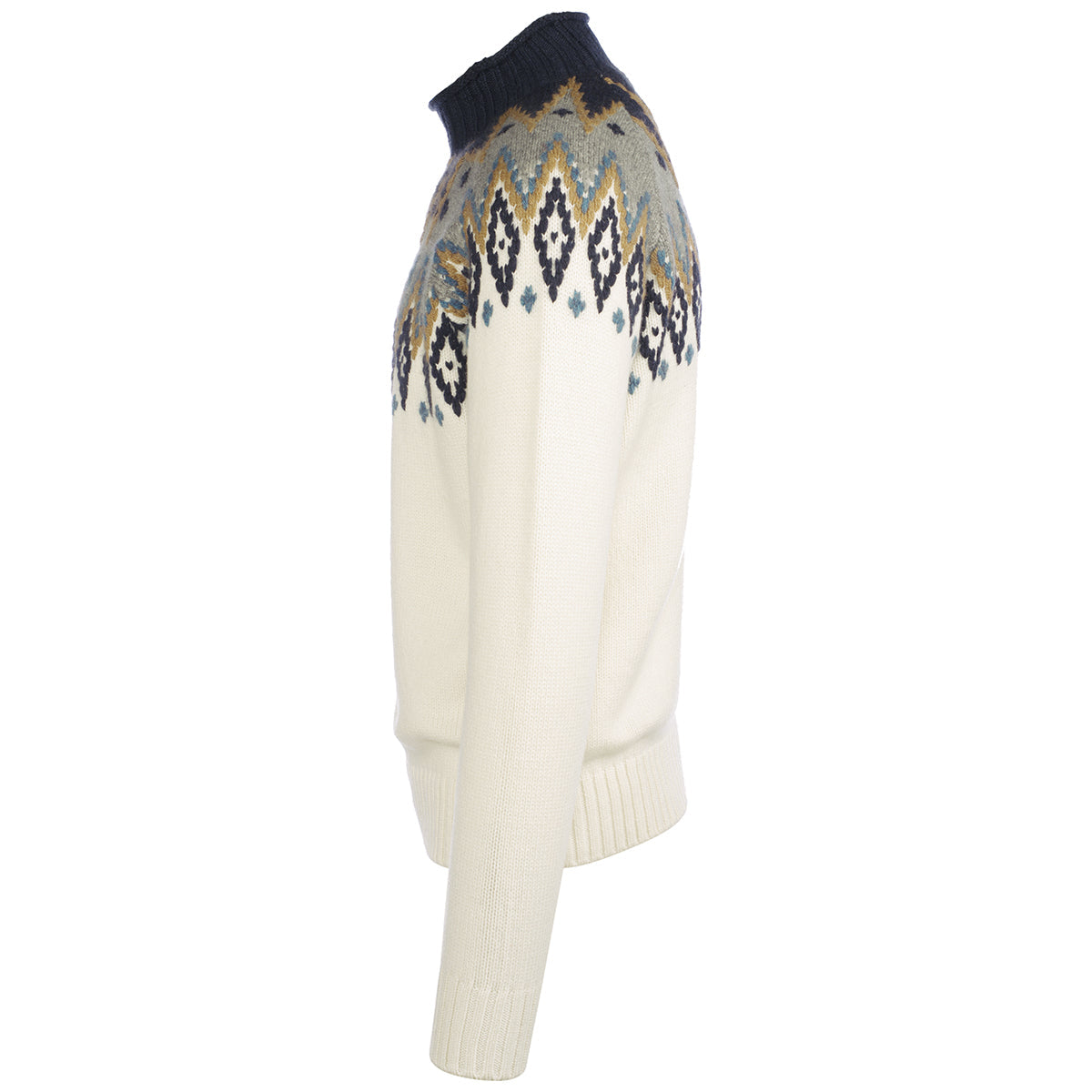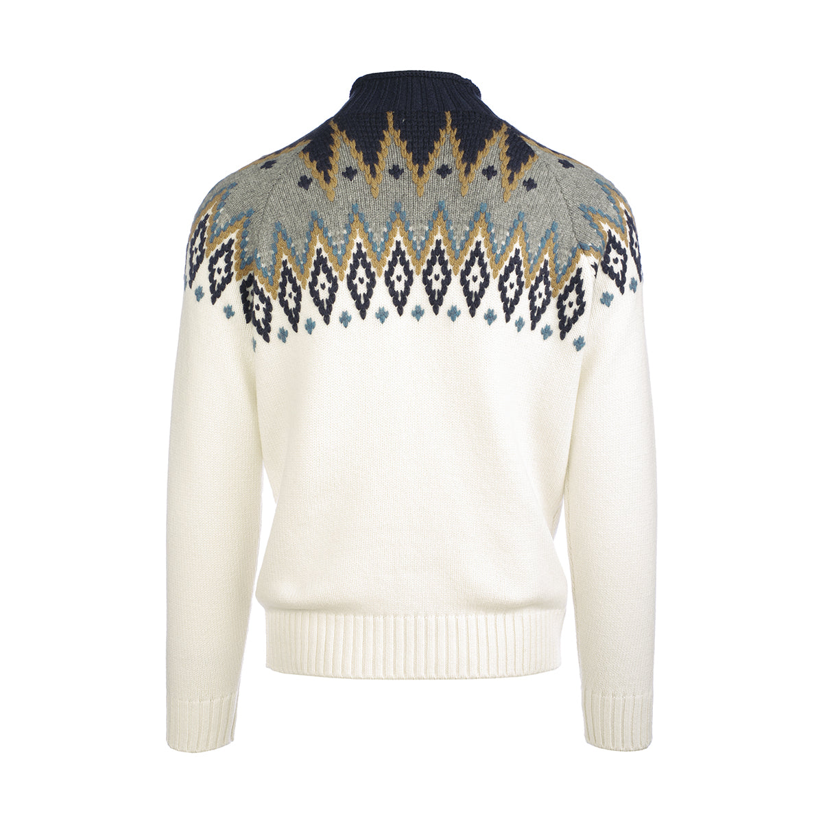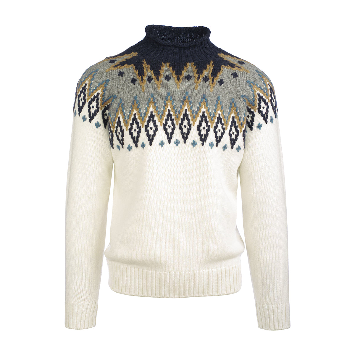 White, gray and blue Norwegian turtle neck embroidered by hand in four-ply cashmere. Ribbed neck, cuffs and flounce. Made in our artisan workshop on the shores of Lake Trasimeno. The precious pure cashmere yarn is exclusive workmanship and makes it unique.