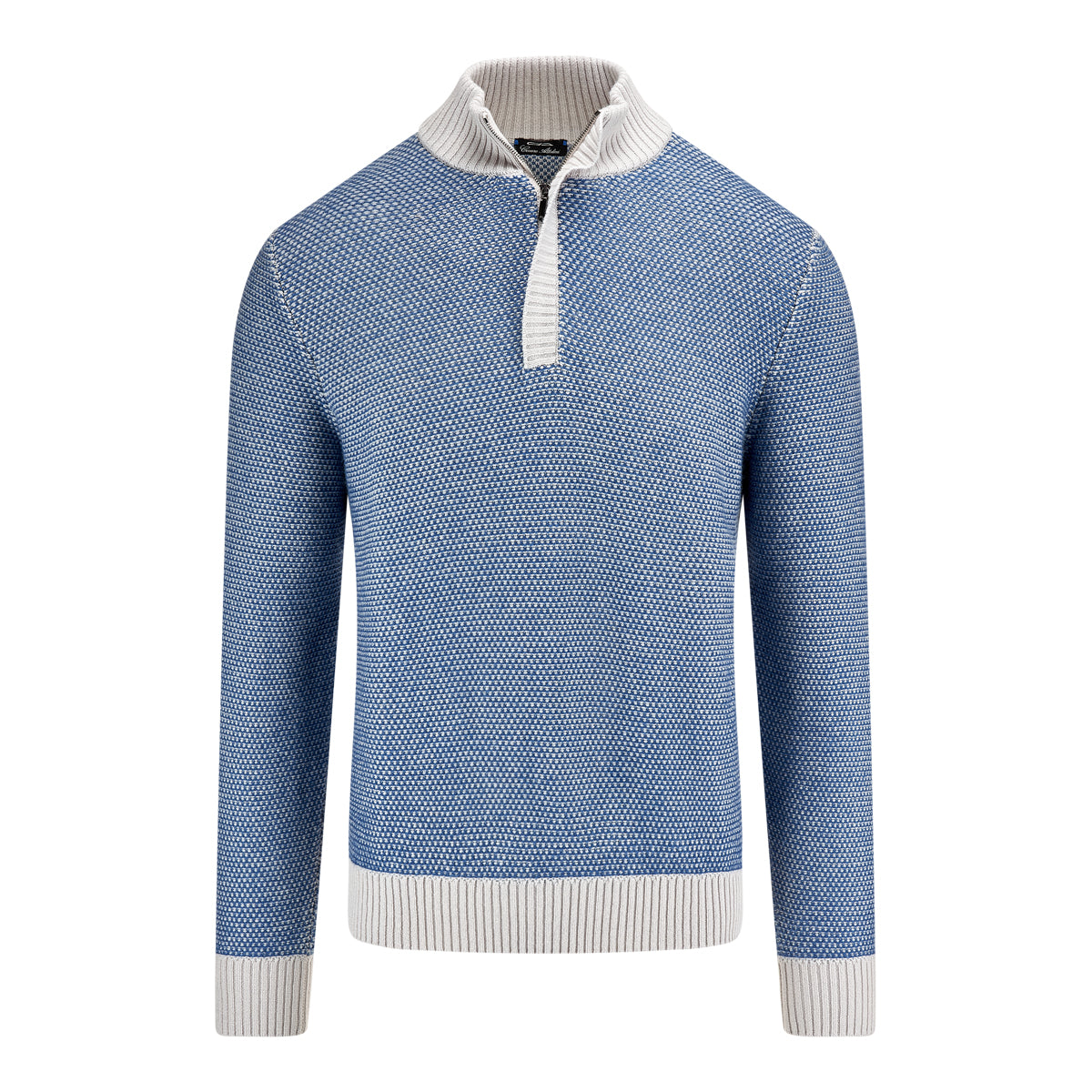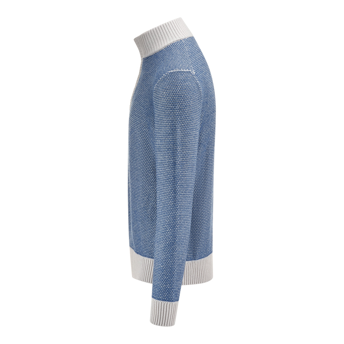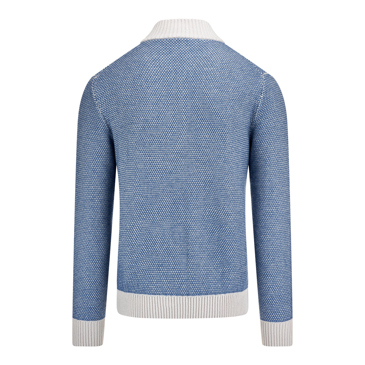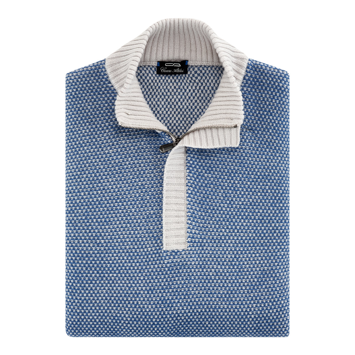 Light blue cashmere Serafina zip with light grey contrast and ribbing on collar, cuffs and hemline.