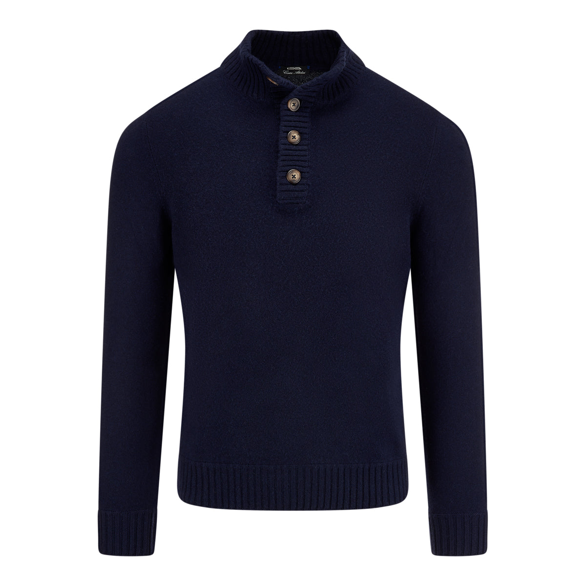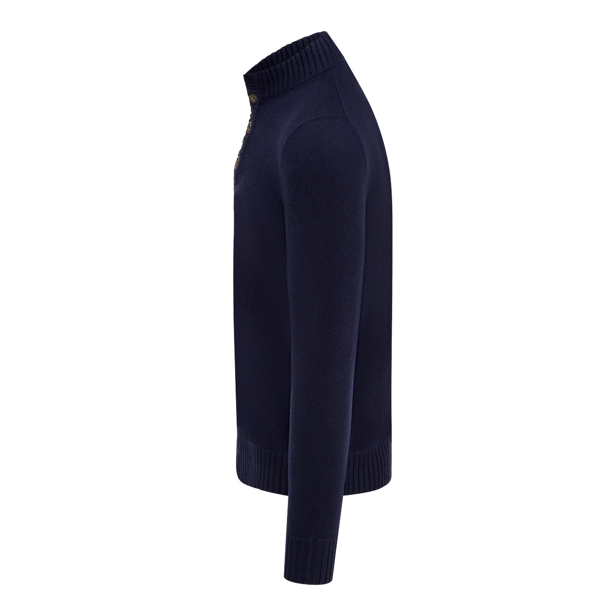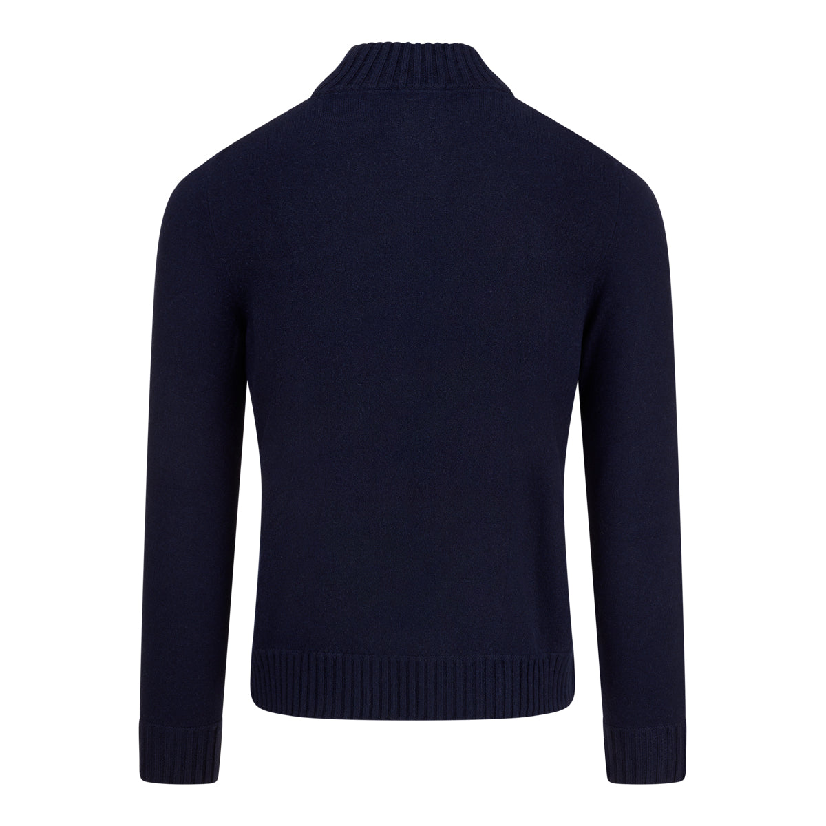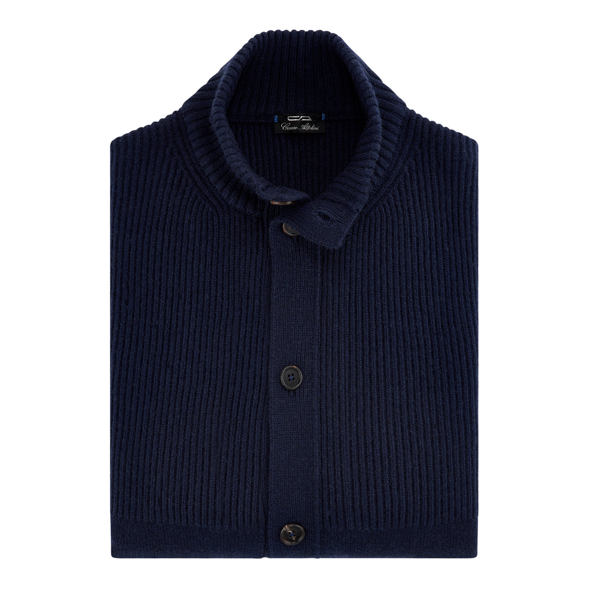 Navy two ply ribbed bomber cardigan with horn buttons and side pockets.