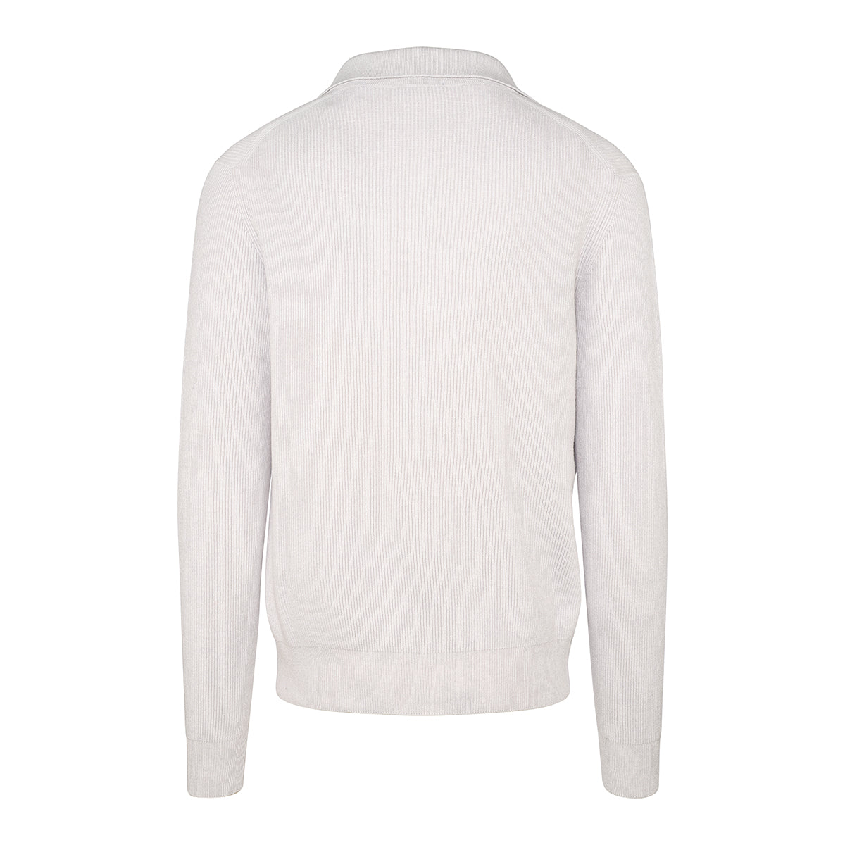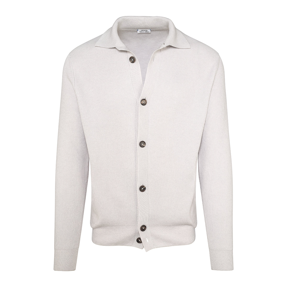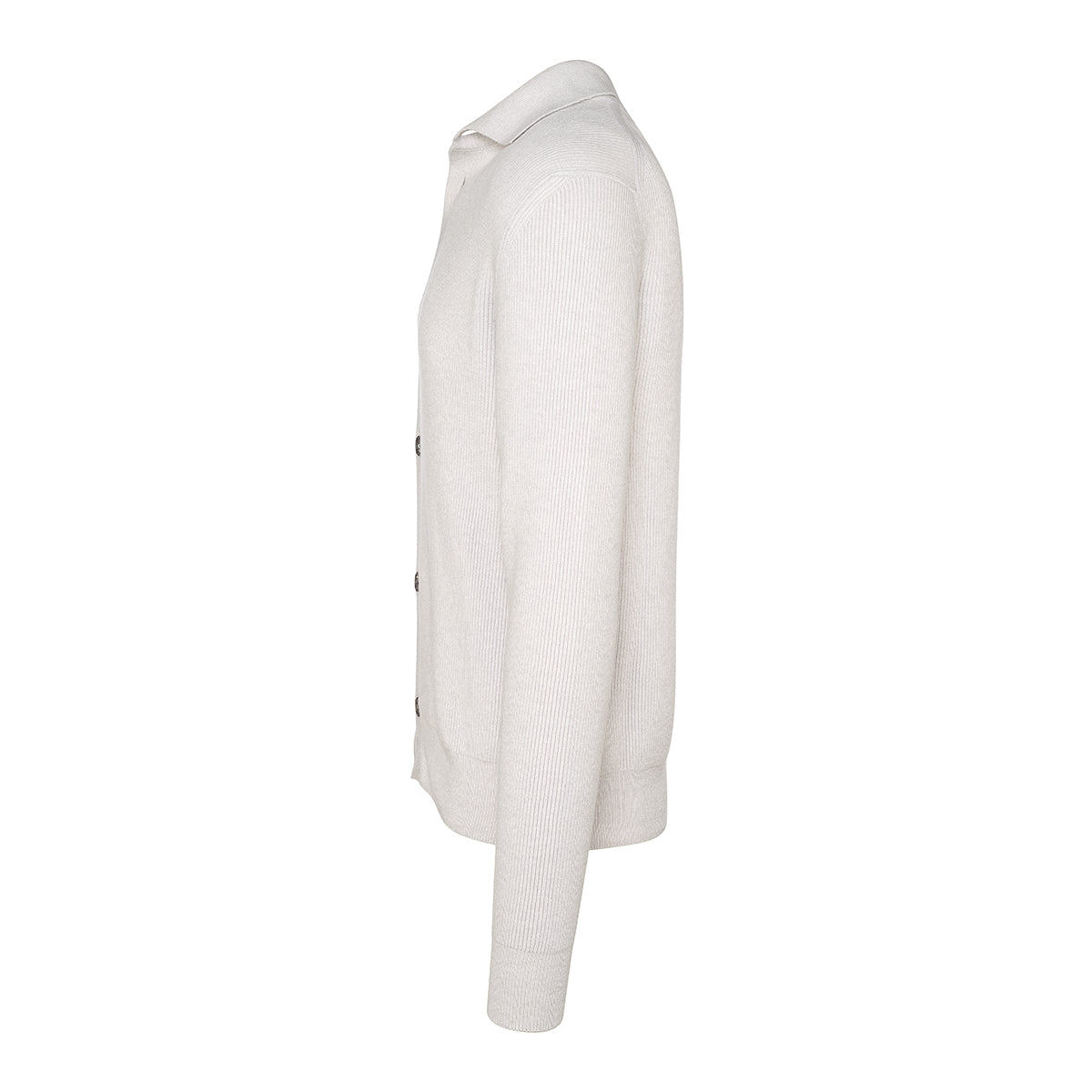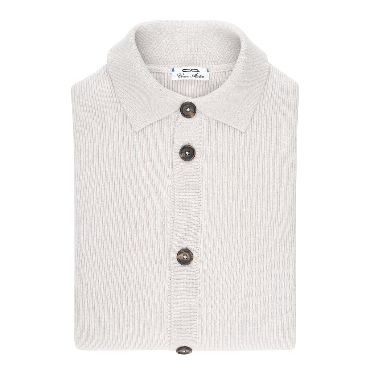 Button-up shirt knit, gauge 12, made from 100% cashmere, featured in an elegant white color. The classic design with a collar and buttons is perfect for those seeking a versatile garment that combines style and comfort. The cashmere yarn ensures a feeling of softness and warmth. This garment is crafted in our artisan workshop on the shores of Lake Trasimeno.