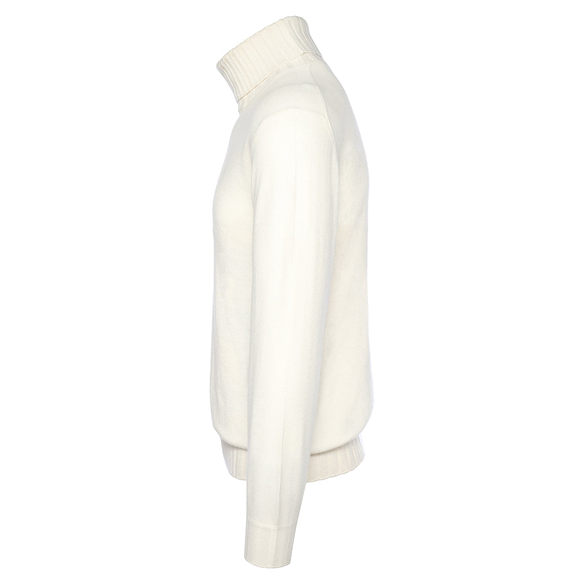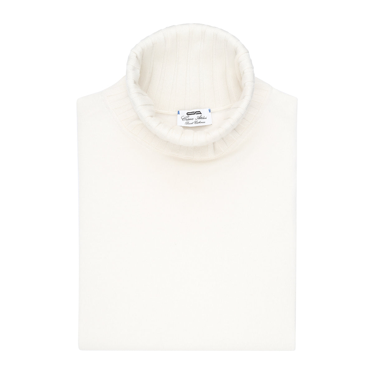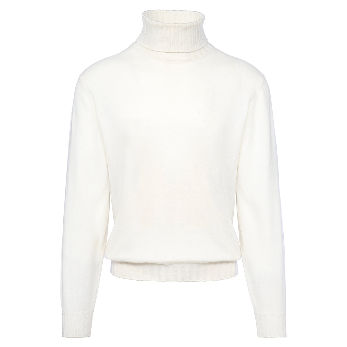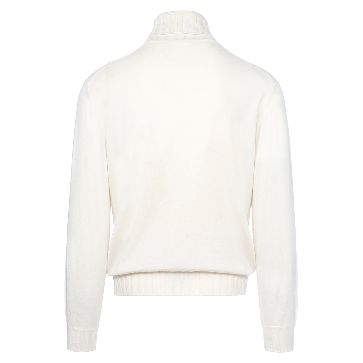 White cashmere duvet high collar with ribbed neck, cuffs and flounce. Made in our artisan workshop on the shores of Lake Trasimeno. The precious pure cashmere yarn and the exclusive Duvet processing make it unique.