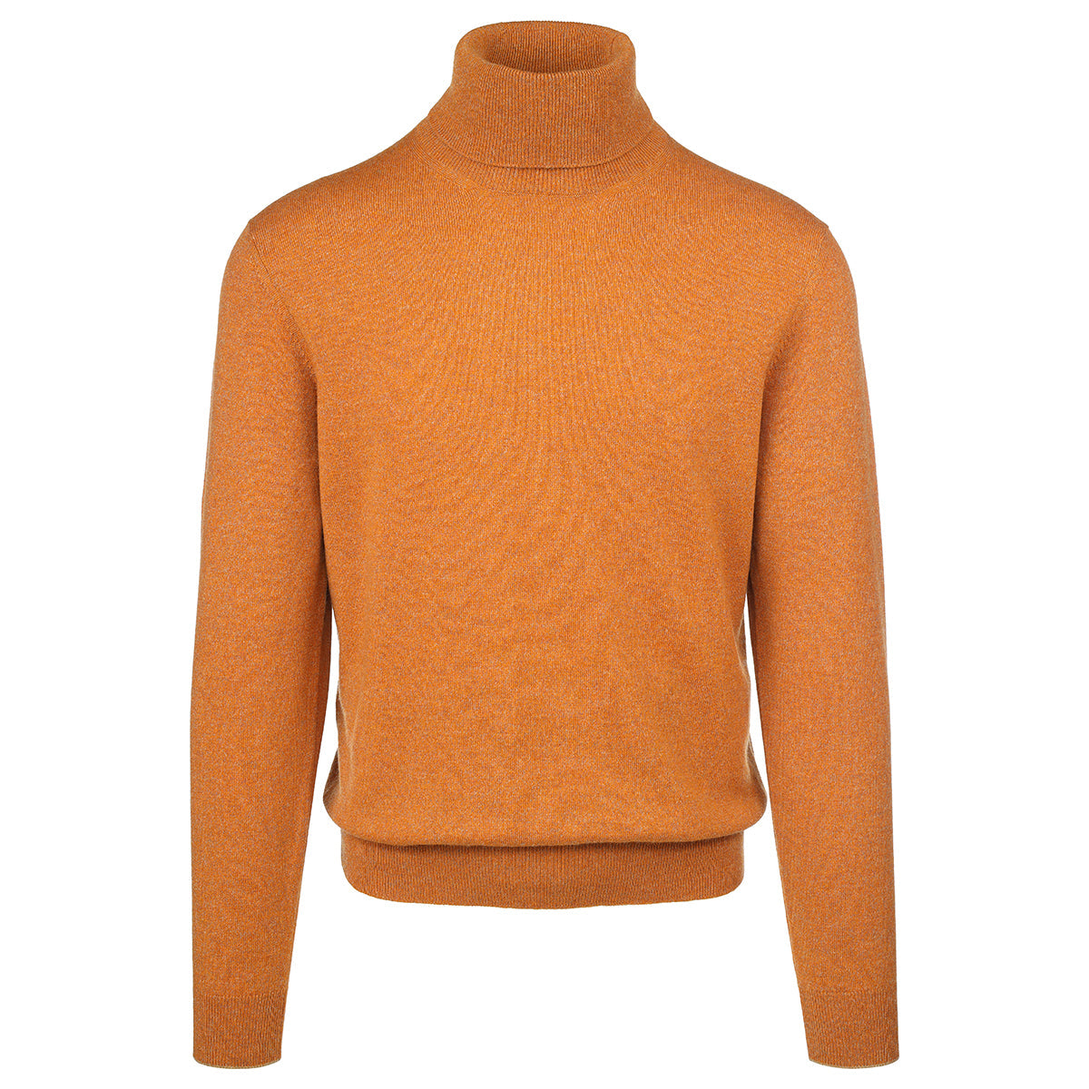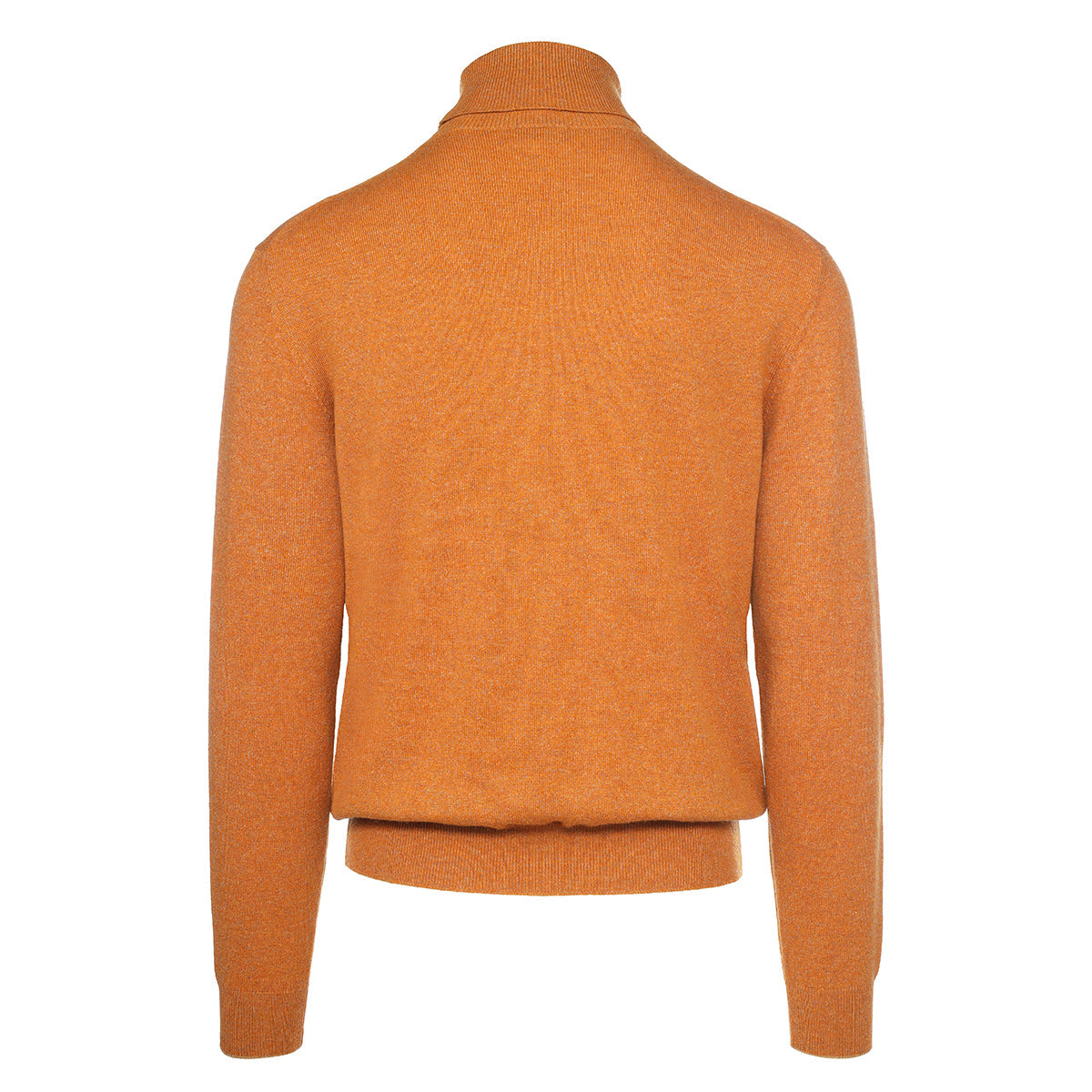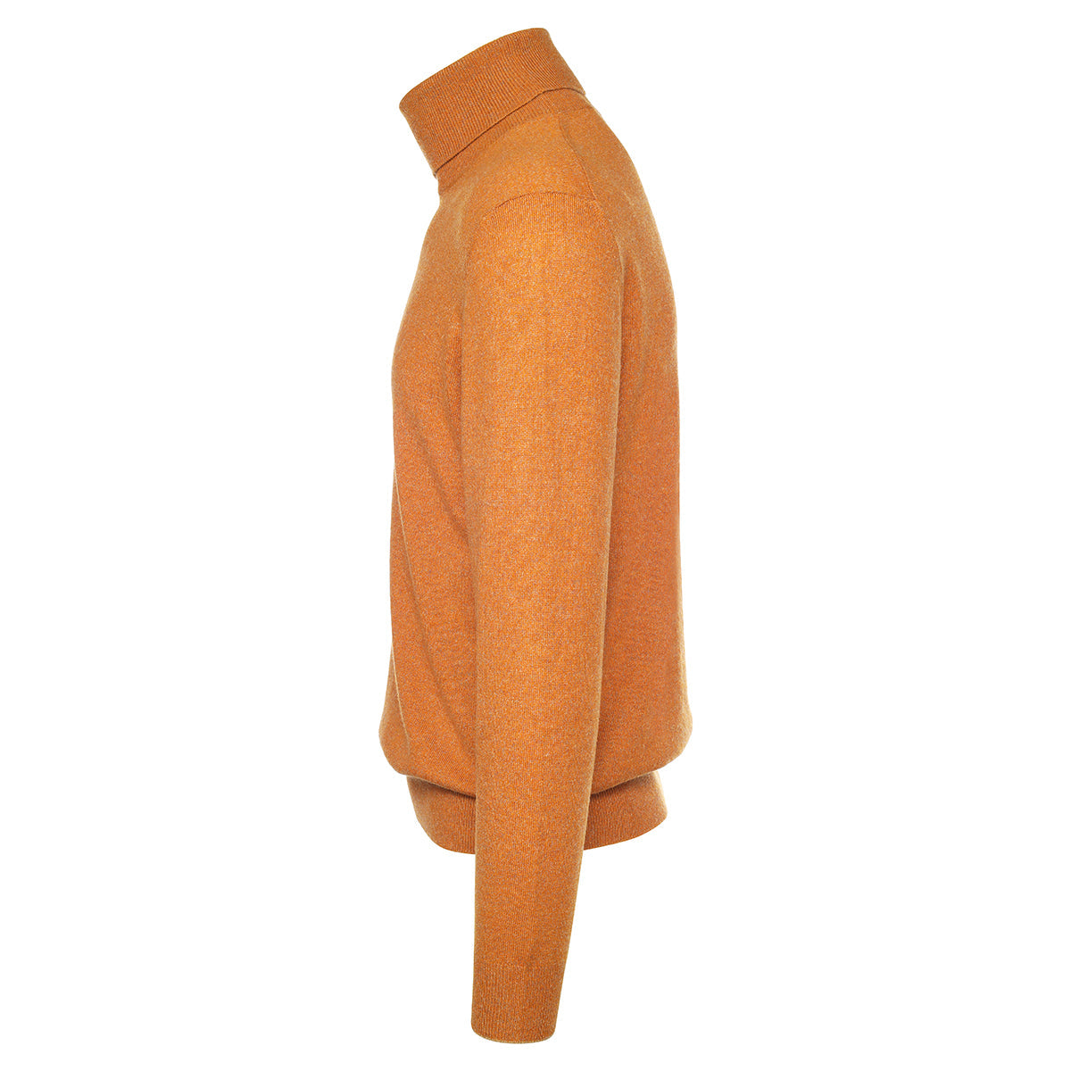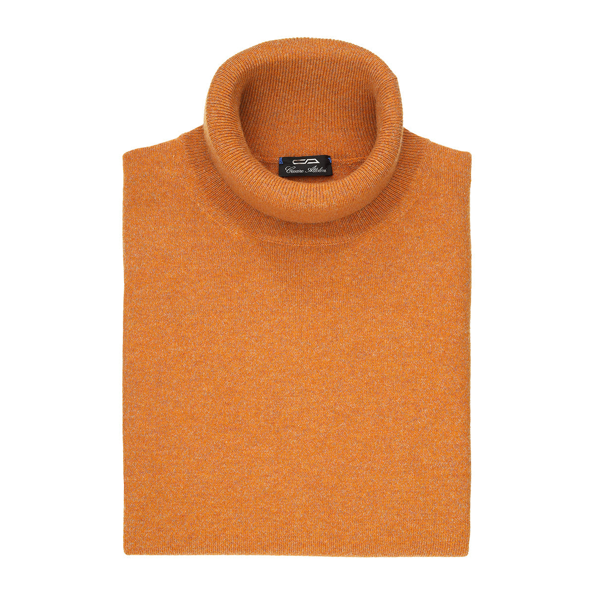 Brick-colored cashmere and silk high collar. Made in our artisan workshop on the shores of Lake Trasimeno. It is ideal for creating a classic under-jacket and leisure look, ensuring comfort.