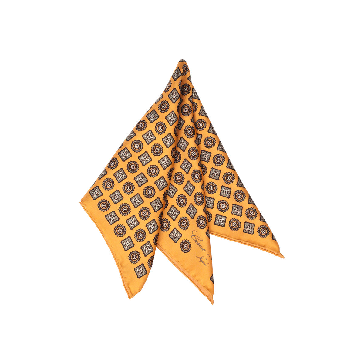 The Cesare Attolini pochette is a totally handmade product, from the single cut of the fabric to the manufacturing. This pochette with handmade hem in silk twill yellow ocher background gray geometric pattern with Cesare Attolini Napoli logo in gray contrast, is perfect to complete your looks with a touch of style and refinement.