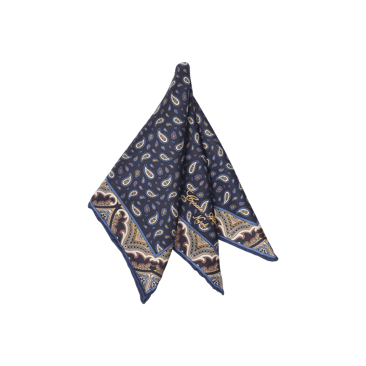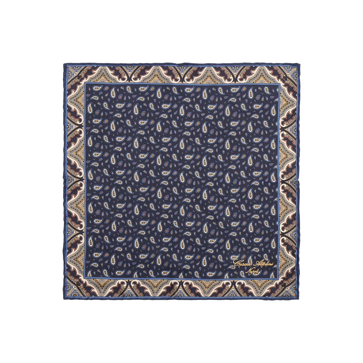The Cesare Attolini pochette is a totally handmade product, from the single cut of the fabric to the manufacturing. This pochette with handmade hem in silk twill blue background with cashmere pattern and Cesare Attolini Napoli logo in yellow contrast, is perfect to complete your look with a touch of style and refinement.