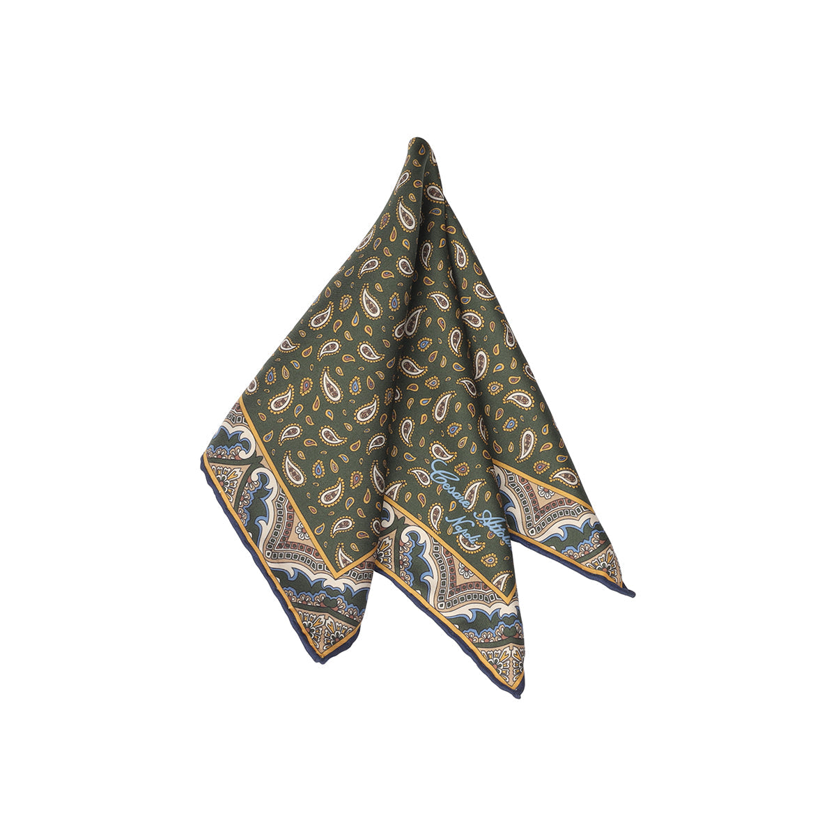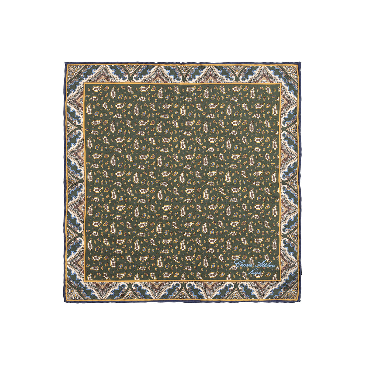 The Cesare Attolini pochette is a totally handmade product, from the single cut of the fabric to the manufacturing. This pochette with handmade hem in silk twill green background with yellow and beige cashmere pattern design with Cesare Attolini Napoli logo in light blue contrast, is perfect to complete your looks with a touch of style and refinement.