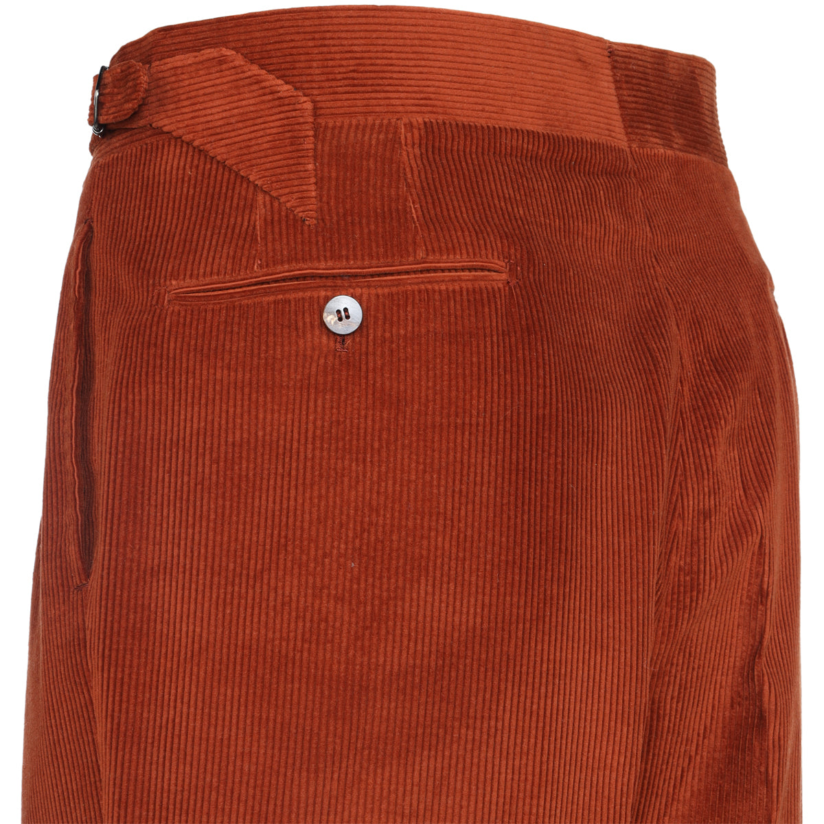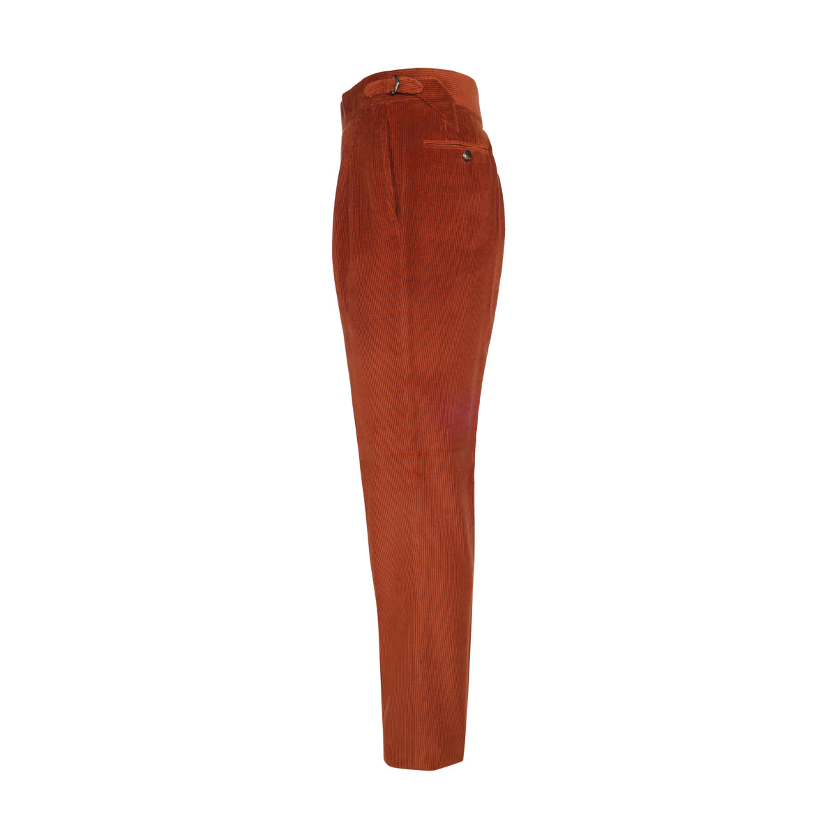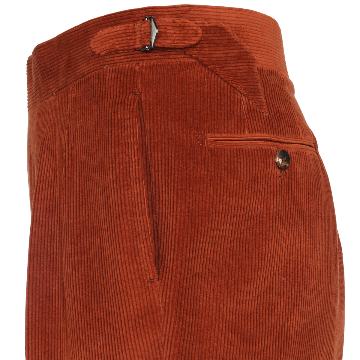 Corduroy trousers, made from 92% cotton and 8% wool, featured in a warm terracotta color. Entirely handcrafted by our master artisans in Casalnuovo, these trousers showcase French pleats and adjustable side straps, ensuring a tailored fit and refined details. The mock fly buttons and the extended waistband provide an additional distinctive detail. Perfect for those seeking a timeless style and impeccable comfort.