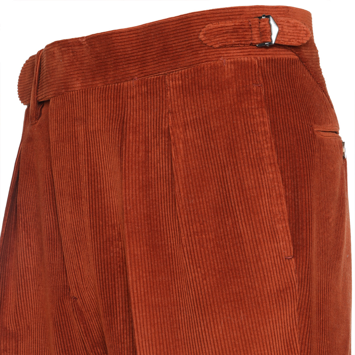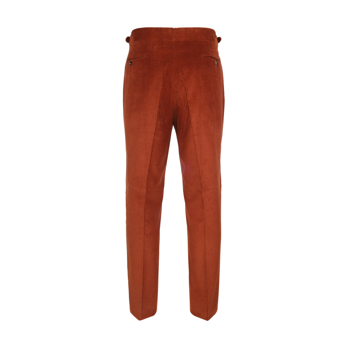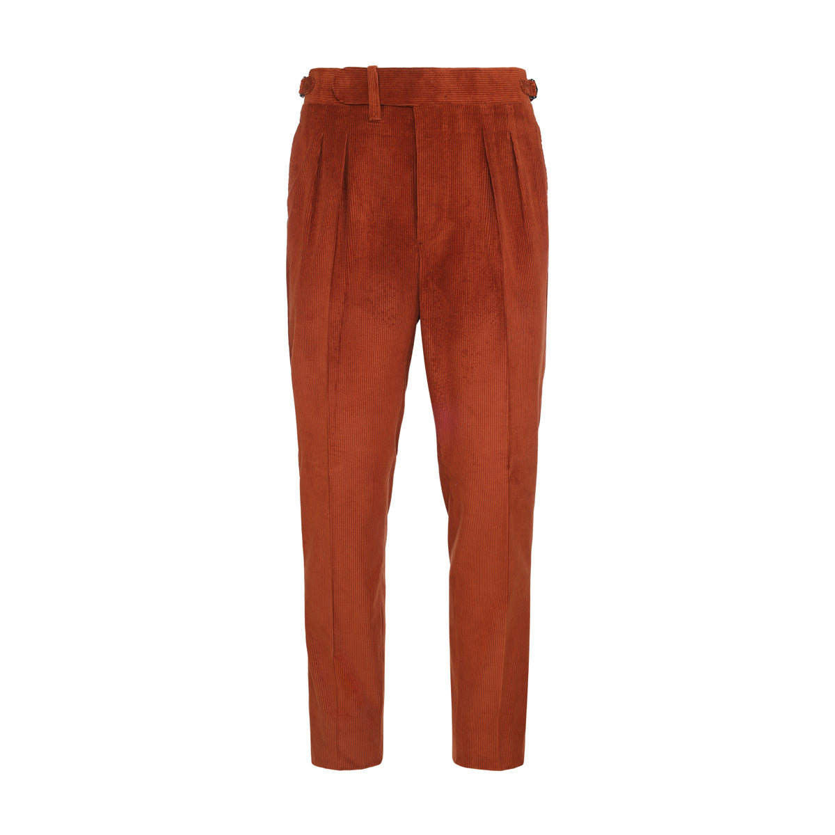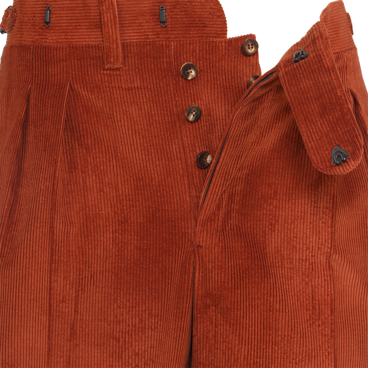 Corduroy trousers, made from 92% cotton and 8% wool, featured in a warm terracotta color. Entirely handcrafted by our master artisans in Casalnuovo, these trousers showcase French pleats and adjustable side straps, ensuring a tailored fit and refined details. The mock fly buttons and the extended waistband provide an additional distinctive detail. Perfect for those seeking a timeless style and impeccable comfort.