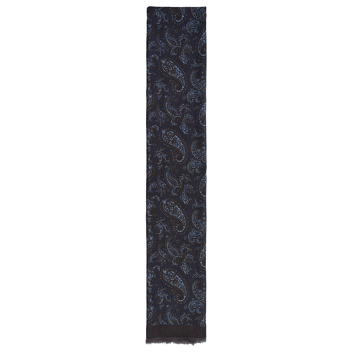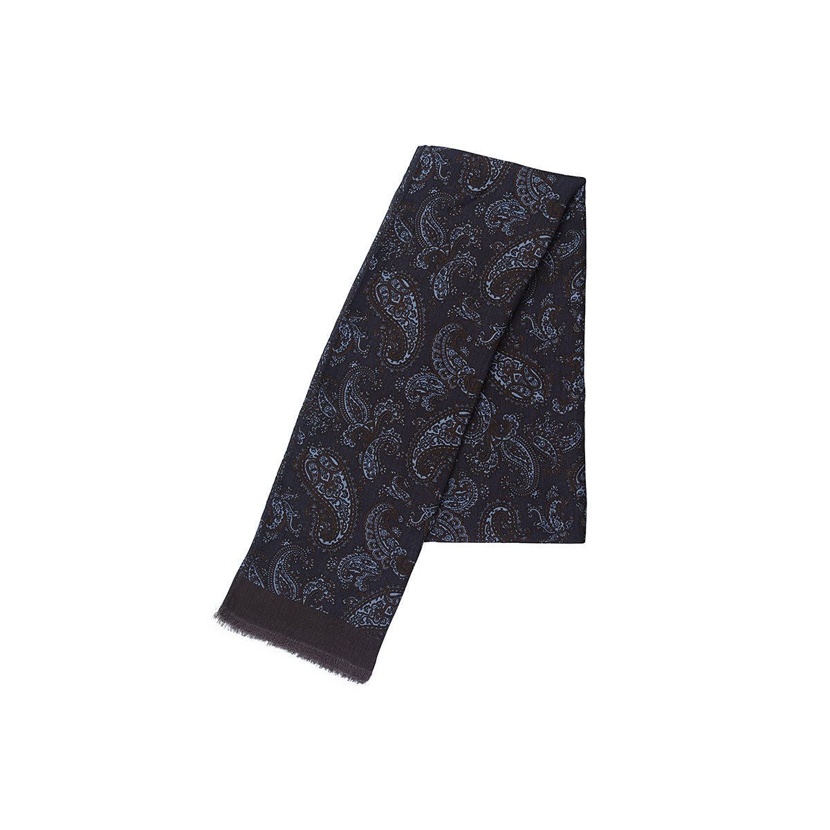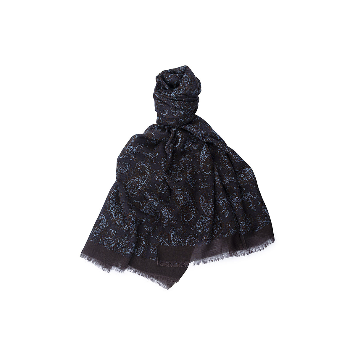 The cashmere and cotton scarf with small fringe on the edge is an accessory that combines the refinement of designs with original color combinations. This scarf is a perfect accessory to refine your look and is made with high quality fabrics. It stands out for the elegant print with cashmere design in brown and powder blue on a dark indigo background. A versatile accessory that completes formal attires and the sportiest outwear.