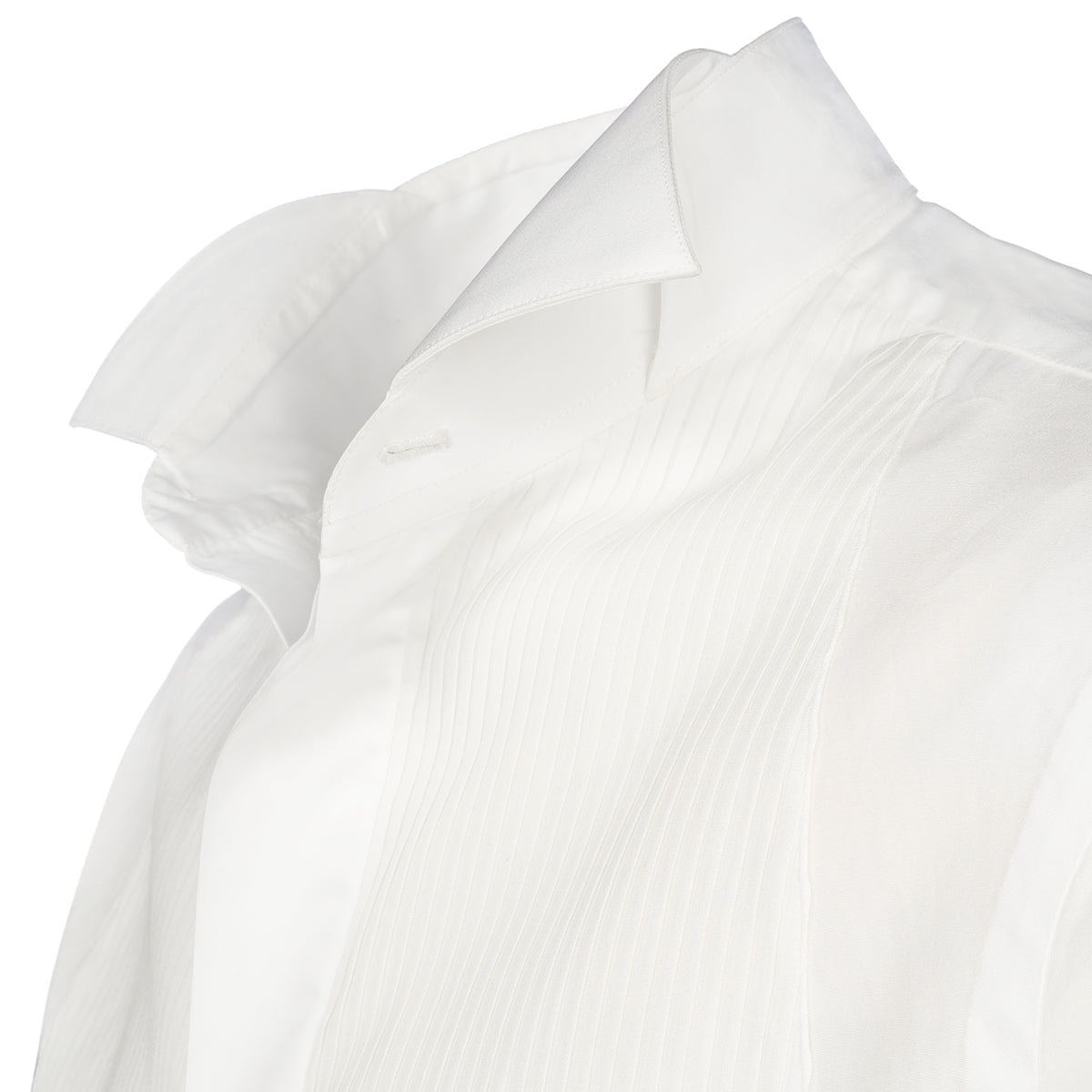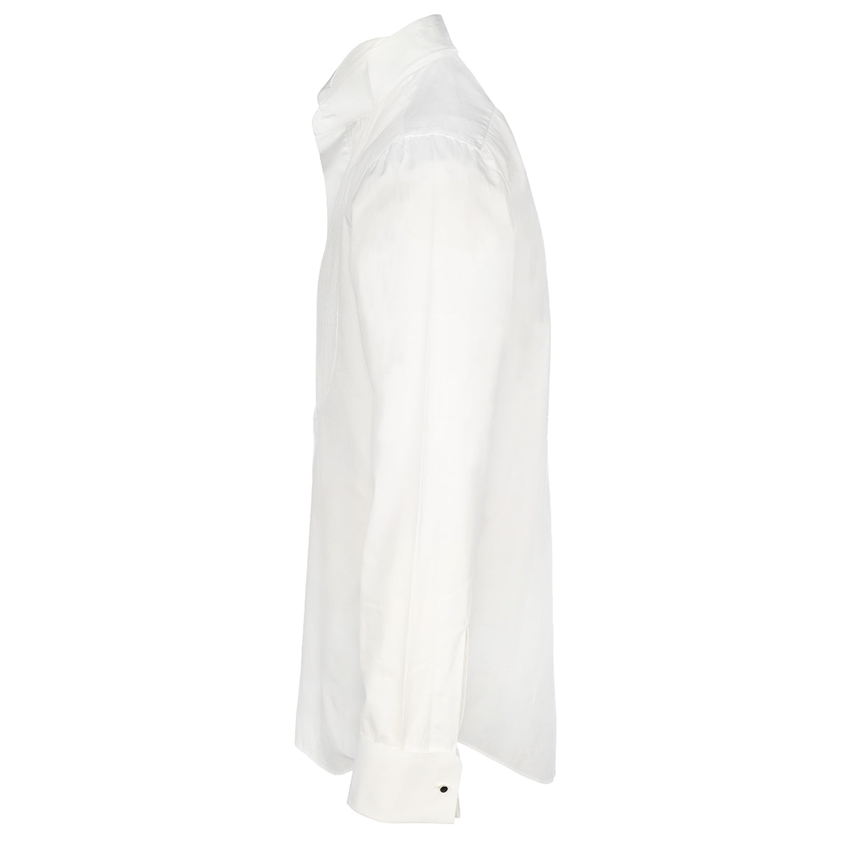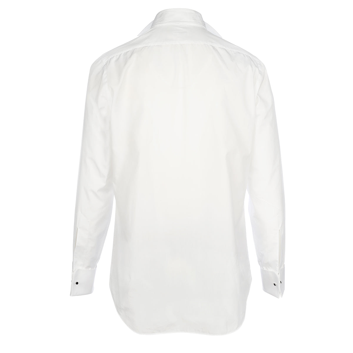 120/2 cotton shirt solid white with diplomatic collar, cufflinks and pleats. Entirely cut and sewn by hand by the skilled hands of our shirtmakers in our workshop. Made of high quality cotton. This shirt offers softness and a pleasant feeling of lightness on the skin. To be worn on important occasions.