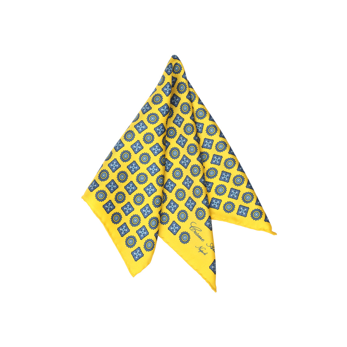 The Cesare Attolini pochette is a totally handmade product, from the single cut of the fabric to the manufacturing. This pochette with handmade hem in silk twill yellow background with blue and light blue geometric pattern with Cesare Attolini Napoli logo in blue contrast, is perfect to complete your looks with a touch of style and refinement.
