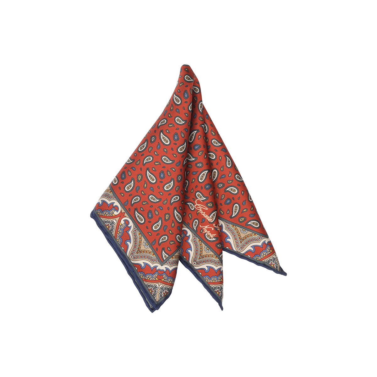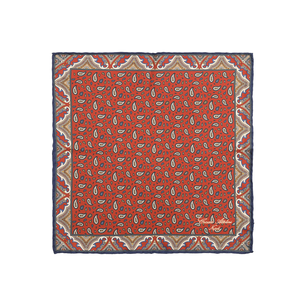 The Cesare Attolini pochette is a totally handmade product, from the single cut of the fabric to the manufacturing. This pochette with handmade hem in silk twill with rust background, gray and beige cashmere patterned design with Cesare Attolini Napoli logo in beige contrast, is perfect to complete your looks with a touch of style and refinement.