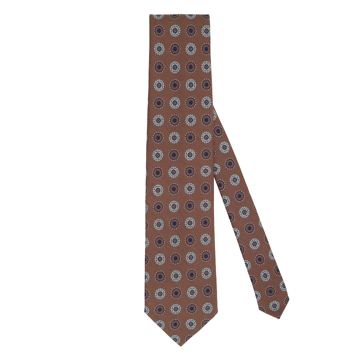 8.5 cm wide tie with brown background and blue and light blue circle pattern
