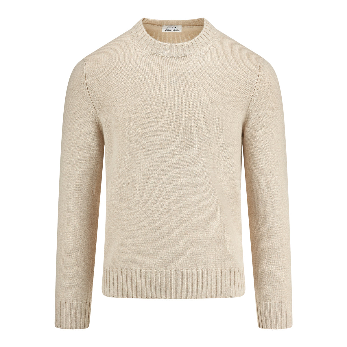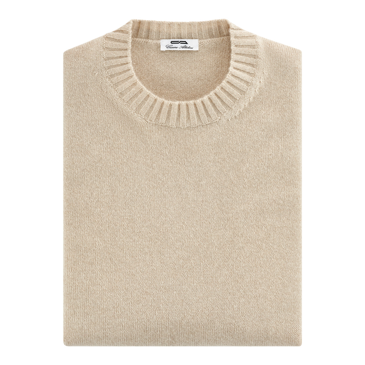 Beige crew neck cashmere sweater with ribbed neckline, cuffs and hemline.