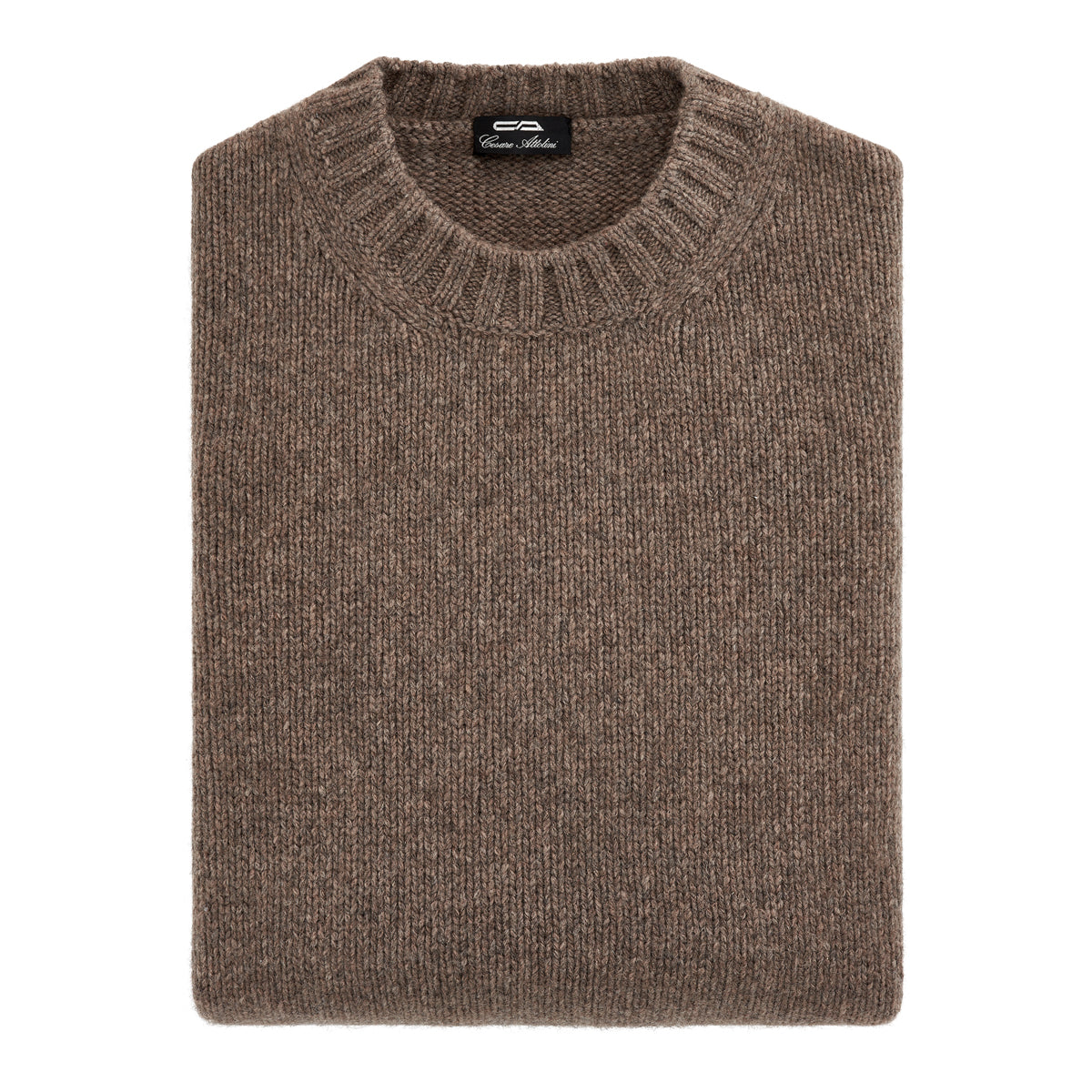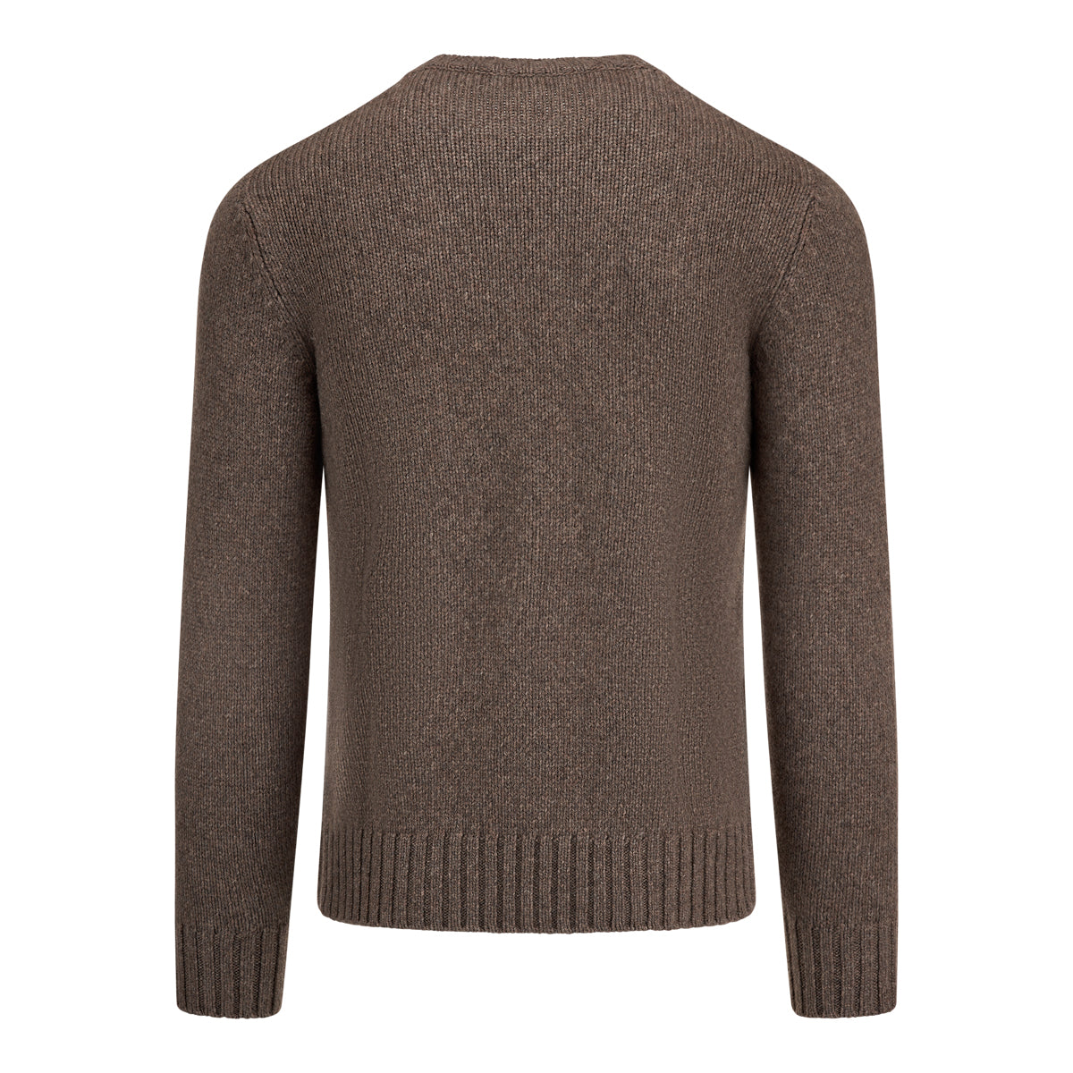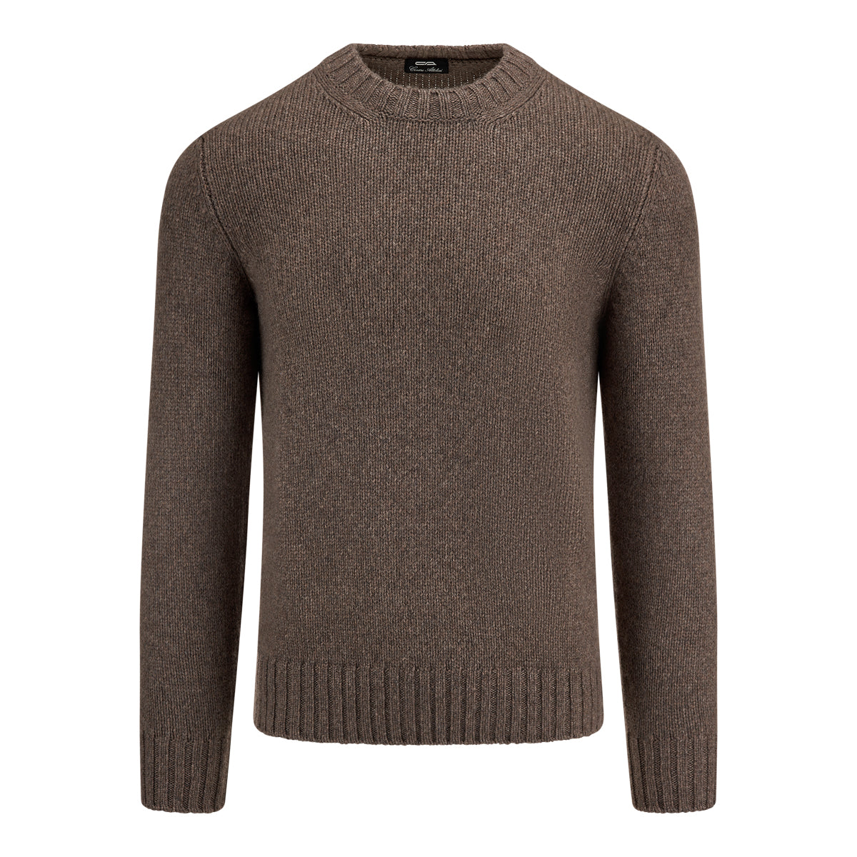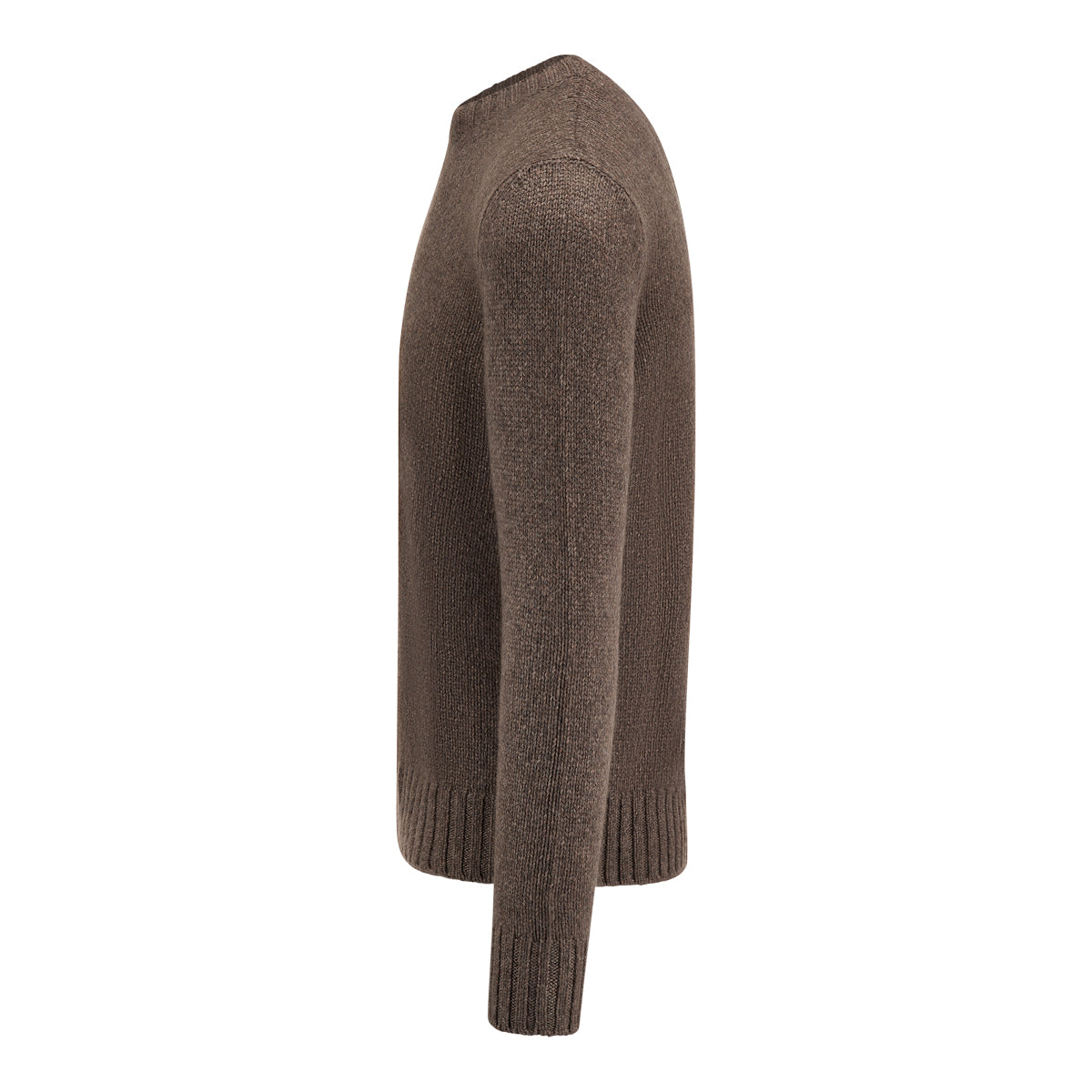 Taupe mélange heavy cashmere stockinette stitch crew neck sweater. Ribbed neckline and cuffs.