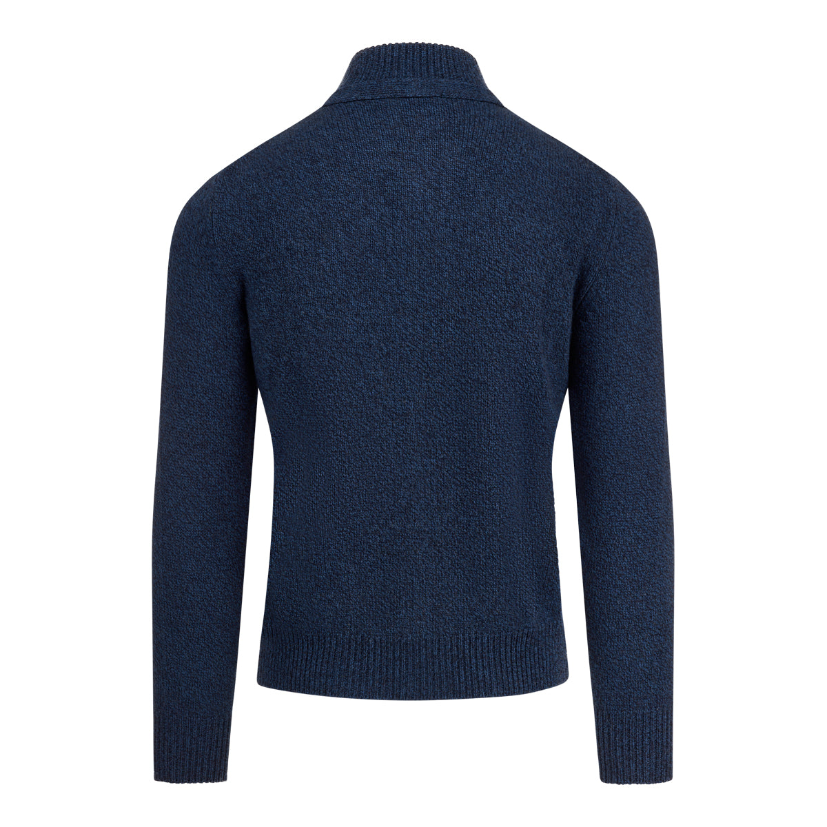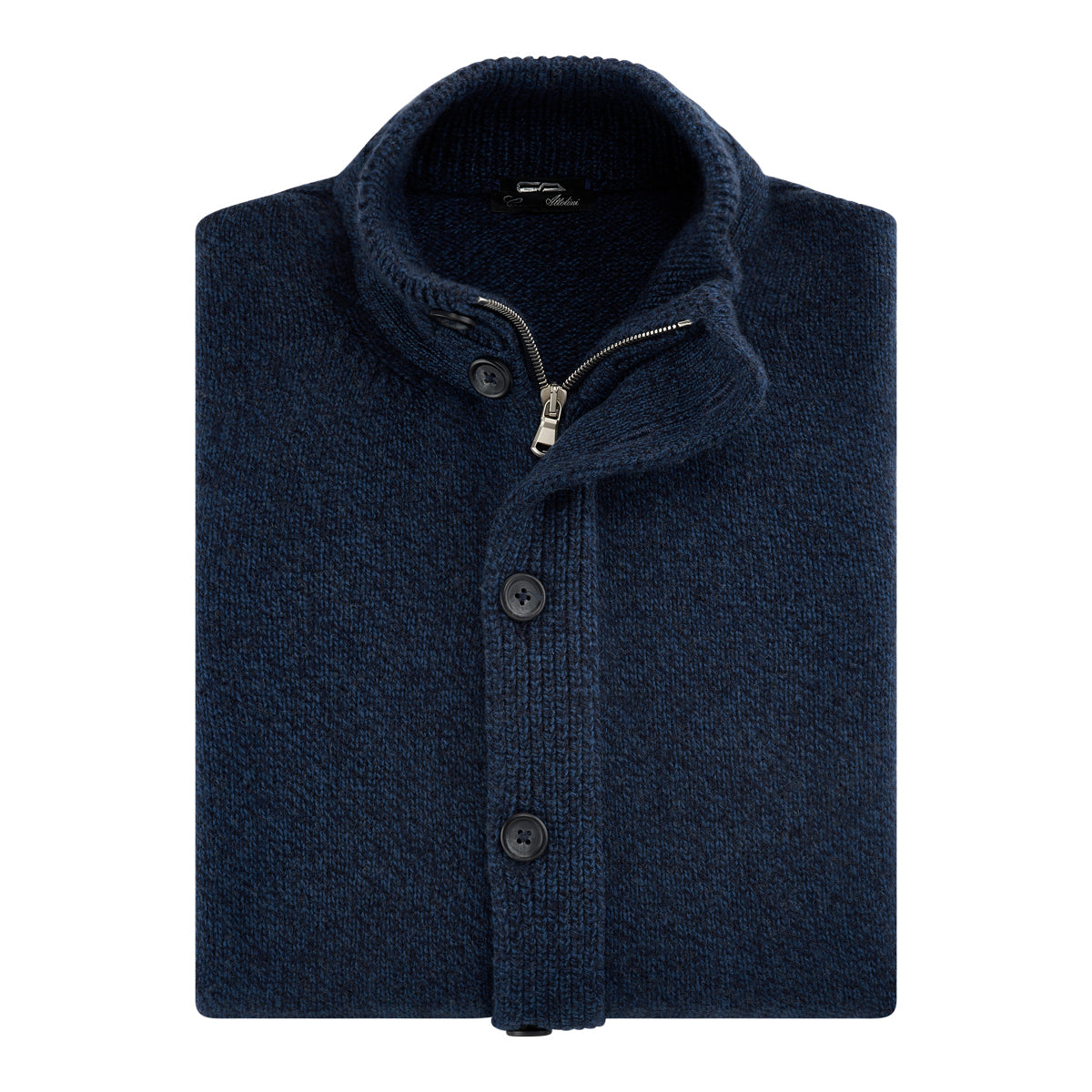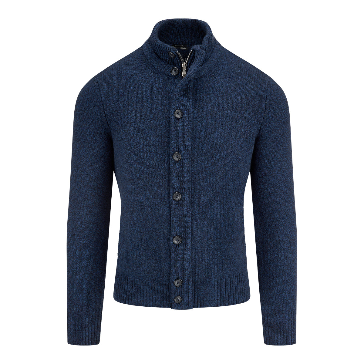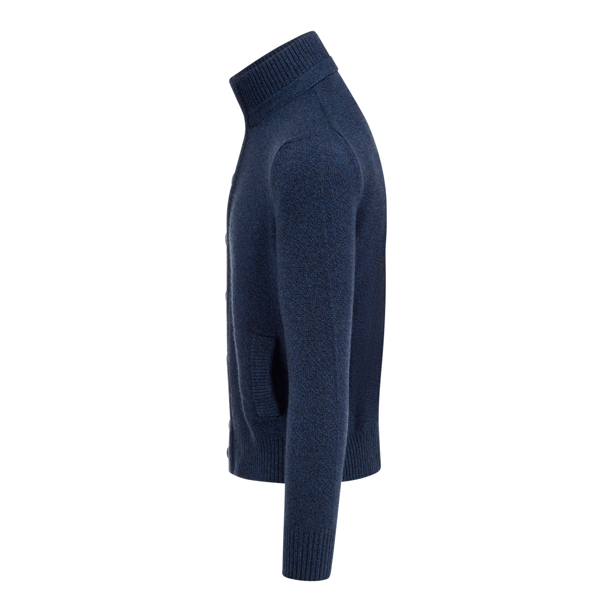Blue mélange bomber in cashmere with horn buttons and double slider zipper. Two side pockets. Ribbed neckline, cuffs, hem and pockets.
