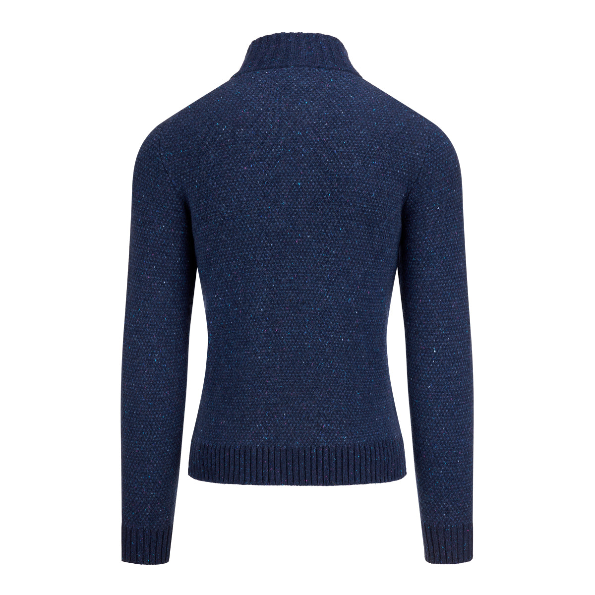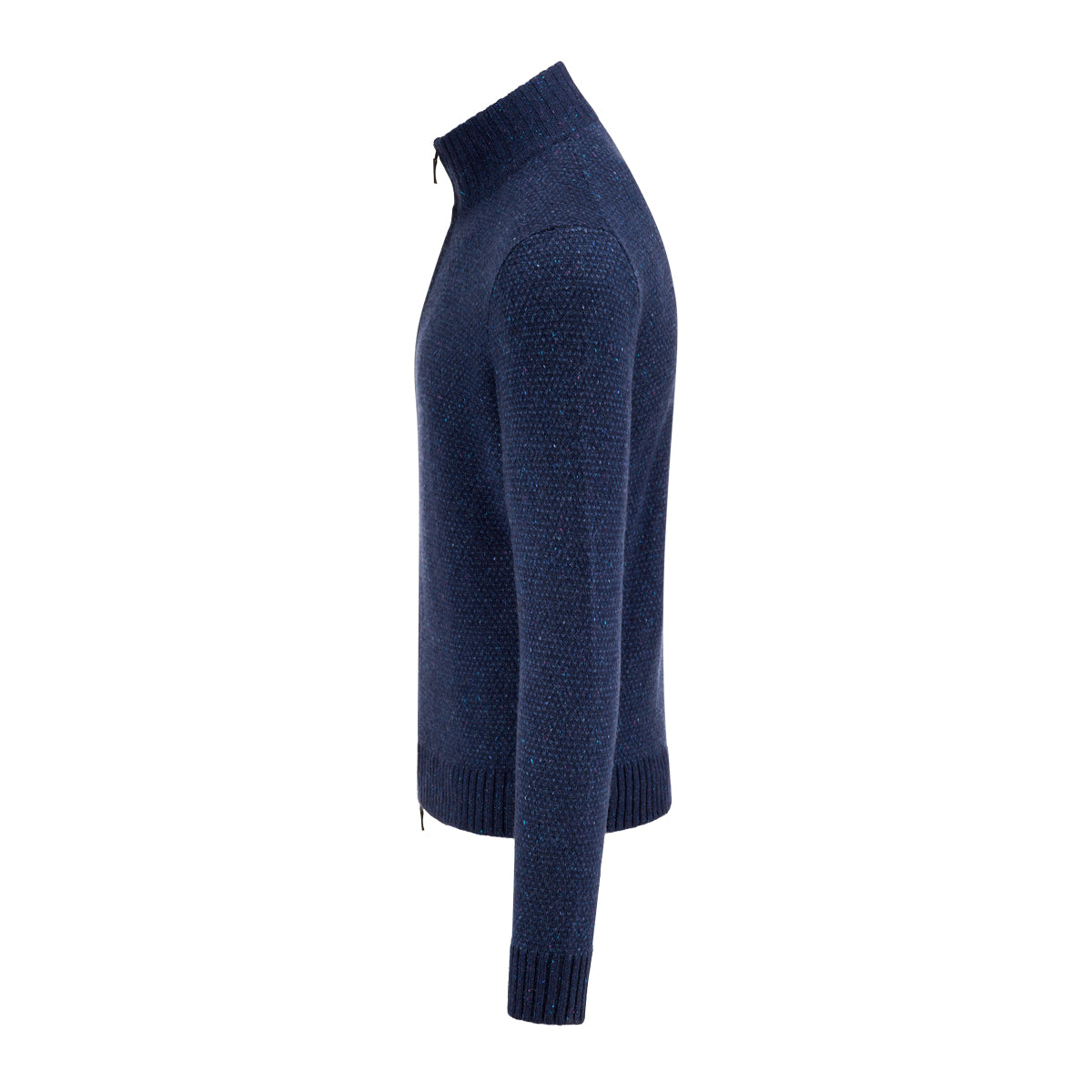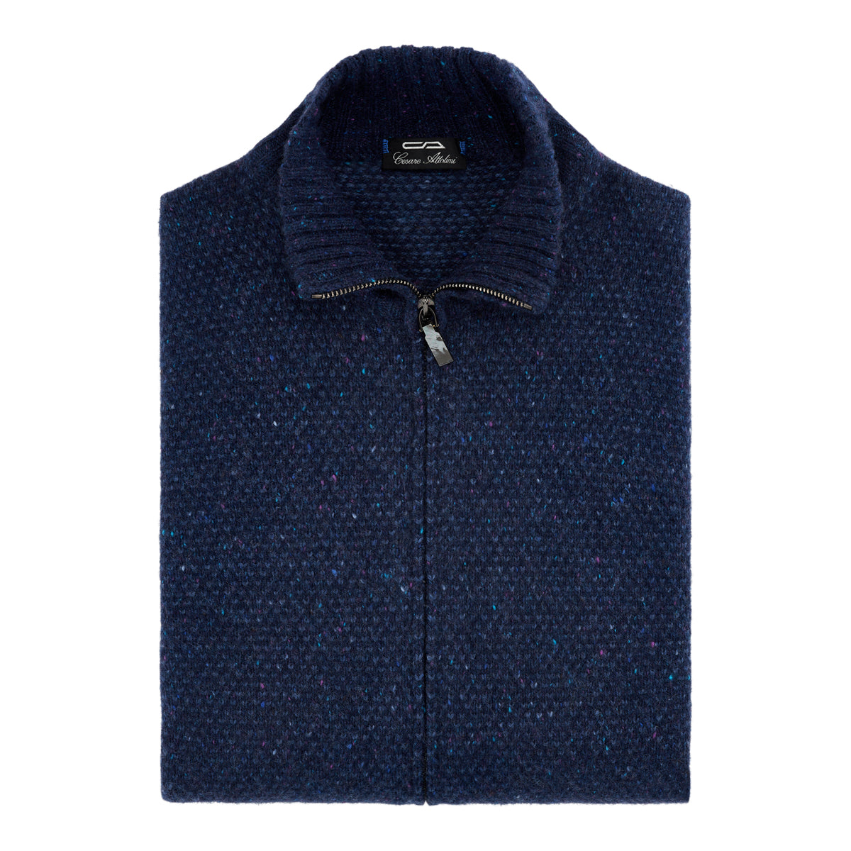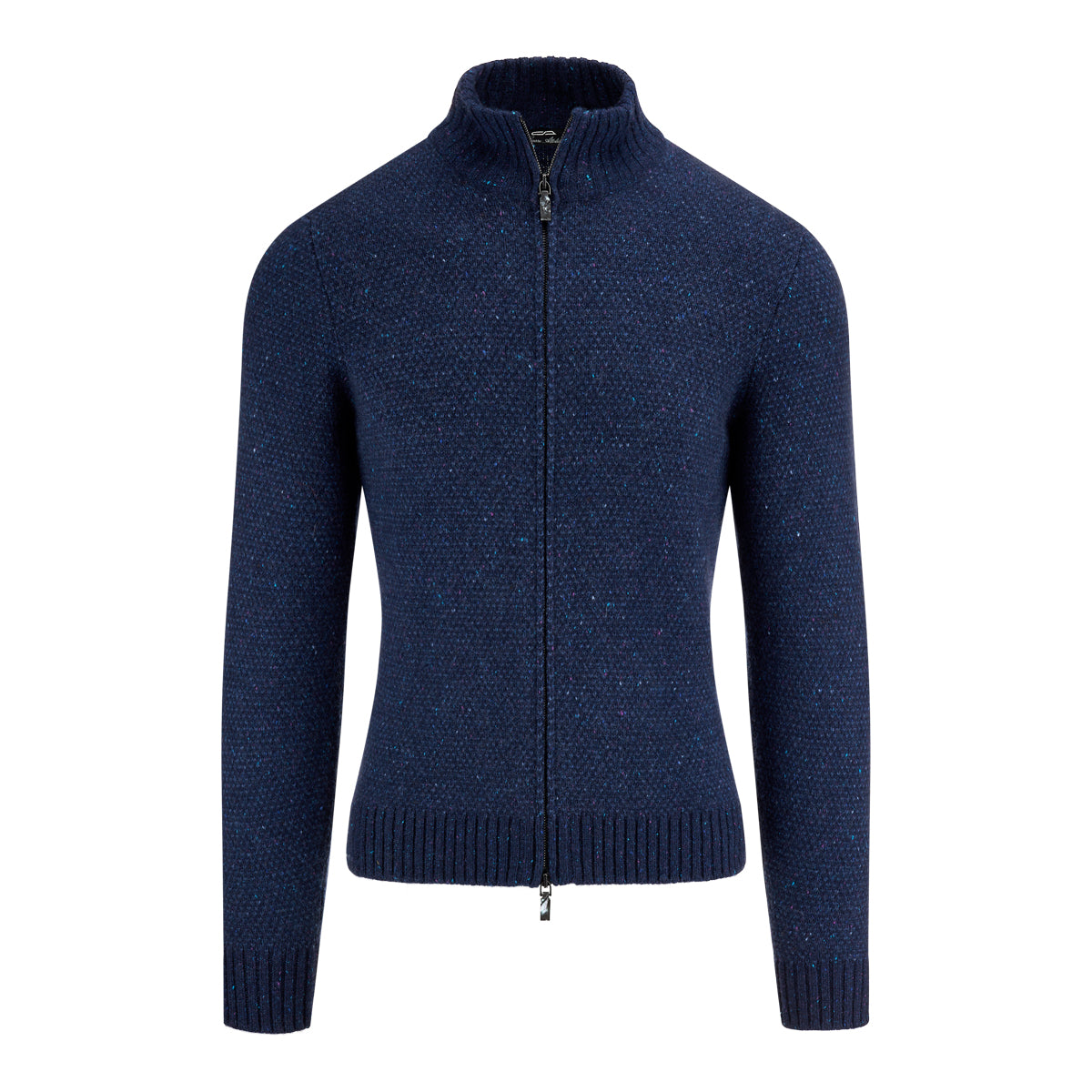 Blue Donegal print full zip bomber with navy/turquoise/pink accent colors. Two-way zipper in gray mother of pearl pull tabs. Ribbed neckline, cuff and hemline.