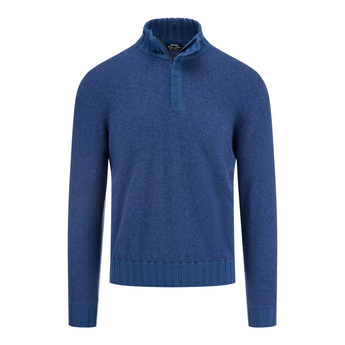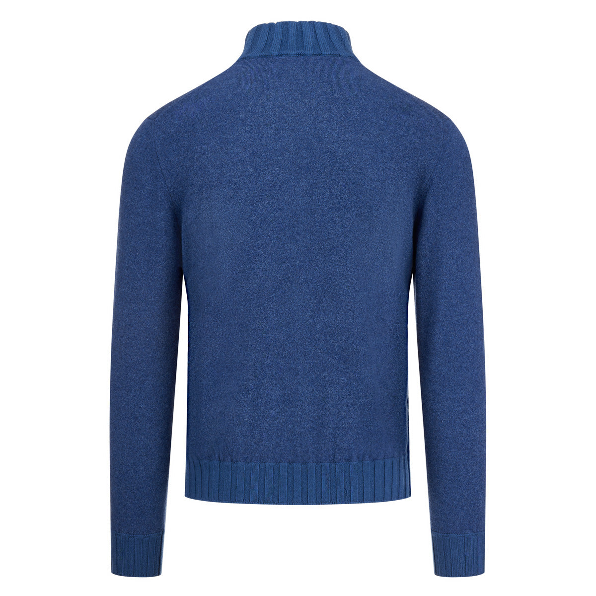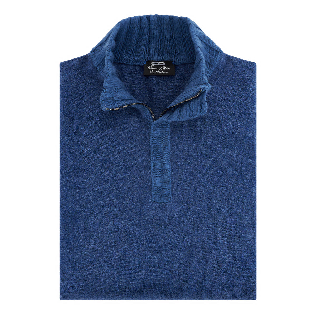 Serafina with long sleeve zip in blue. Ribbed collar, cuffs and hem. This garment is made in our artisan workshop on the shores of Lake Trasimeno. The precious pure combed cashmere yarn and the exclusive Duvet manufacturing make our garment unique, soft and comfortable. It is ideal for a leisure look, guaranteeing comfort and practicality.