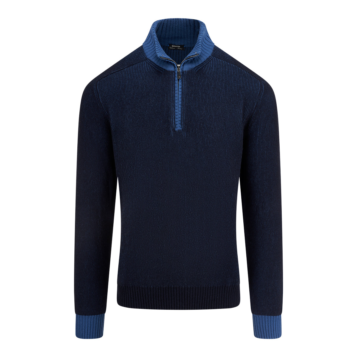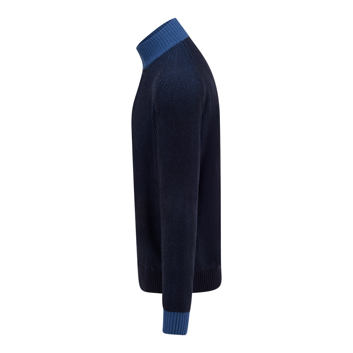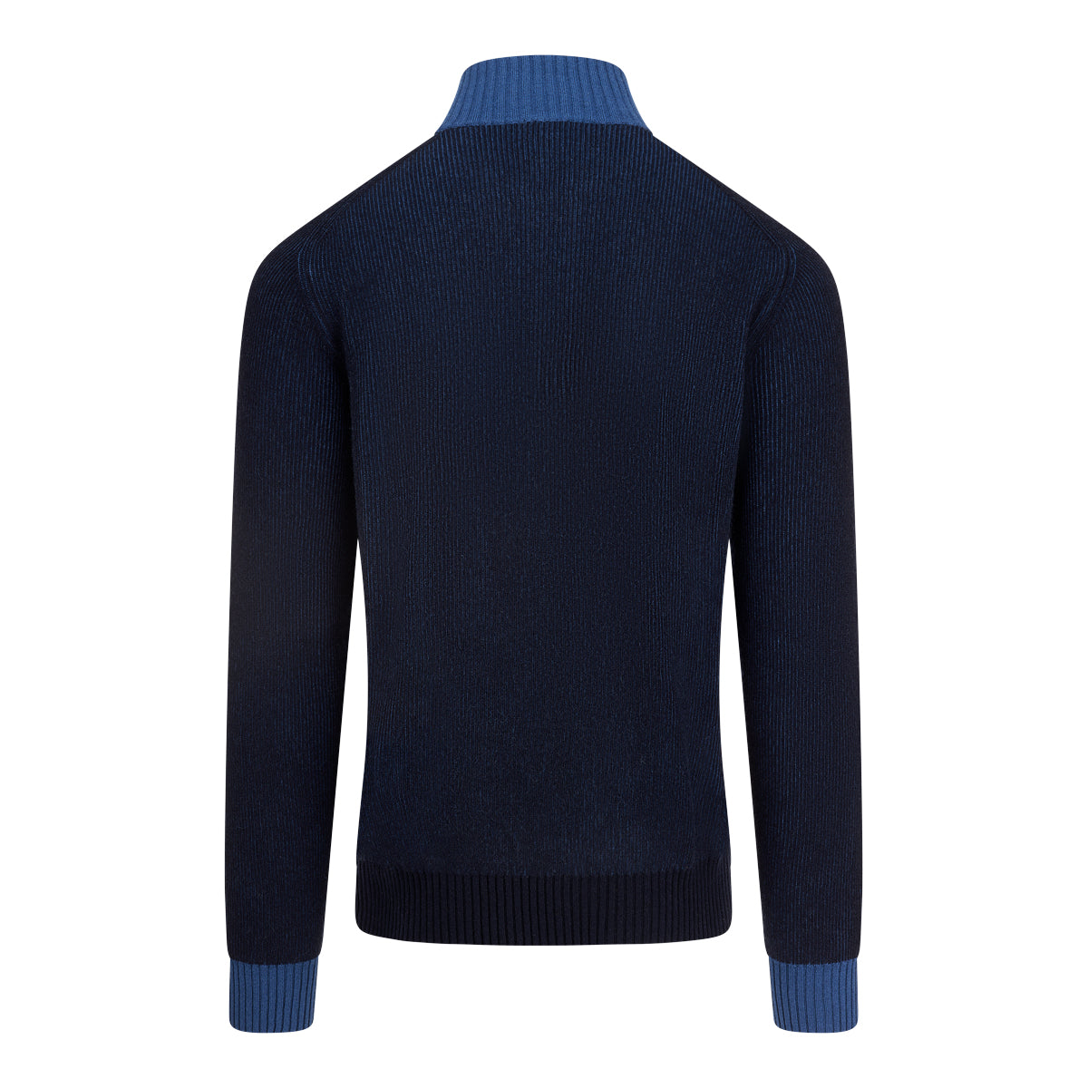 Two tones ribbed quarter zip sweater in blue with contrasting collar and cuffs.