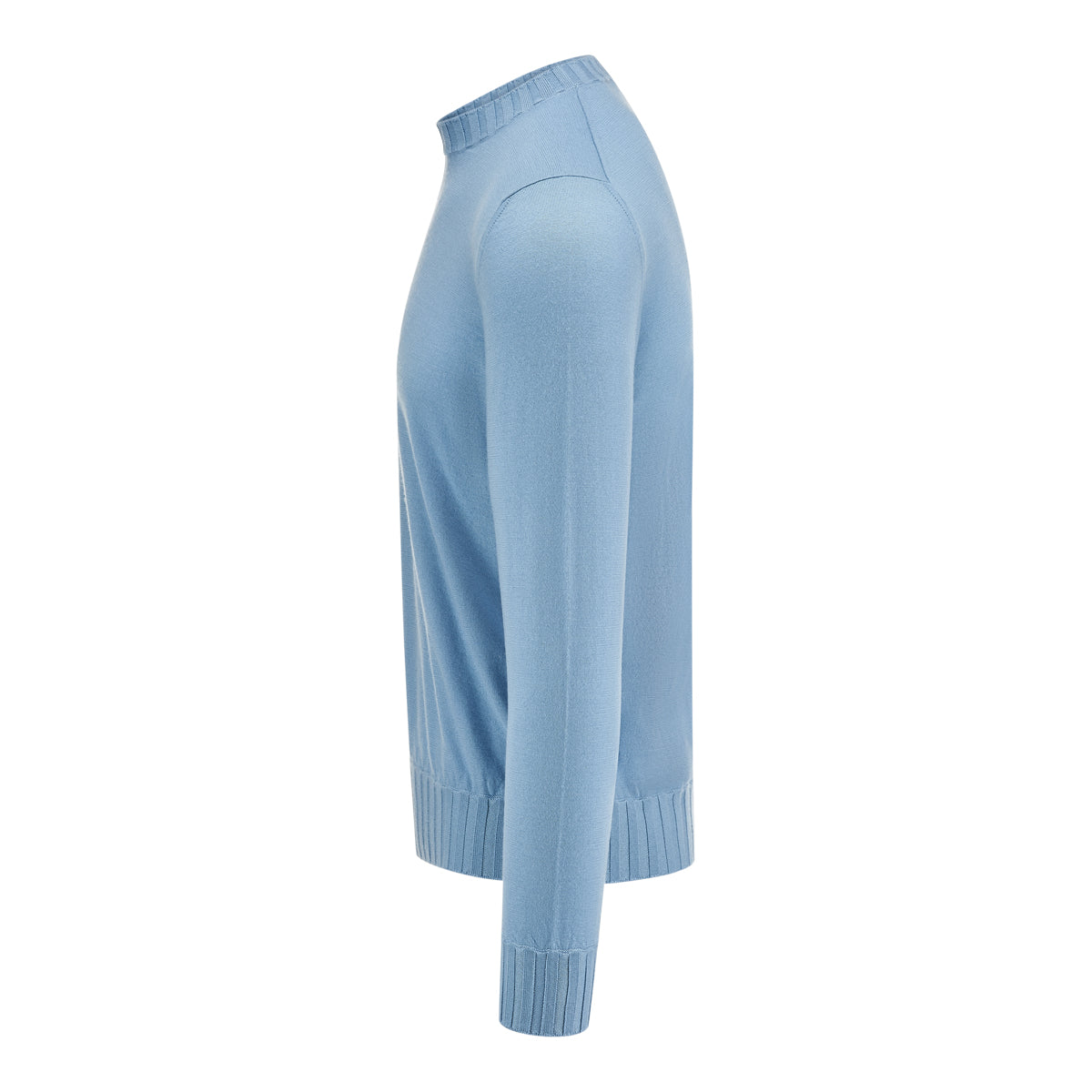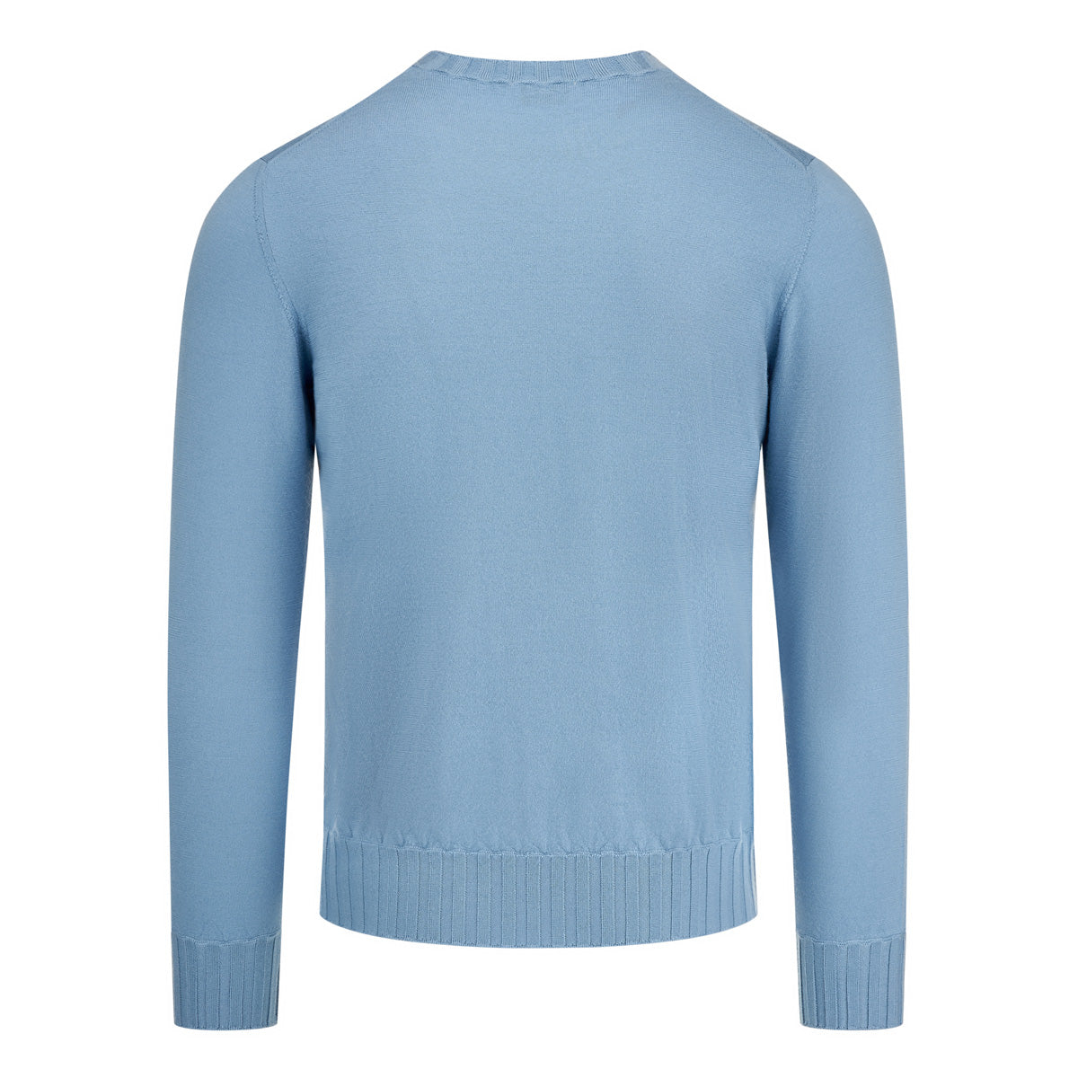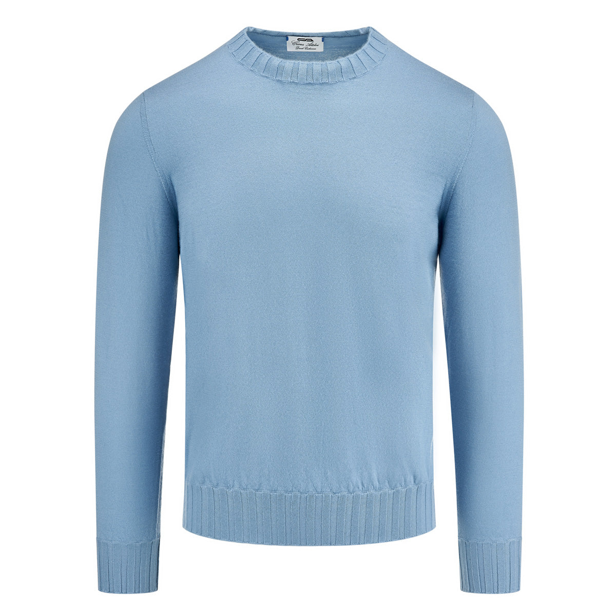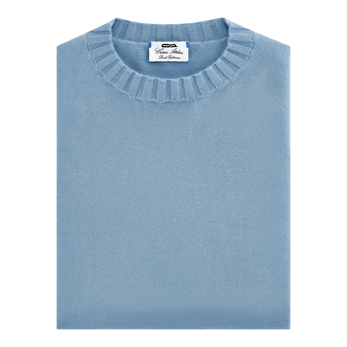 Light blue duvet cashmere crew neck with ribbed neckline, cuffs and hemline.