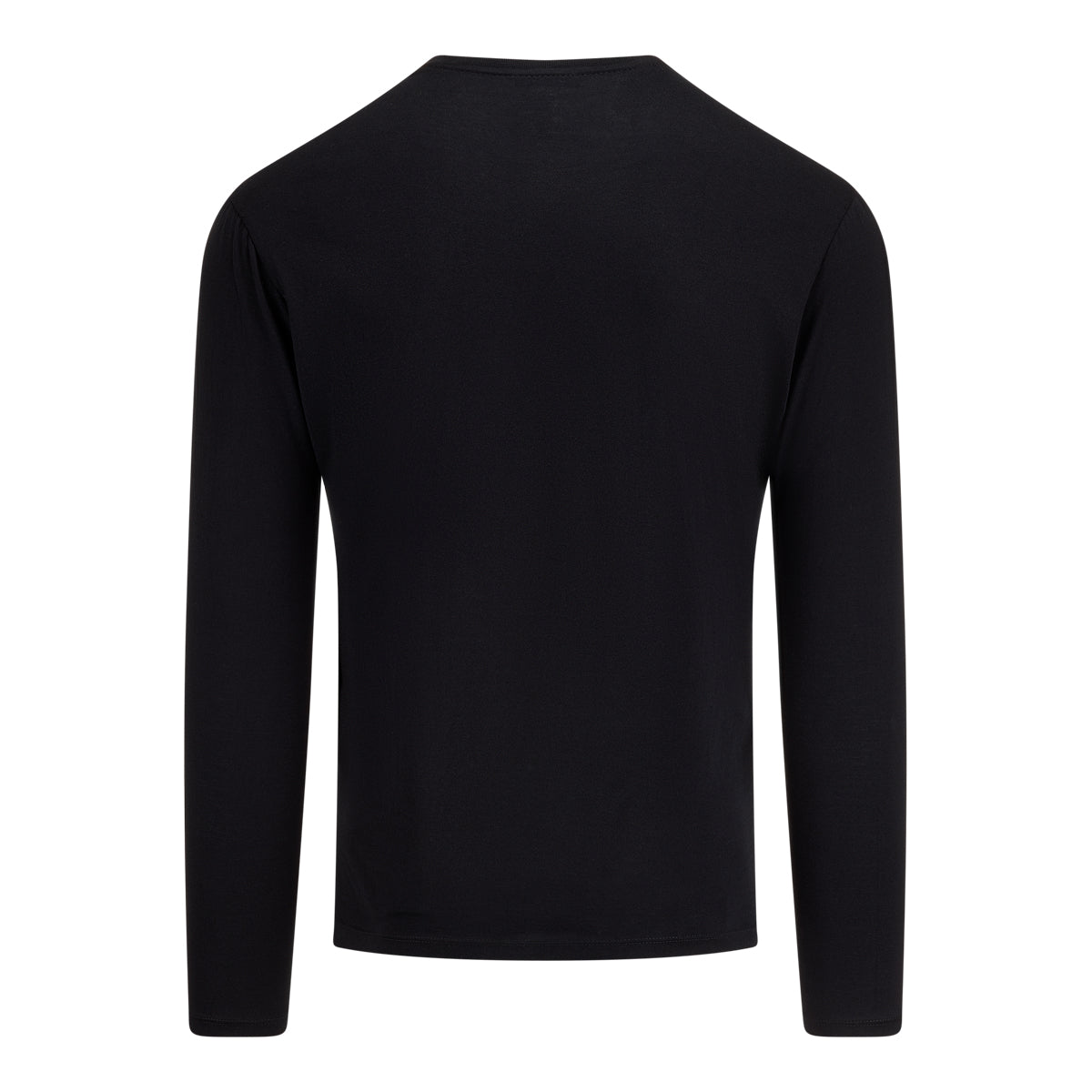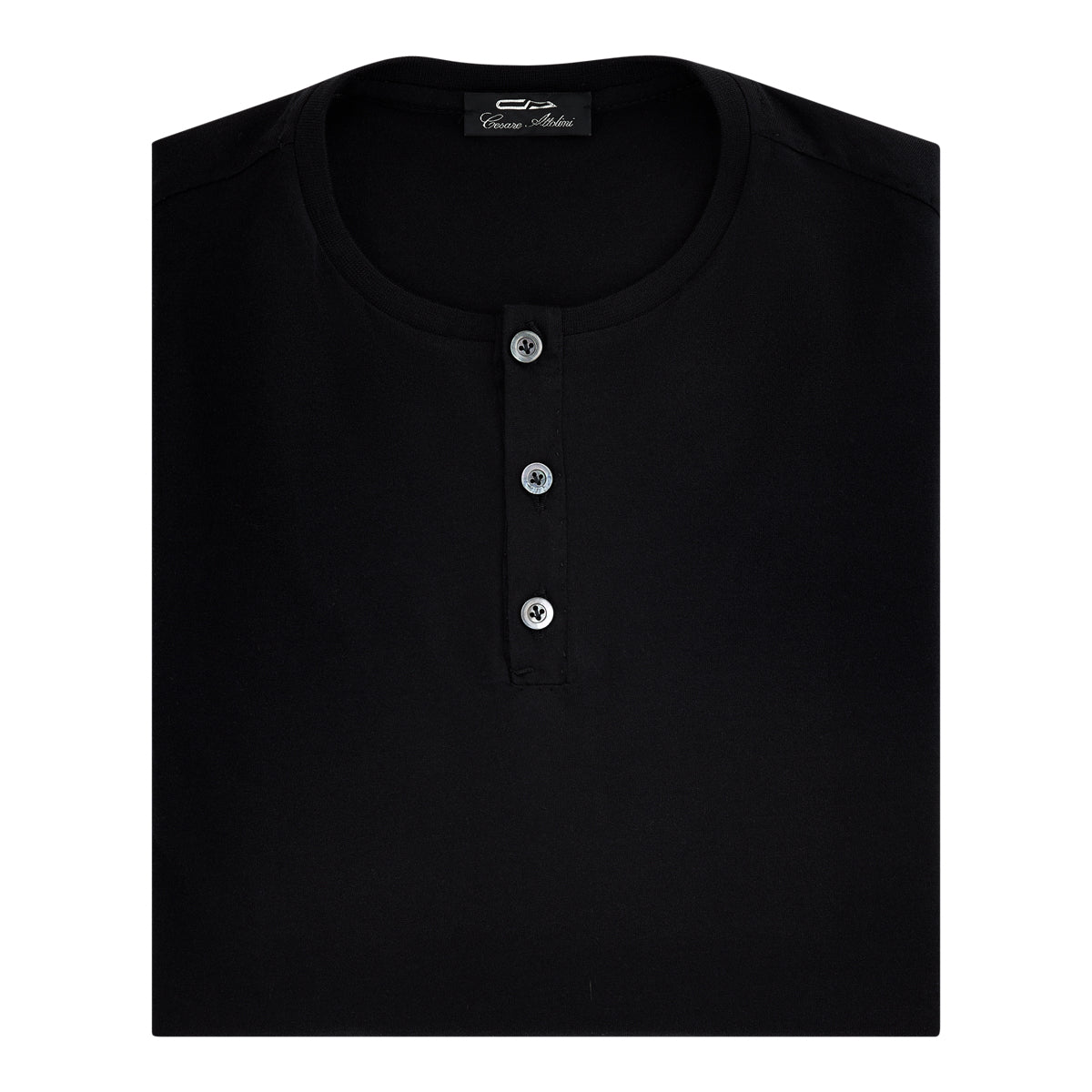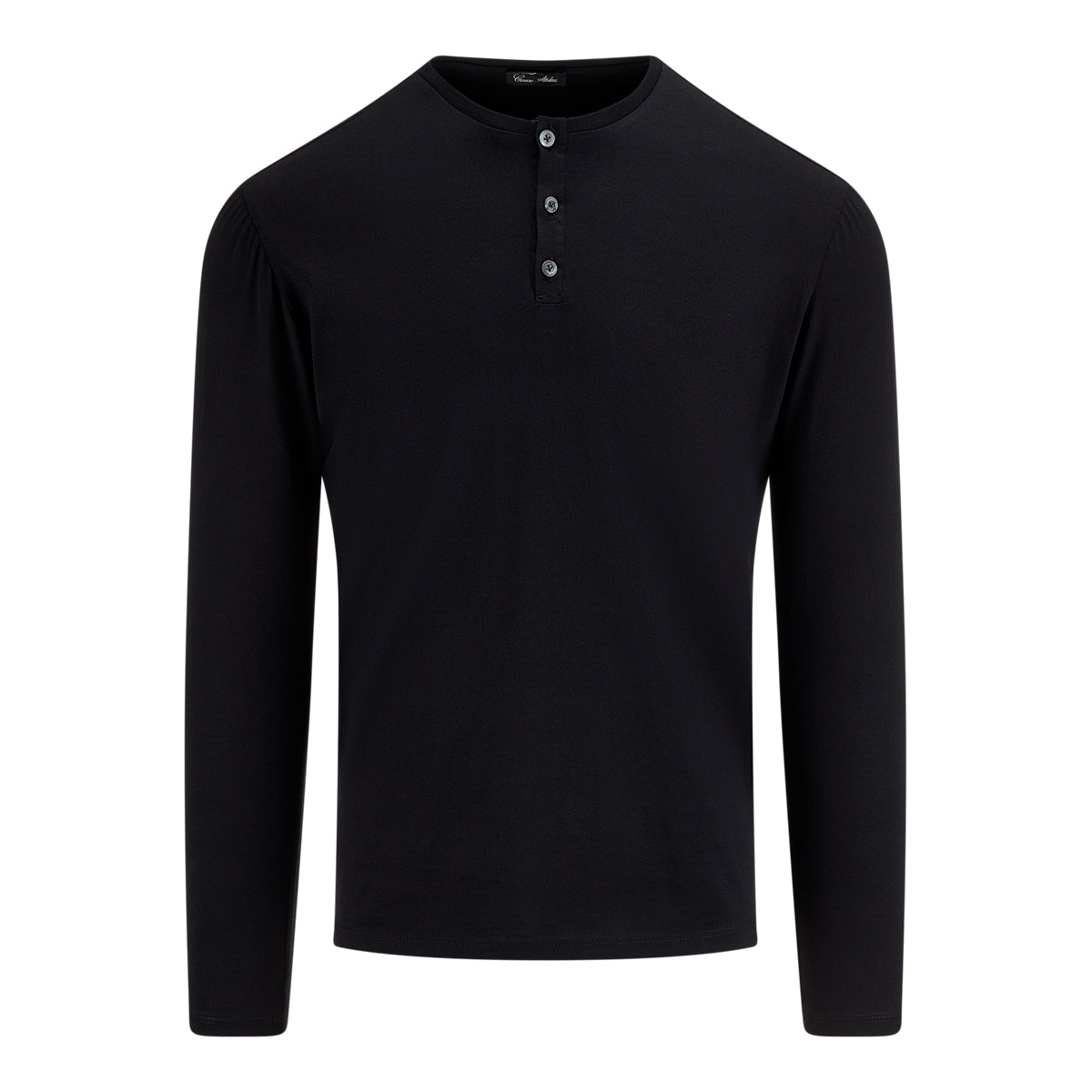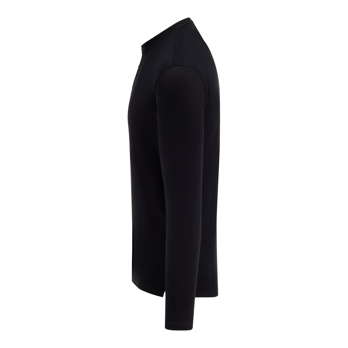 Black Giza cotton long sleeve Henley T-shirt with two side splits.