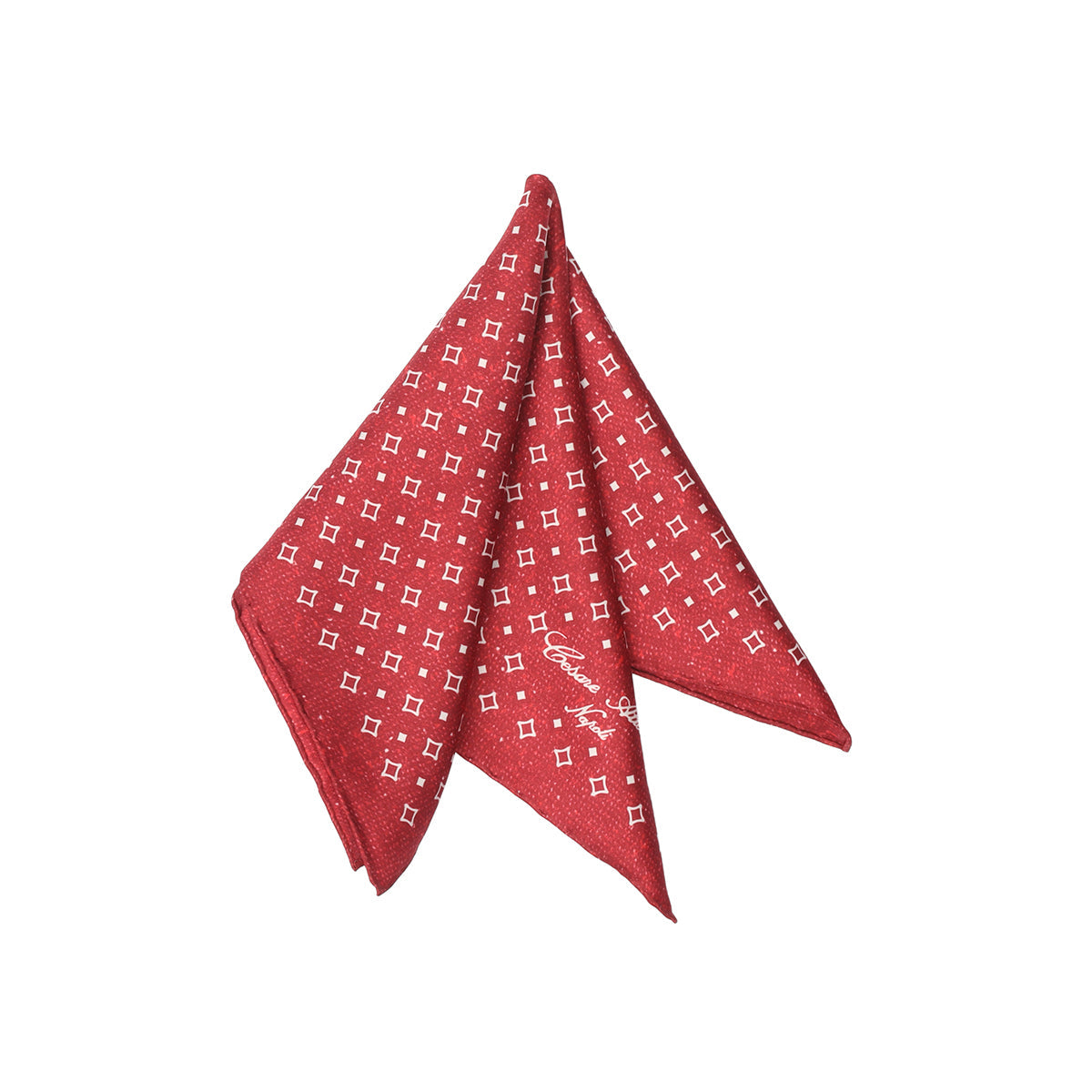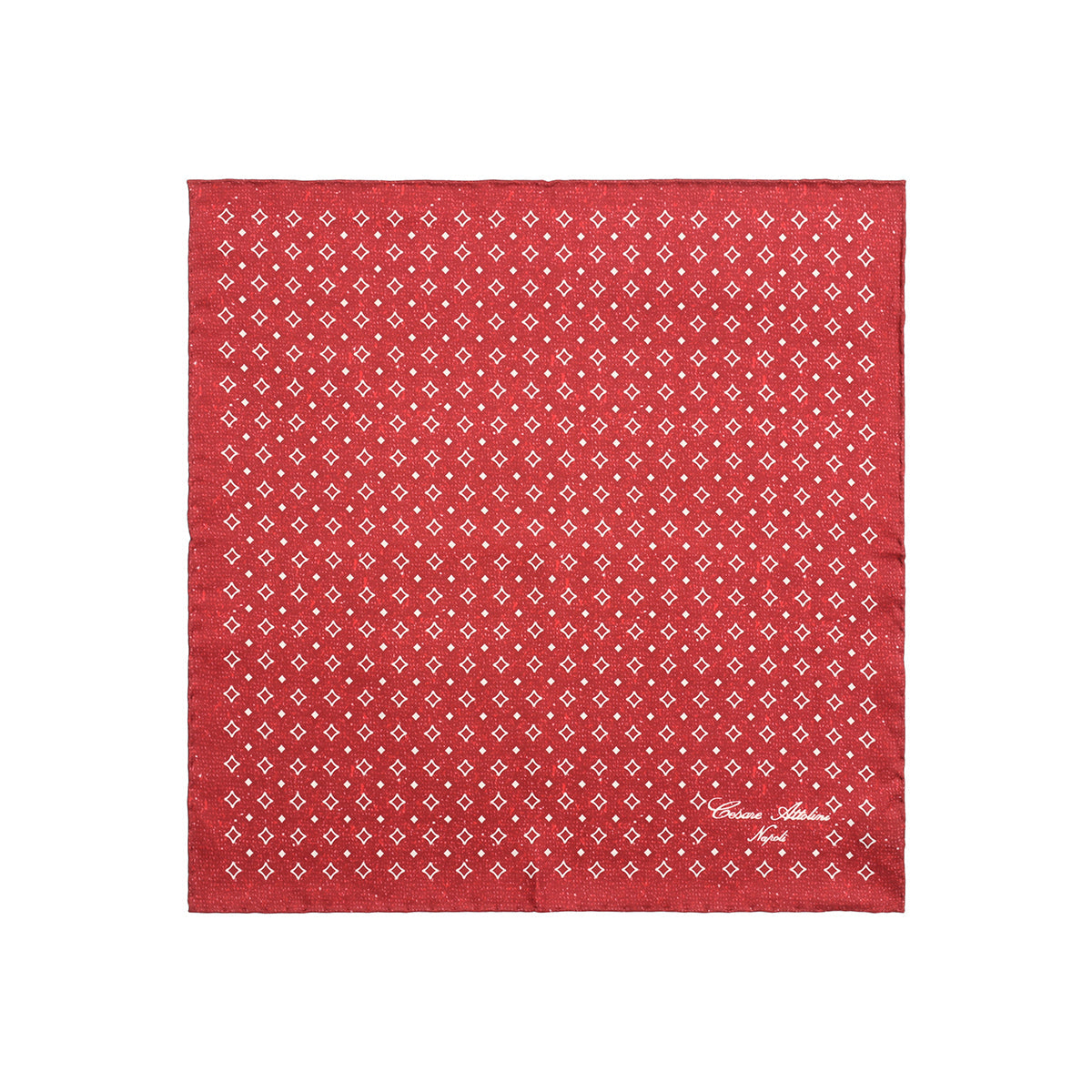 The Cesare Attolini pochette is a totally handmade product, from the single cut of the fabric to the manufacturing. This pochette with handmade hem in silk twill red background geometric design with Cesare Attolini Napoli logo in white contrast, is perfect to complete your looks with a touch of style and refinement.