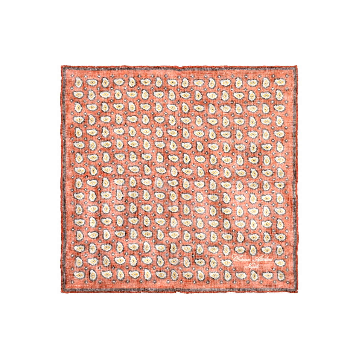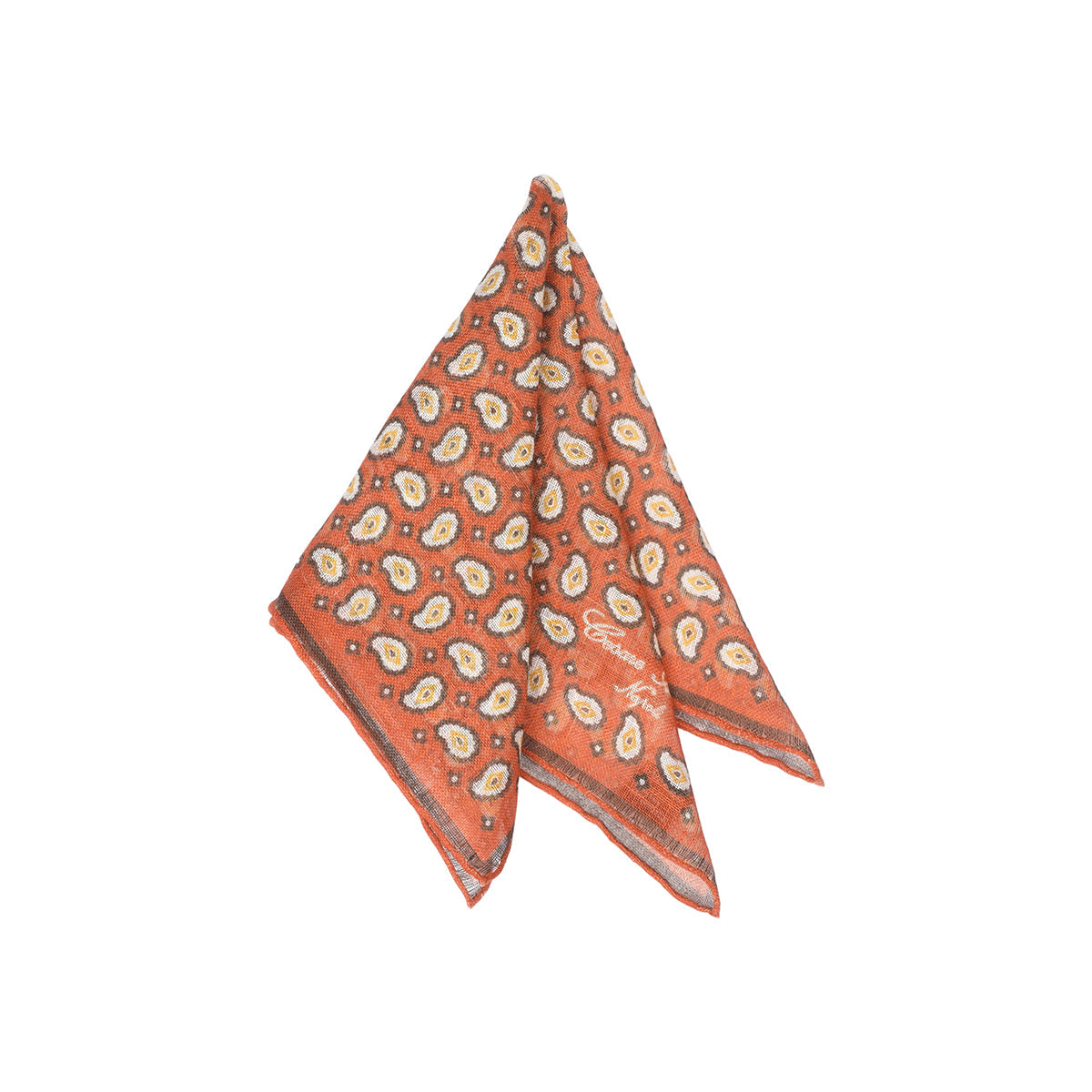 The Cesare Attolini pochette is a totally handmade product, from the single cut of the fabric to the manufacturing. This pochette with handmade hem in linen orange background patterned brown, white and yellow cashmere design with contrasting brown border with Cesare Attolini Napoli logo in white contrast, is perfect to complete your looks with a touch of style and refinement.