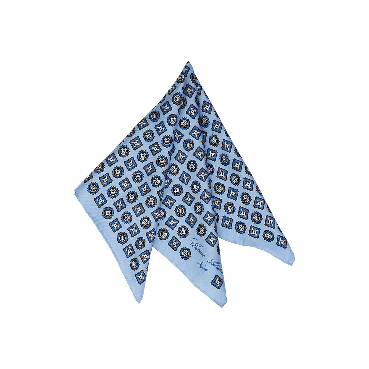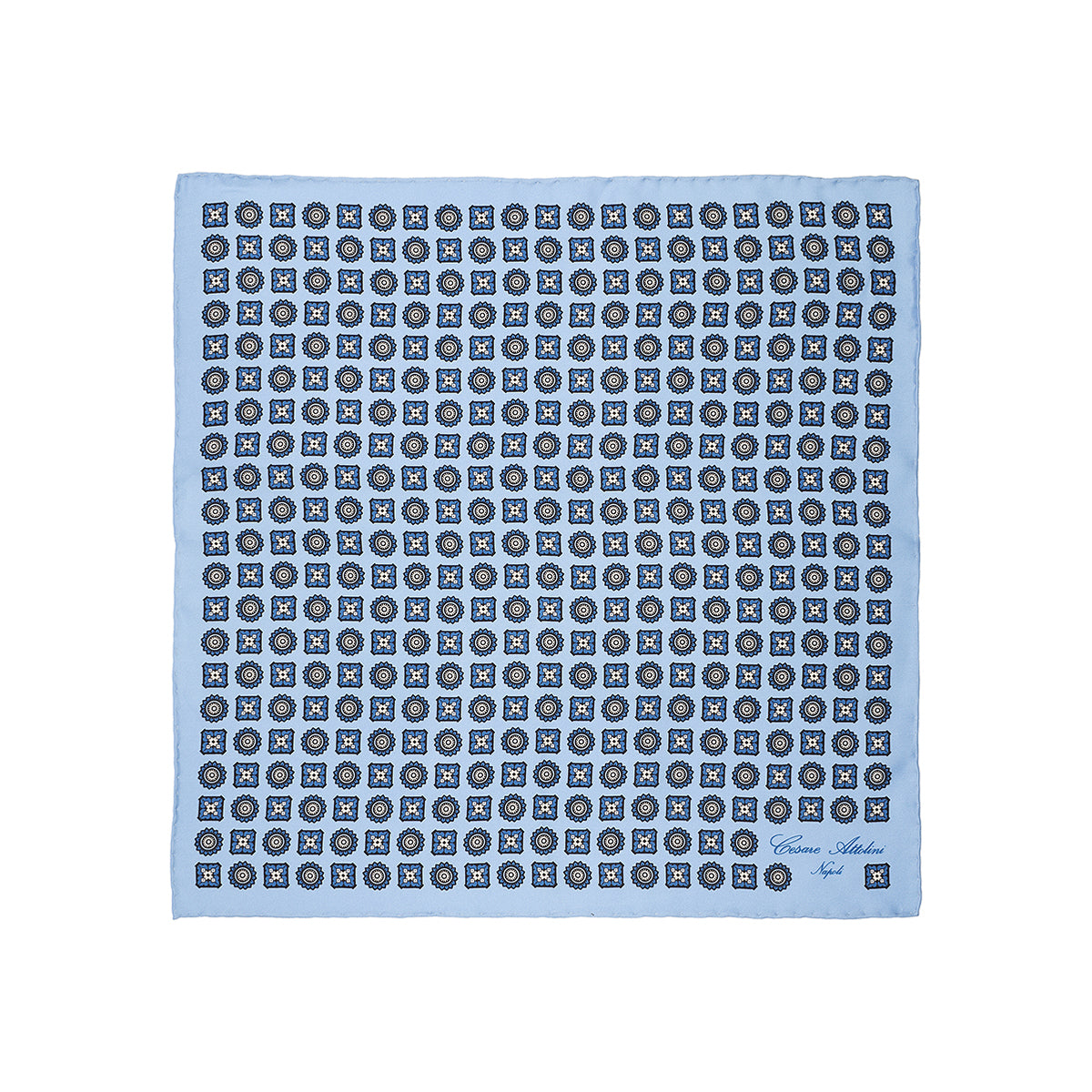 The Cesare Attolini pochette is a totally handmade product, from the single cut of the fabric to the manufacturing. This pochette with handmade hem in silk light blue background with blue geometric pattern, is perfect to complete your looks with a touch of style and refinement.