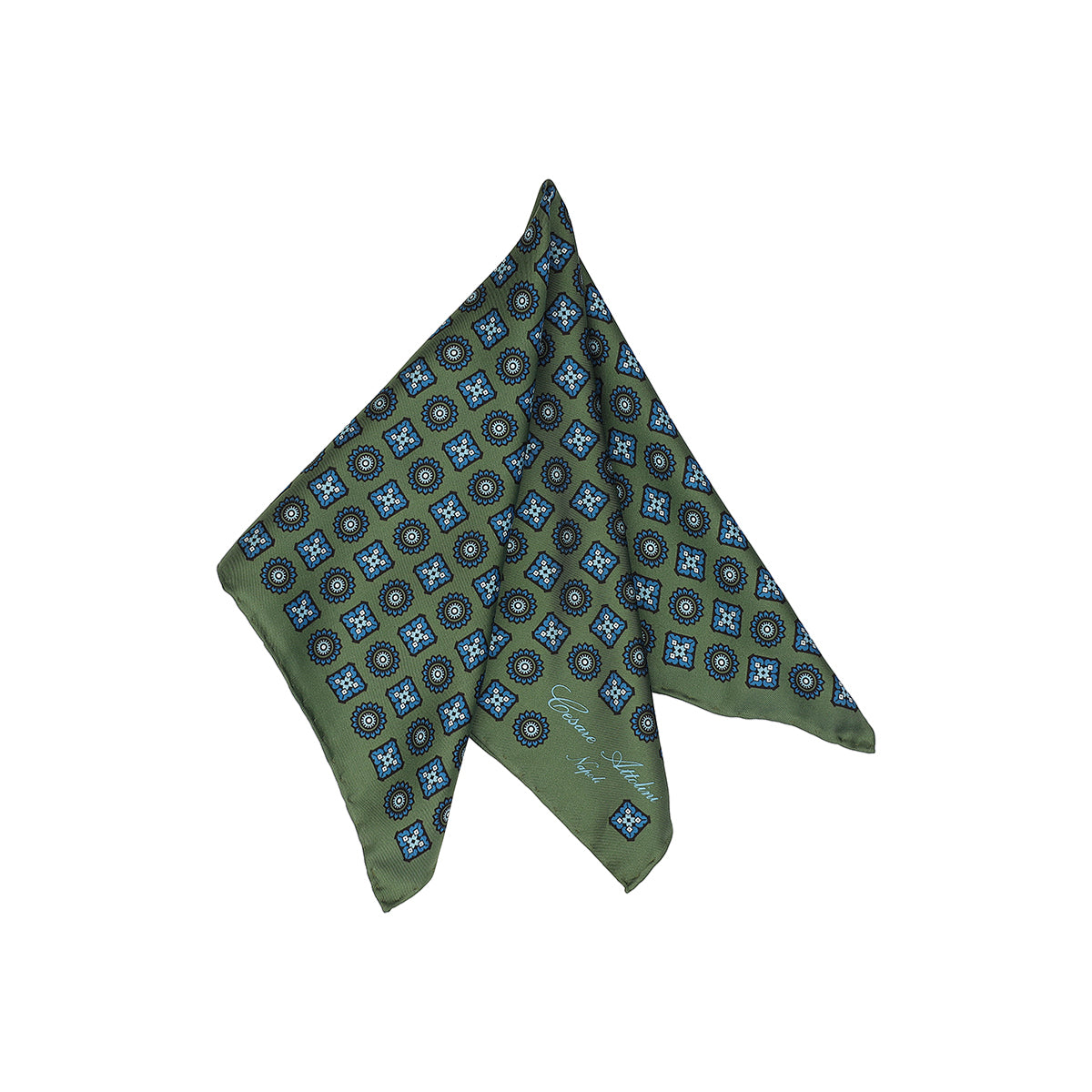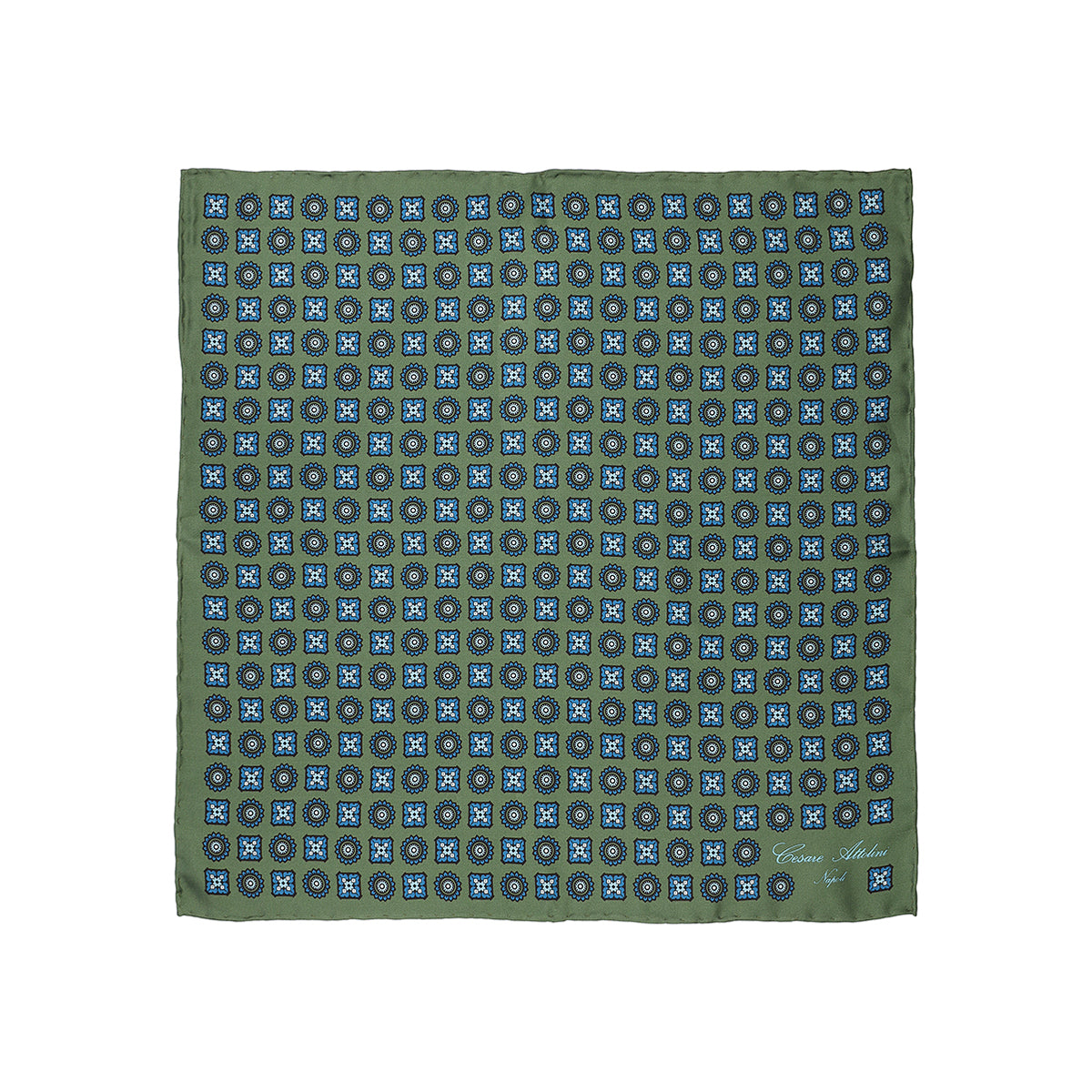 The Cesare Attolini pochette is a totally handmade product, from the single cut of the fabric to the manufacturing. This pochette with handmade hem in silk green background with blue geometric pattern, is perfect to complete your looks with a touch of style and refinement.