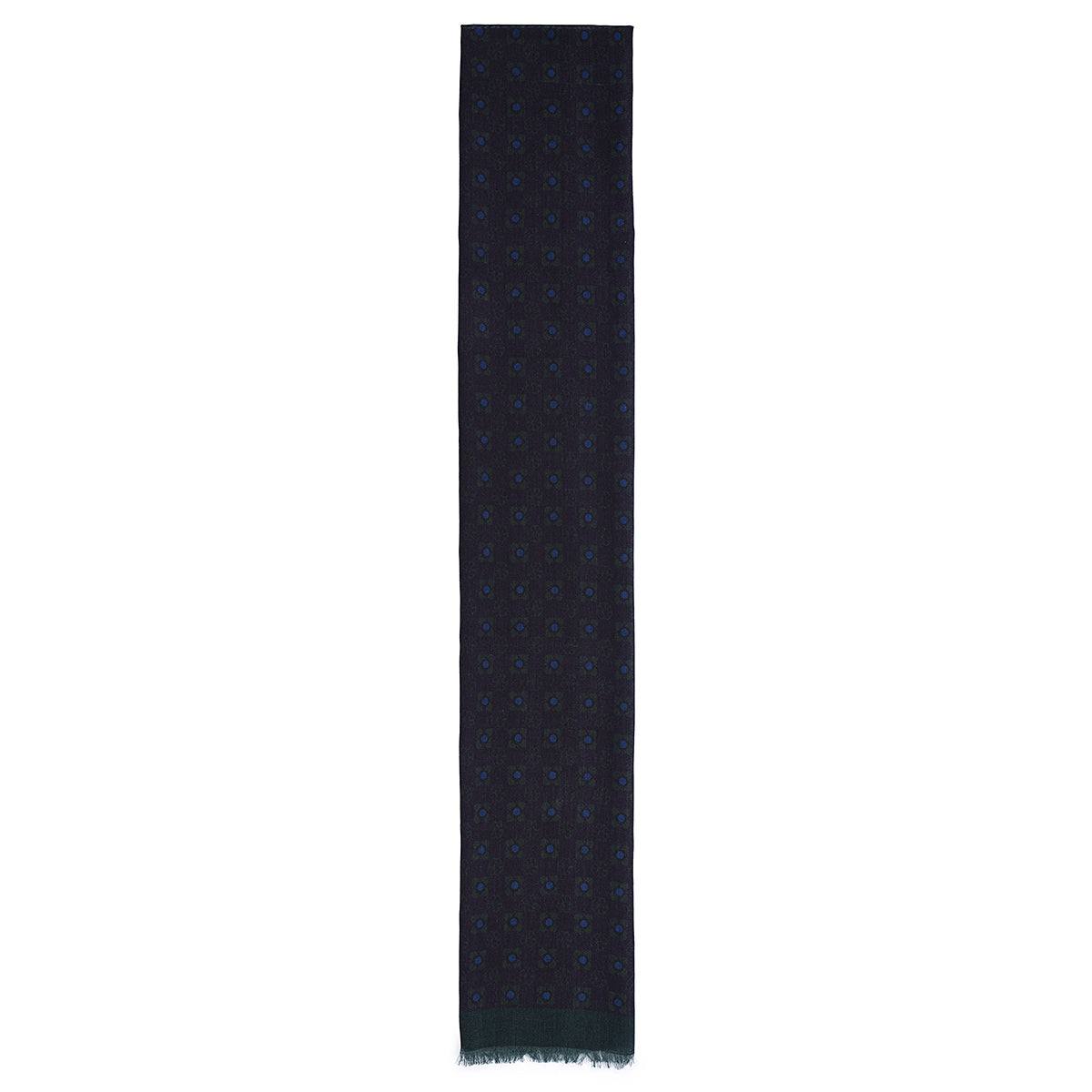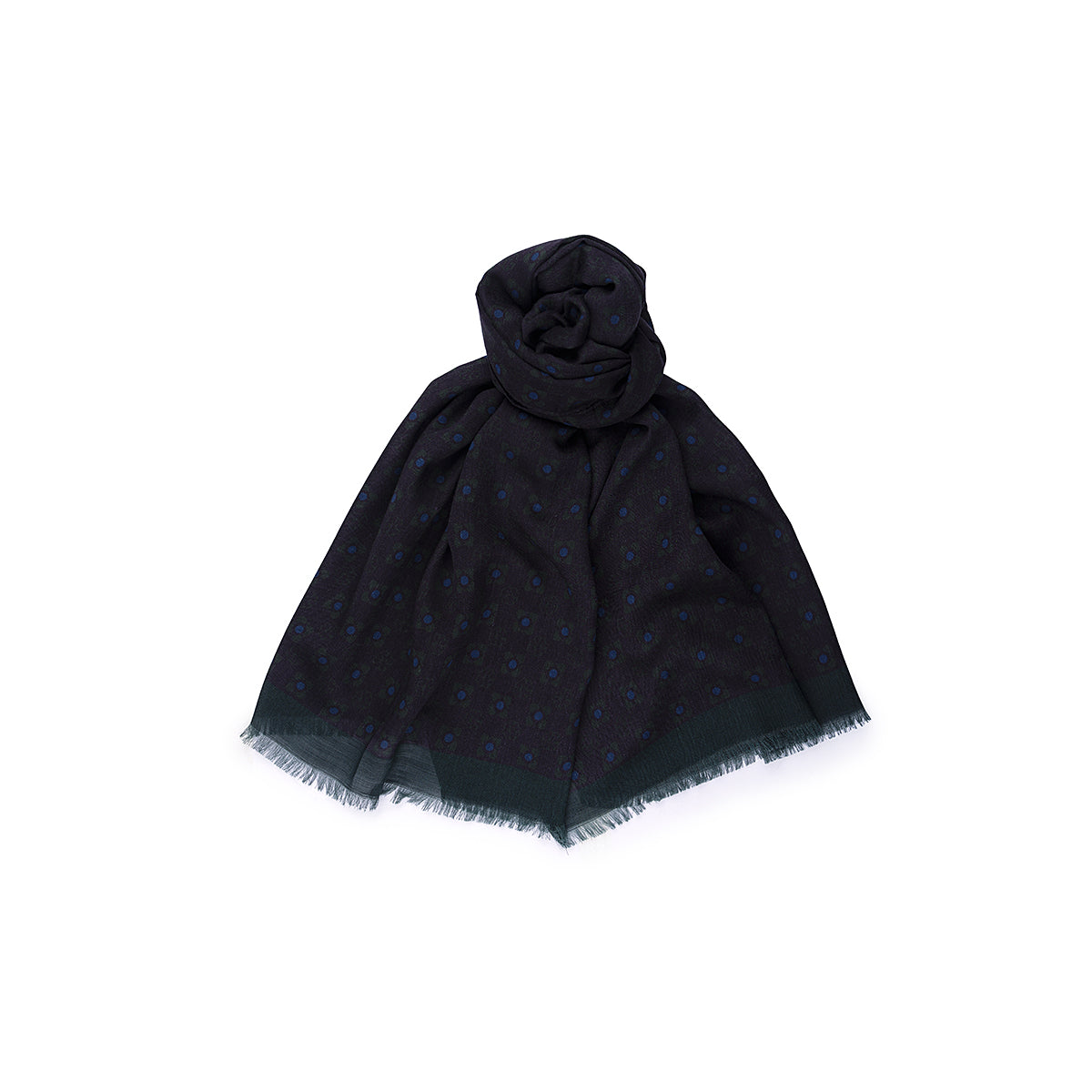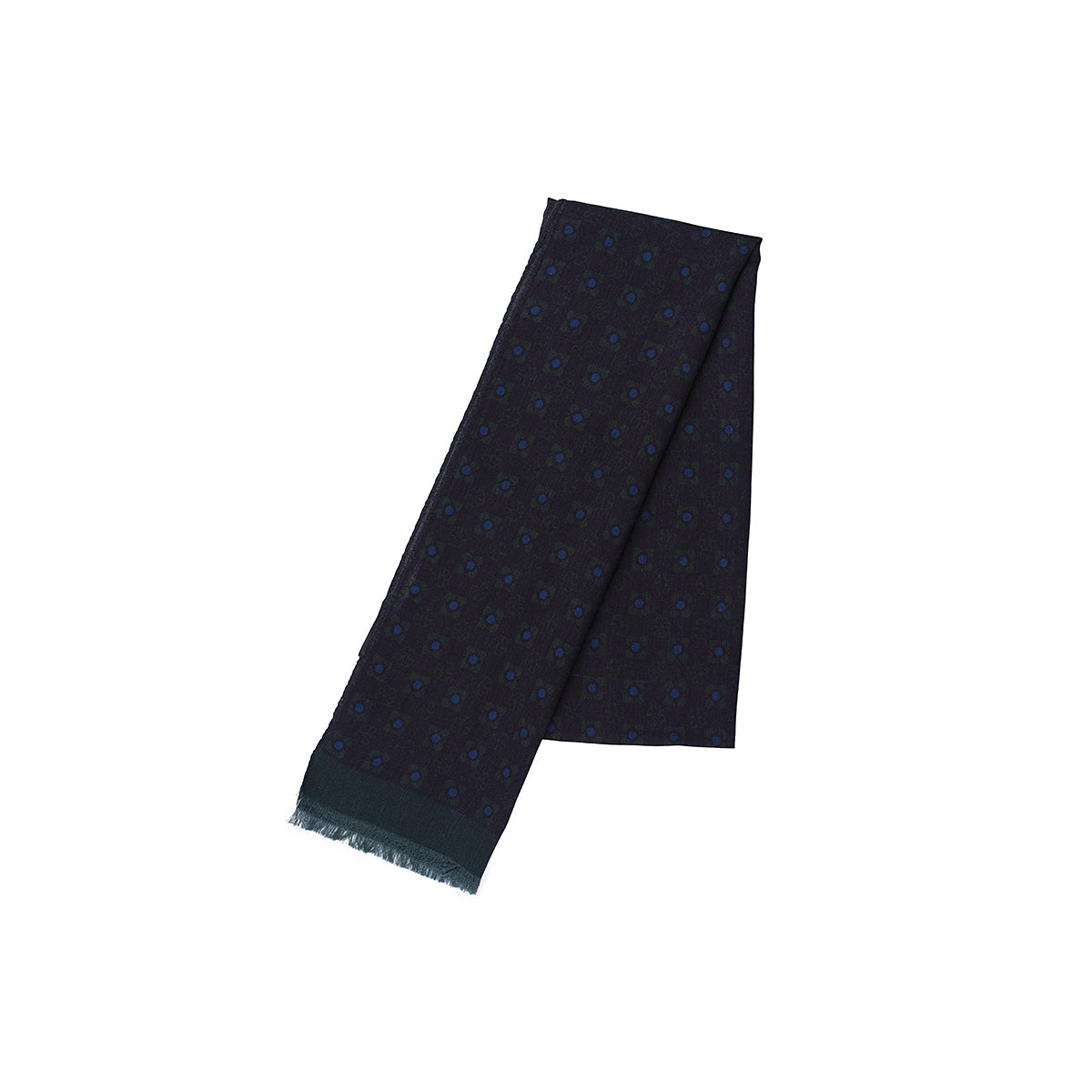 The cashmere and cotton with small fringe on the edge scarf is an accessory that combines the refinement of designs with original color combinations. Made with high quality fabrics, this scarf is a perfect accessory to refine your look. It stands out for the elegant print with a green and light blue geometric design on a blackboard background. A versatile accessory that completes formal attires and the sportiest outwear.