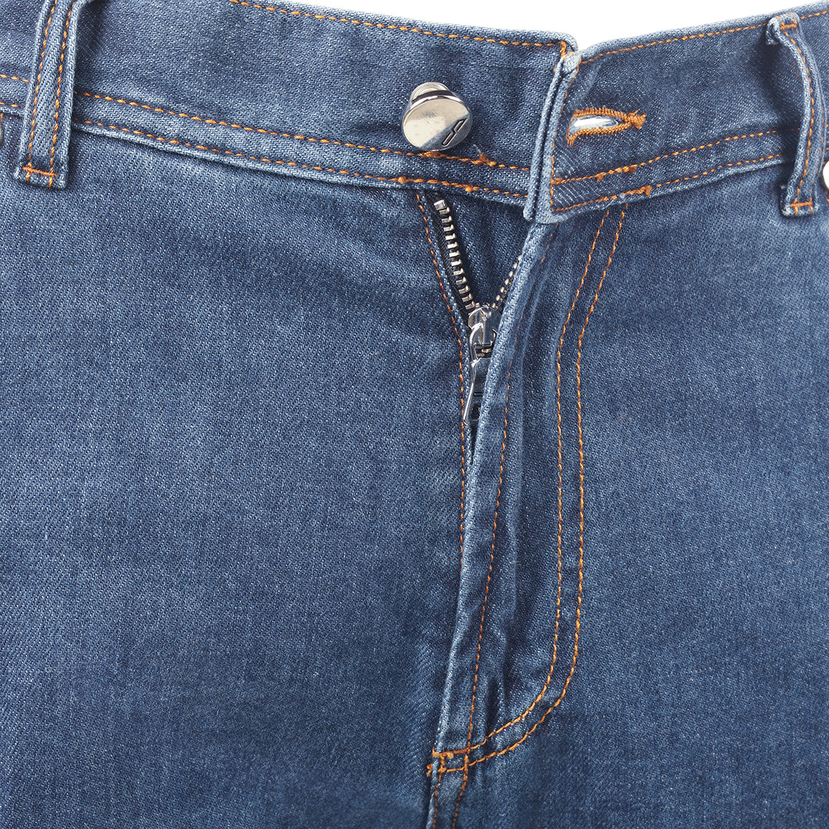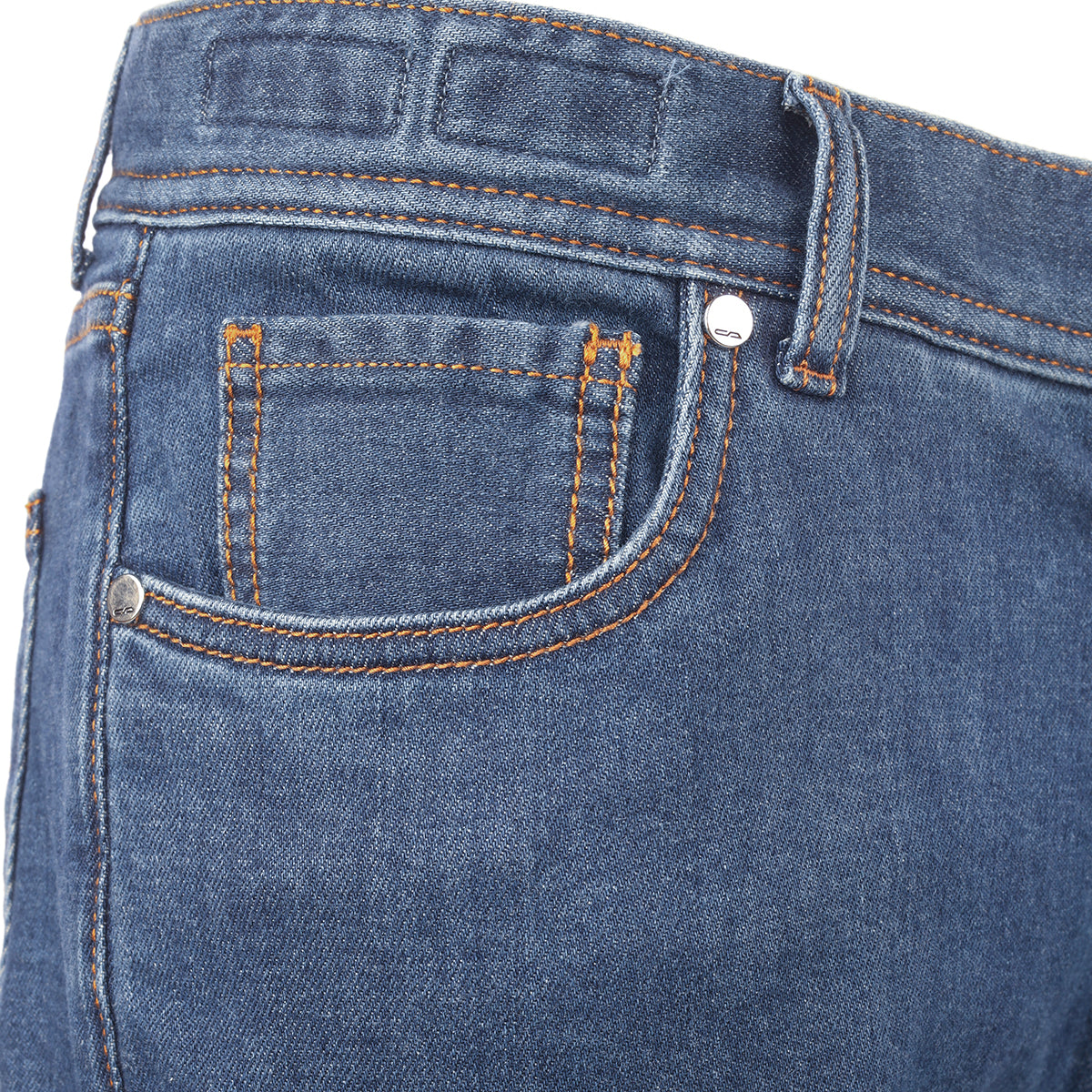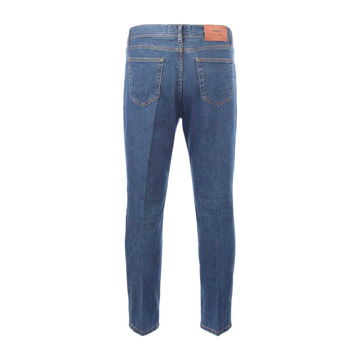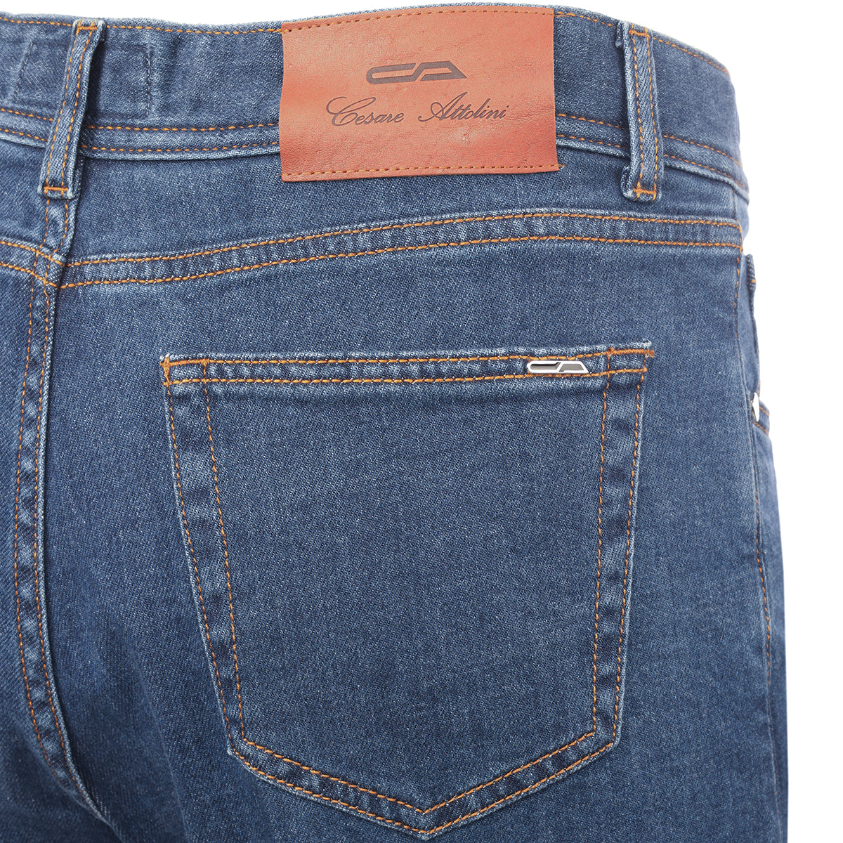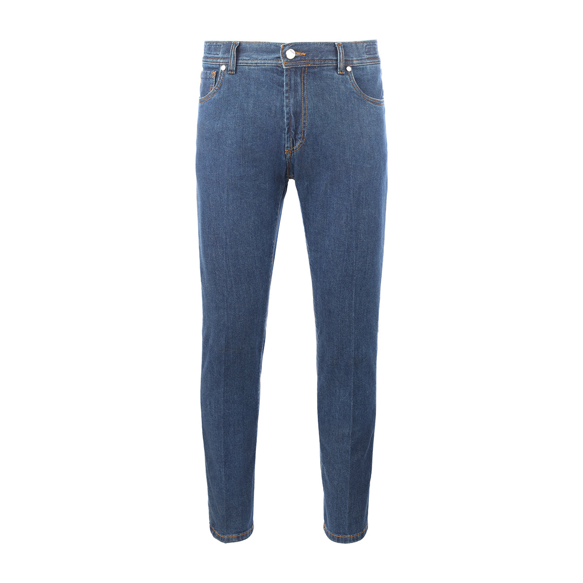 Five-pocket blue denim trousers.